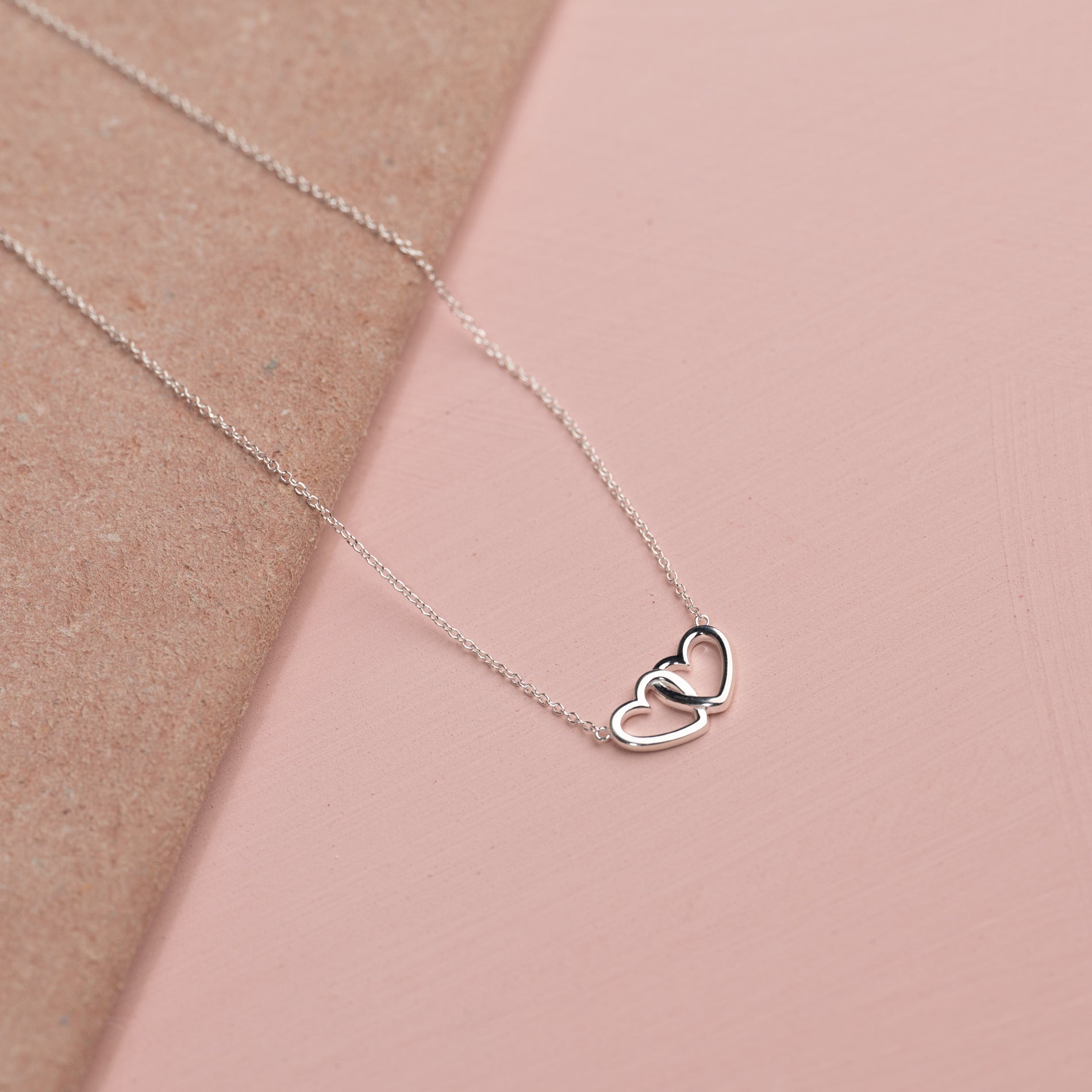 Hjertehalskjede i 100% resirkulert 925 sterlingsølv. Kjedet er designet med to sammenhengende hjerter som møtes på midten av kjedet. Disse to hjertene er loddet fast til hverandre, så de ikke beveger seg for mye frem og tilbake.