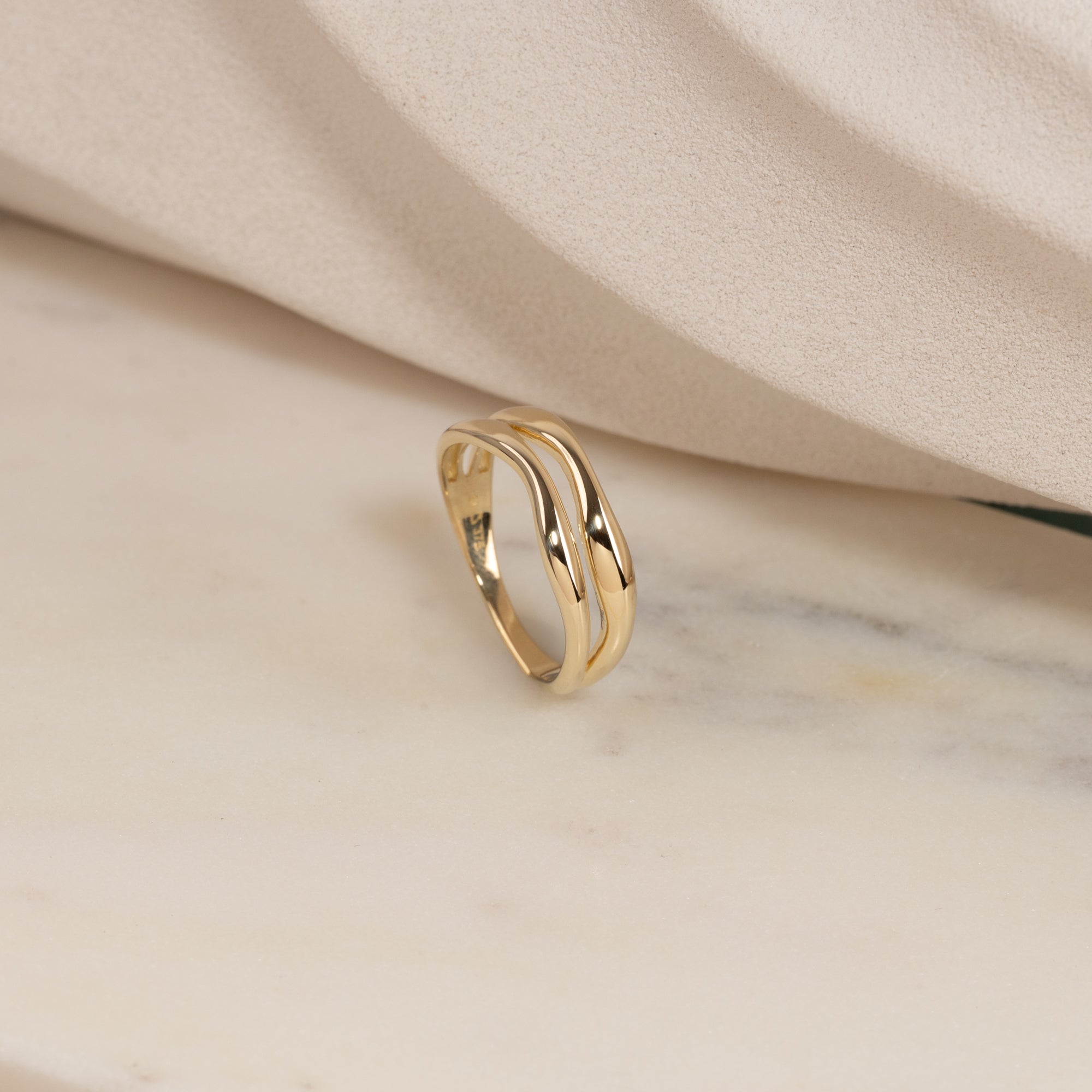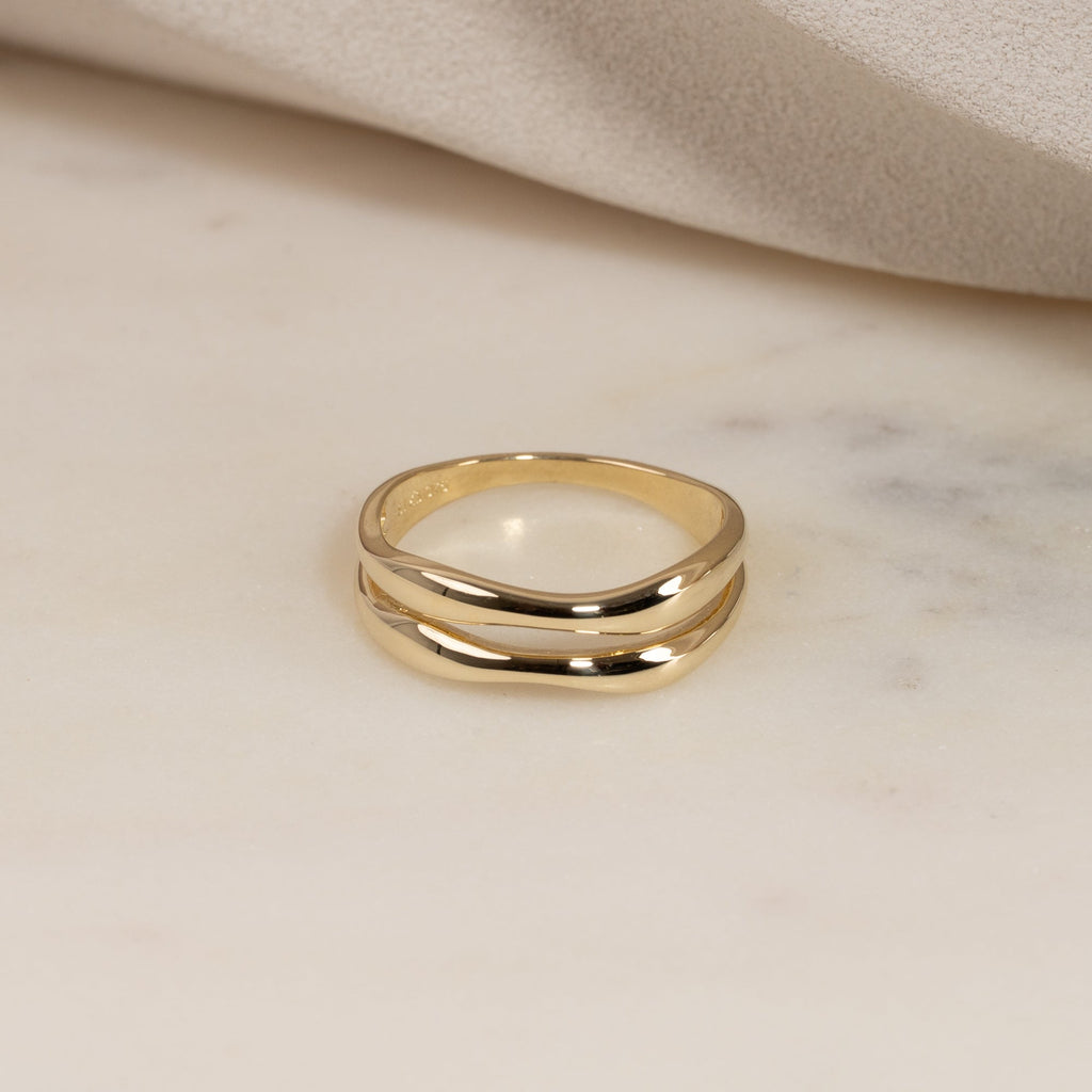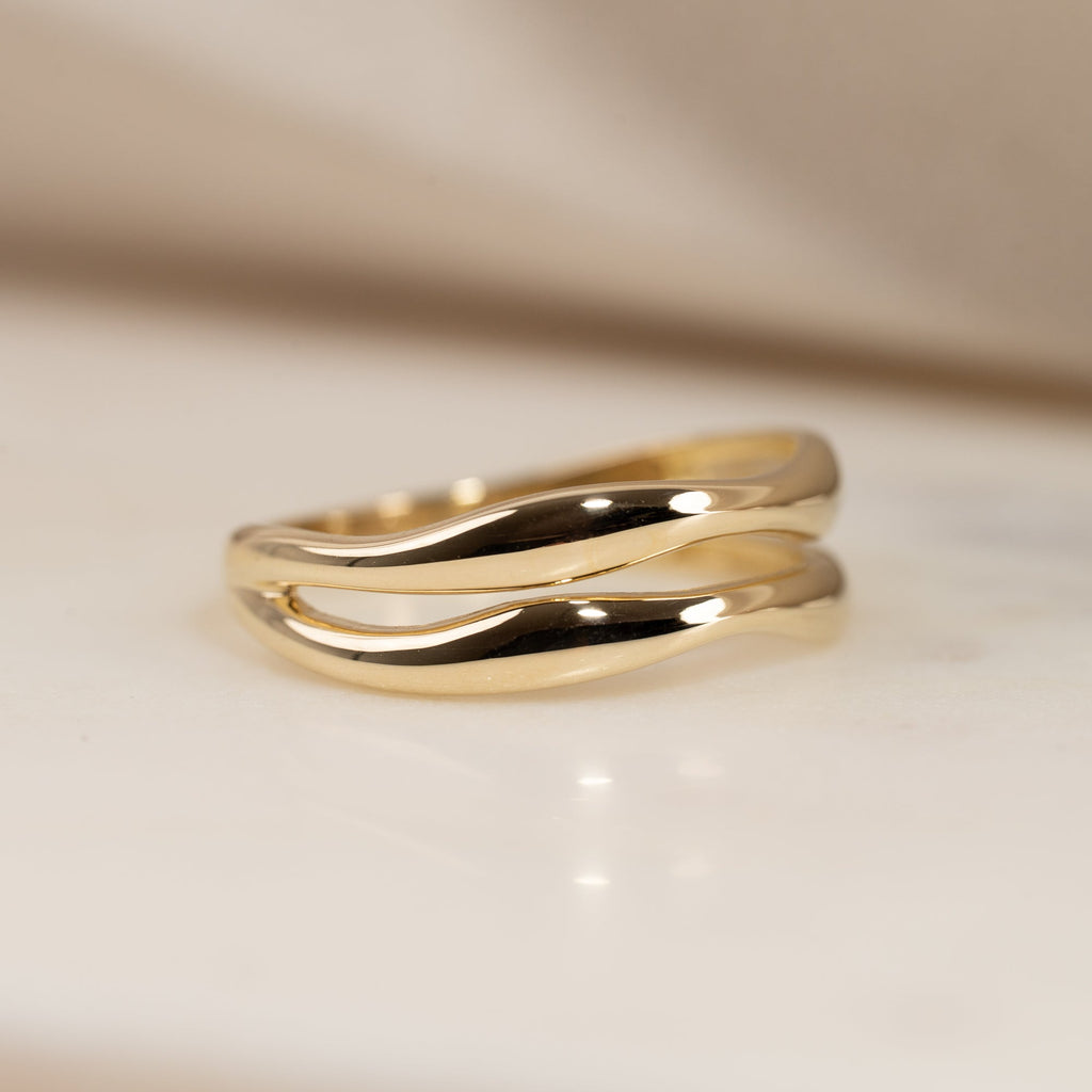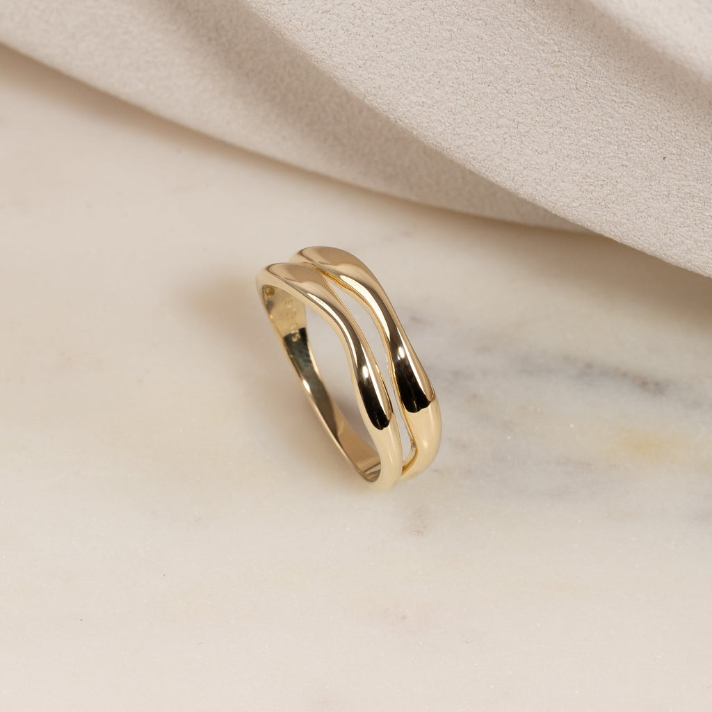 Ring i 100 % resirkulert 9 karat gull med et todelt design. De myke formene gir ringen et feminint og unikt uttrykk.