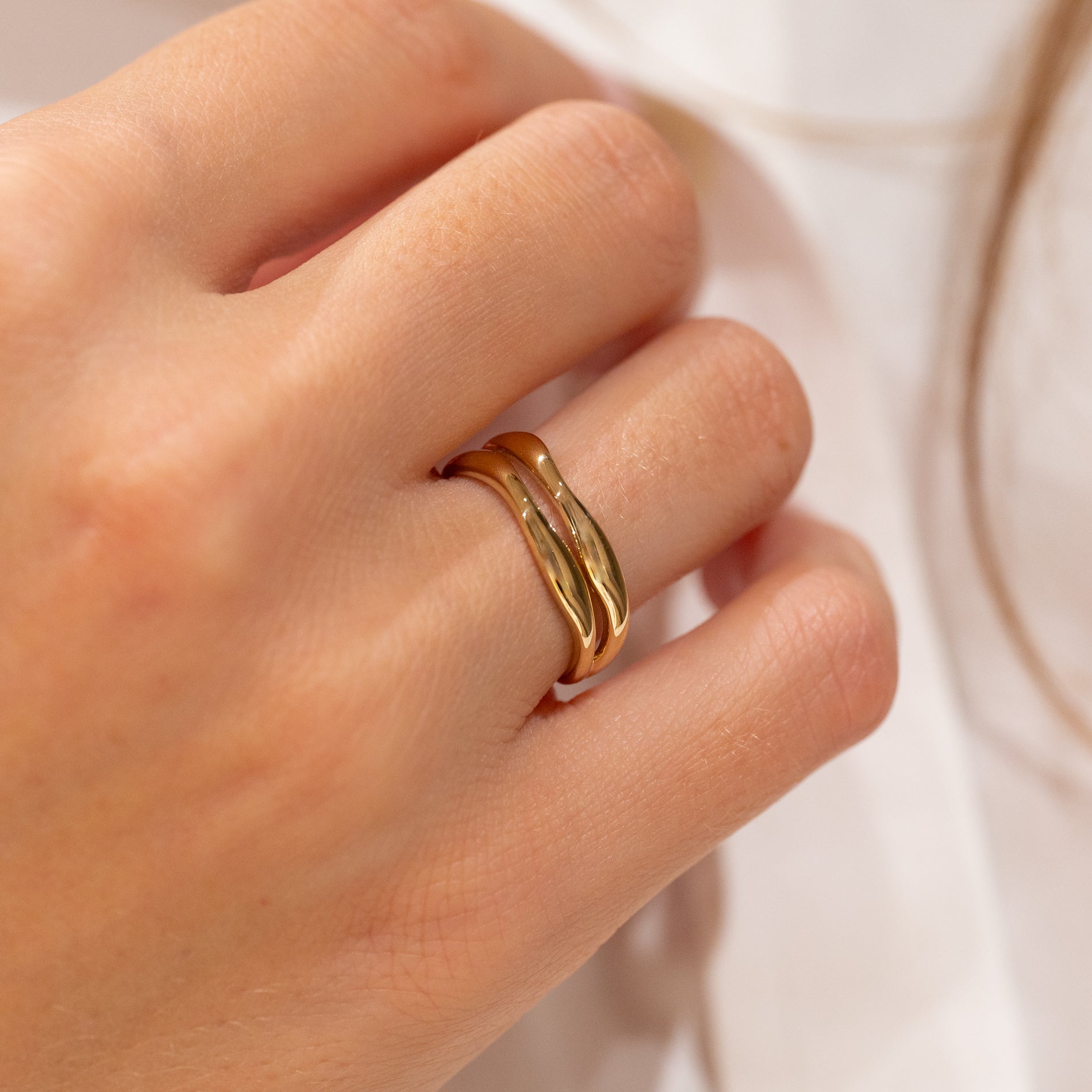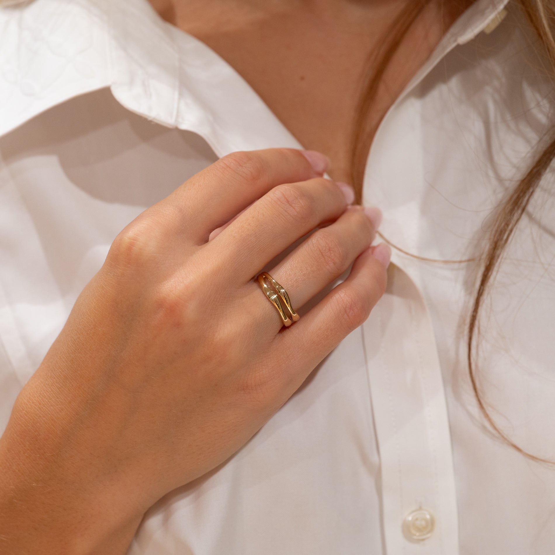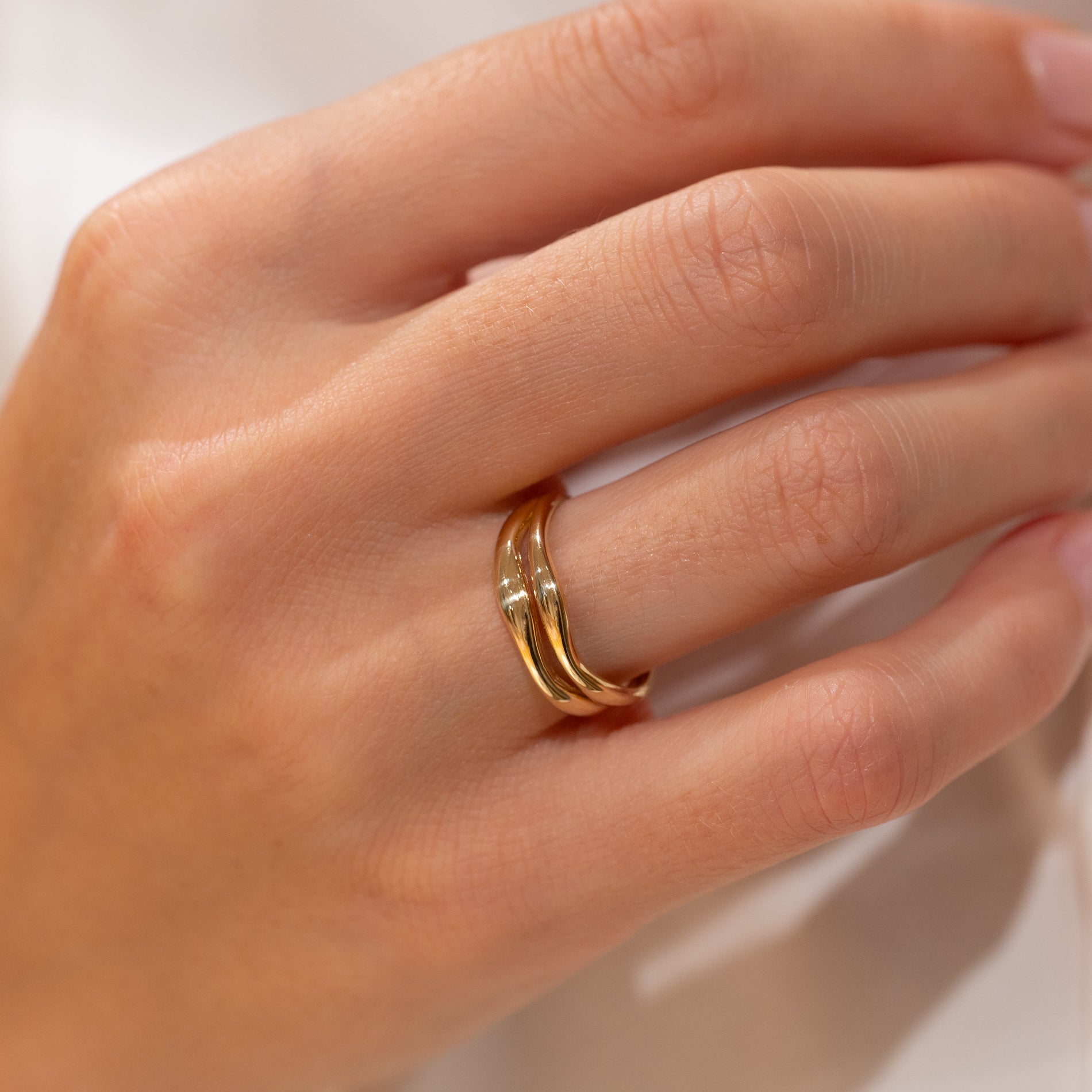 Ring i 100 % resirkulert 9 karat gull med et todelt design. De myke formene gir ringen et feminint og unikt uttrykk.