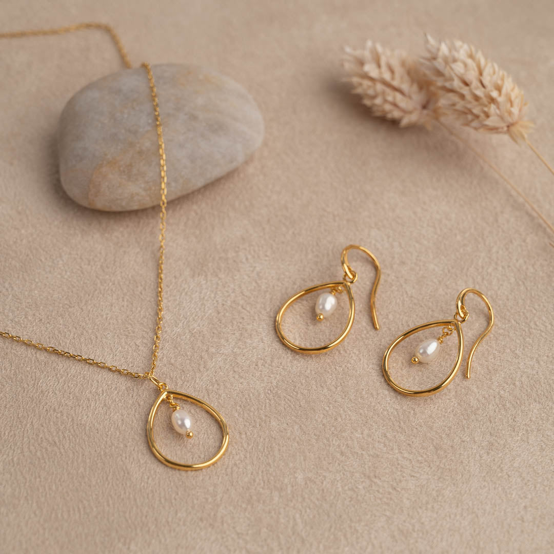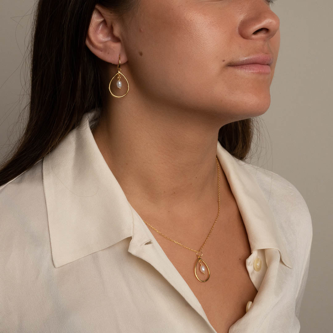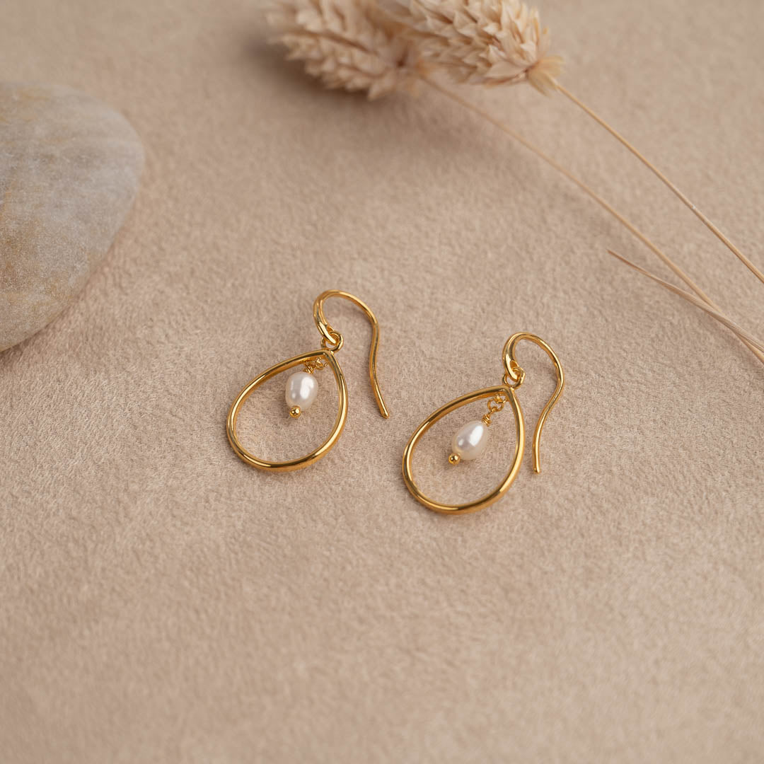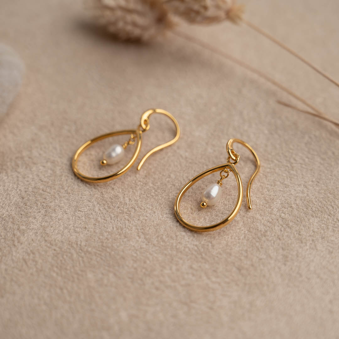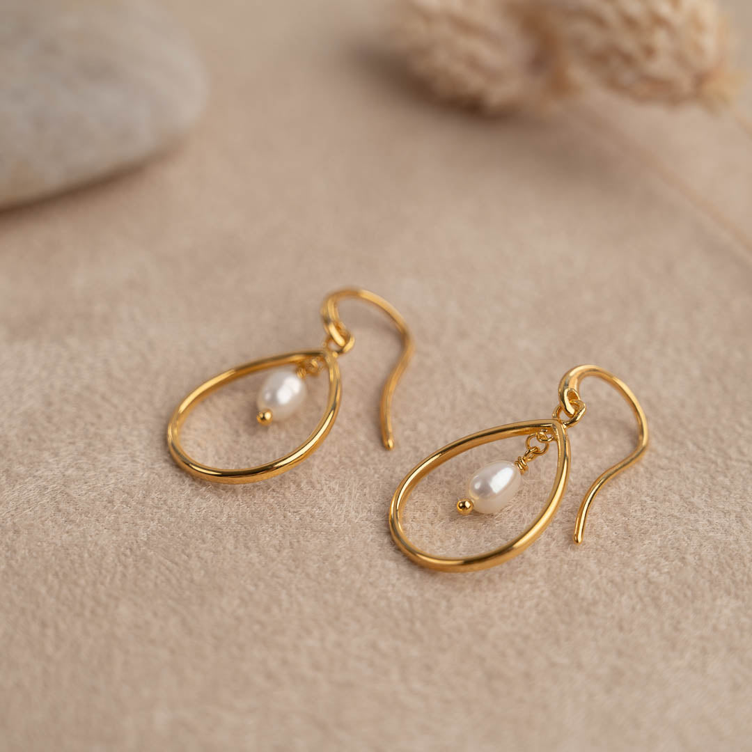 Våre øreringer Alexandra er laget av 100% resirkulert 18 karat forgylt sterlingsølv med en hvit ferskvannsperle. Øreringene er designet som et fint, dråpeformet anheng som omkranser den lille, hvite perlen. Uttrykket er tidløst, og på samme tid enkelt og elegant. Perfekt til utallige anledninger.