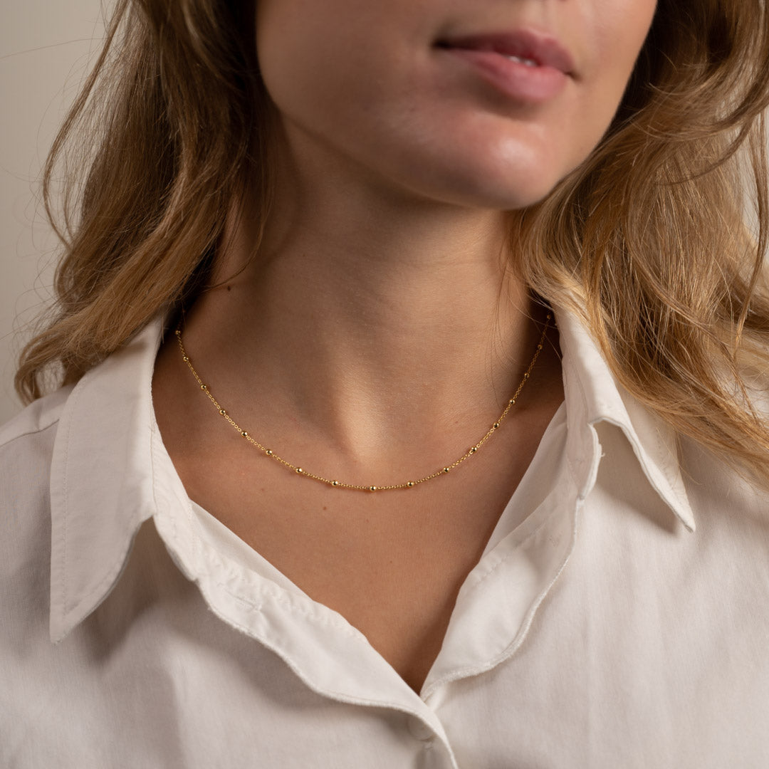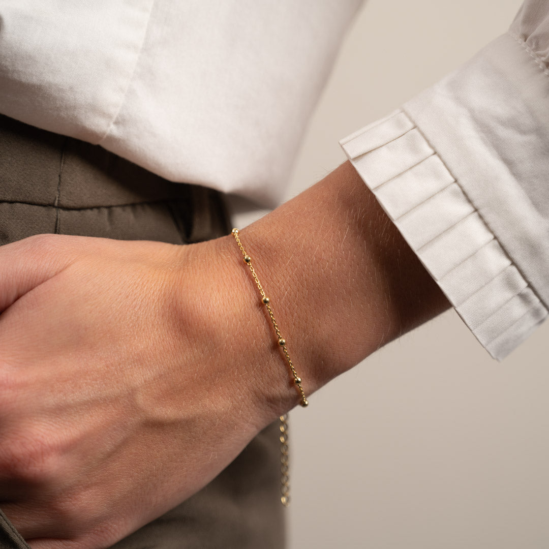 Vårt Alfa smykkesett er i 18 karat forgylt 925 sterlingsølv. Settet består av et armbånd og halskjede i matchende design.