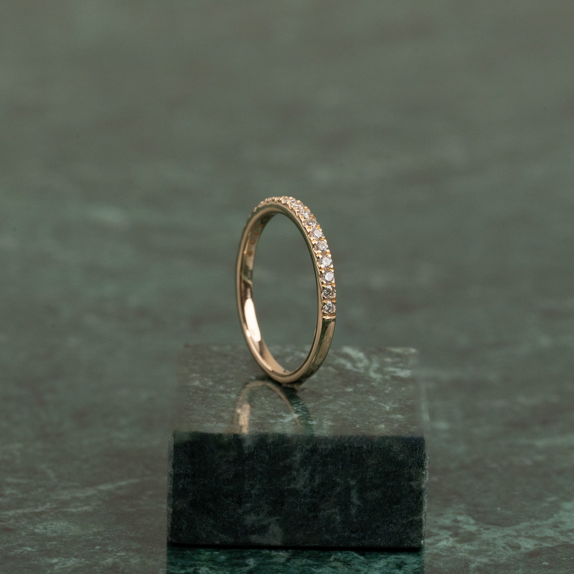 Ringen er laget med 18 lab-dyrkede diamanter. Diamantene har fargen E/F (River) og klarheten VVS. Smykket er laget med omtanke; diamantene er produsert med blant annet solenergi, og gullet er 100 % sertifisert resirkulert.