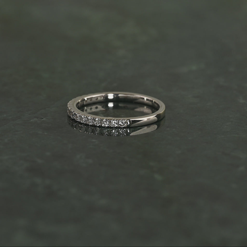 Alliansering i hvitt gull med en rekke lab-dyrkede diamanter (i alt 0,25 ct.) på øvre halvdel av skinnen. Ringen er et klassisk og tidløst smykke som er enkelt og trygt å ha på seg - selv i en aktiv hverdag.