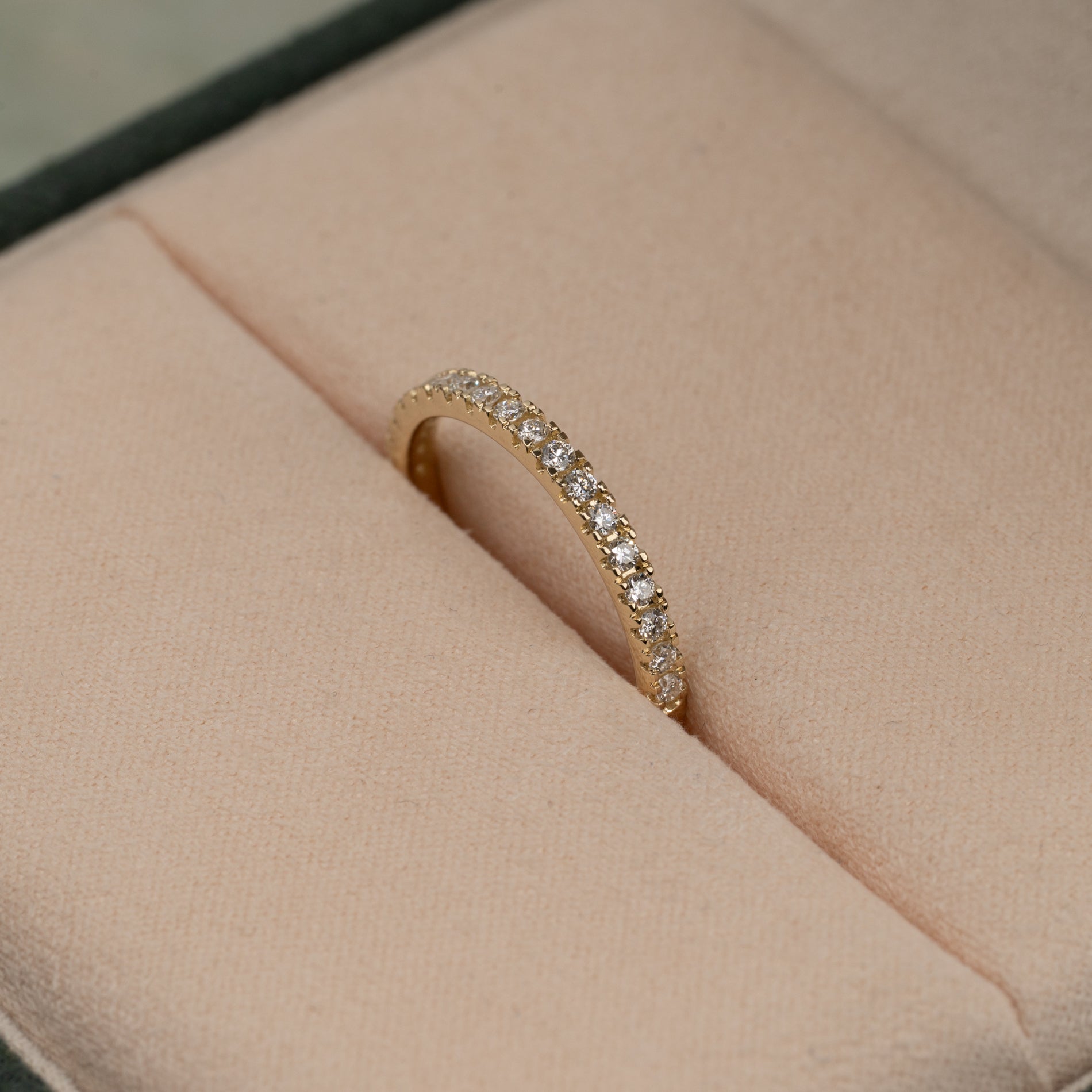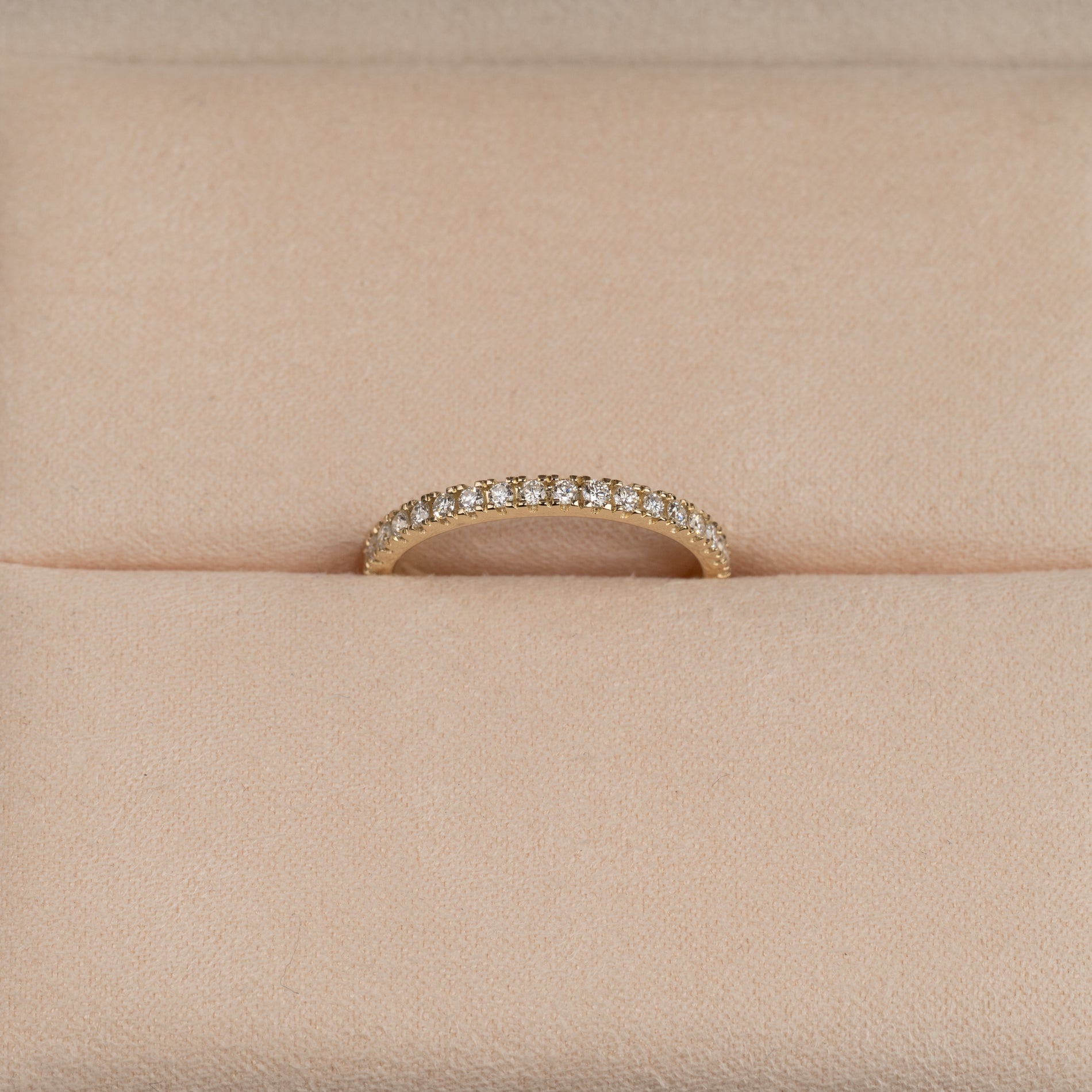 Alliansering i gull med en rekke lab-dyrkede diamanter (totalt 0,25 ct.) på øvre halvdel av skinnen. Ringen er et klassisk og tidløst smykke som er enkelt og trygt å ha på seg - selv i en aktiv hverdag.