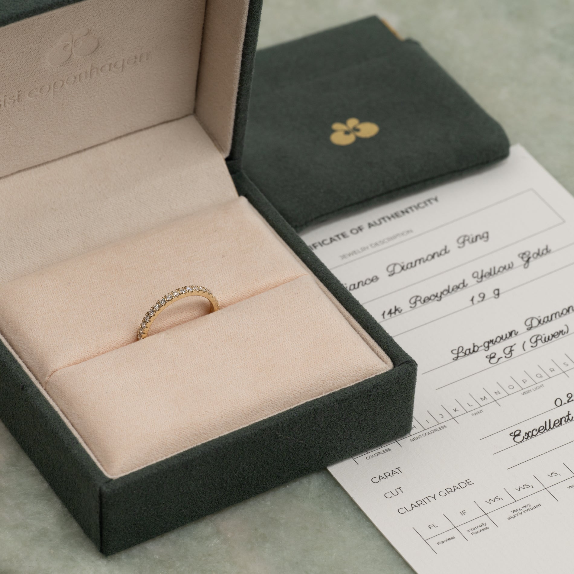 Ringen er laget i 14 karat massivt gull med 18 lab-dyrkede diamanter med en totalvekt på 0,25 ct. Diamantene har fargen E/F (River) og klarheten VVS. Smykket er laget med omtanke; diamantene er produsert med blant annet solenergi, og gullet er 100 % sertifisert resirkulert.