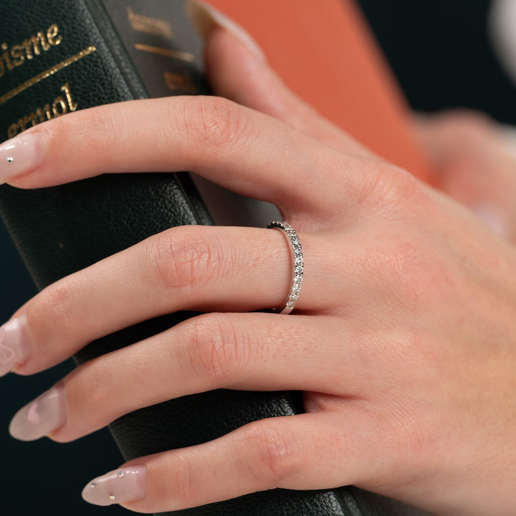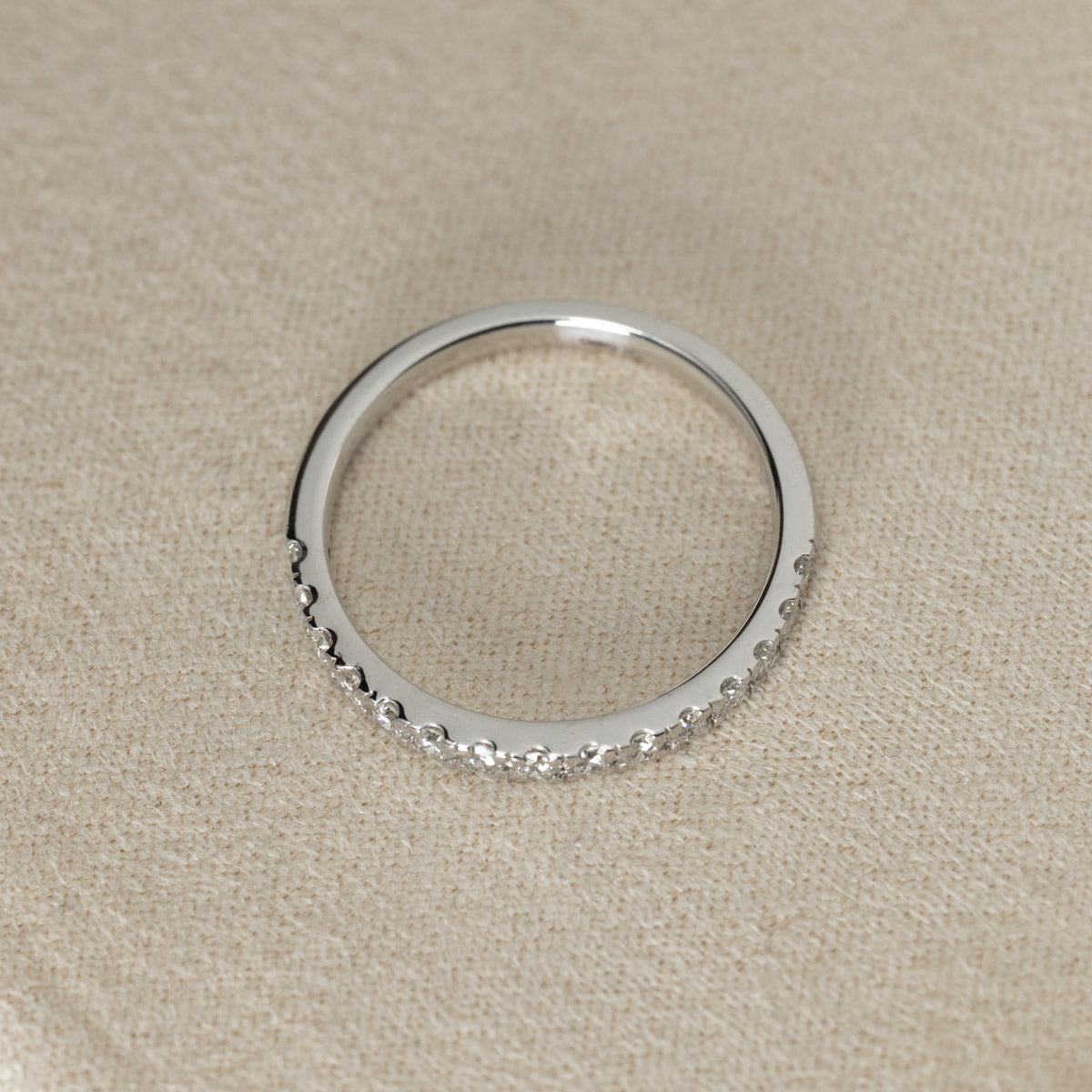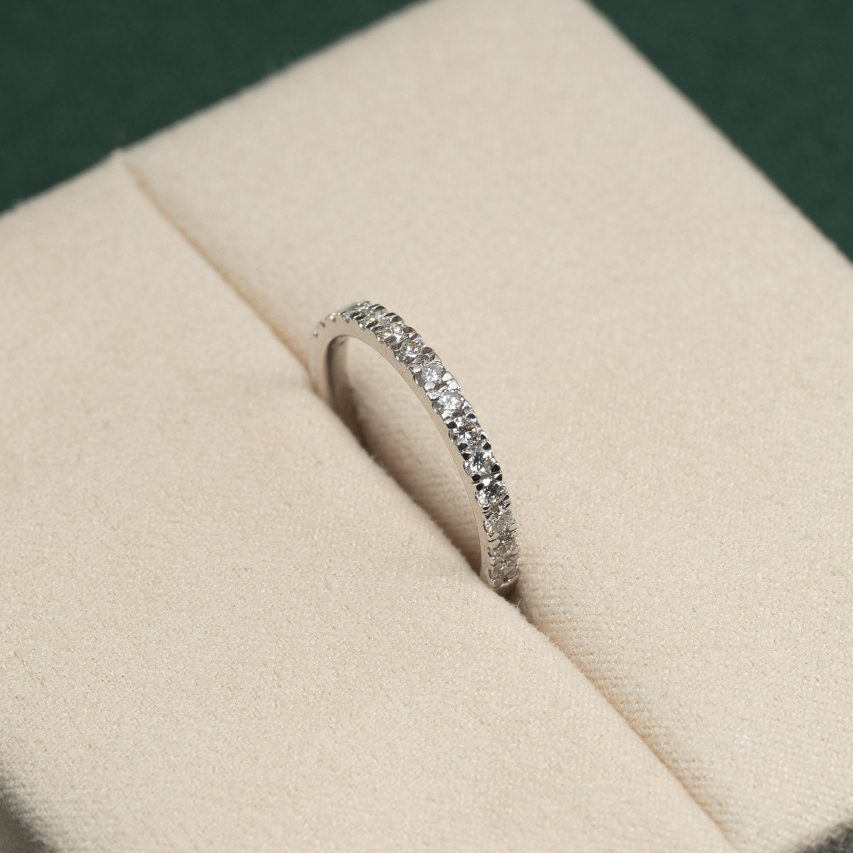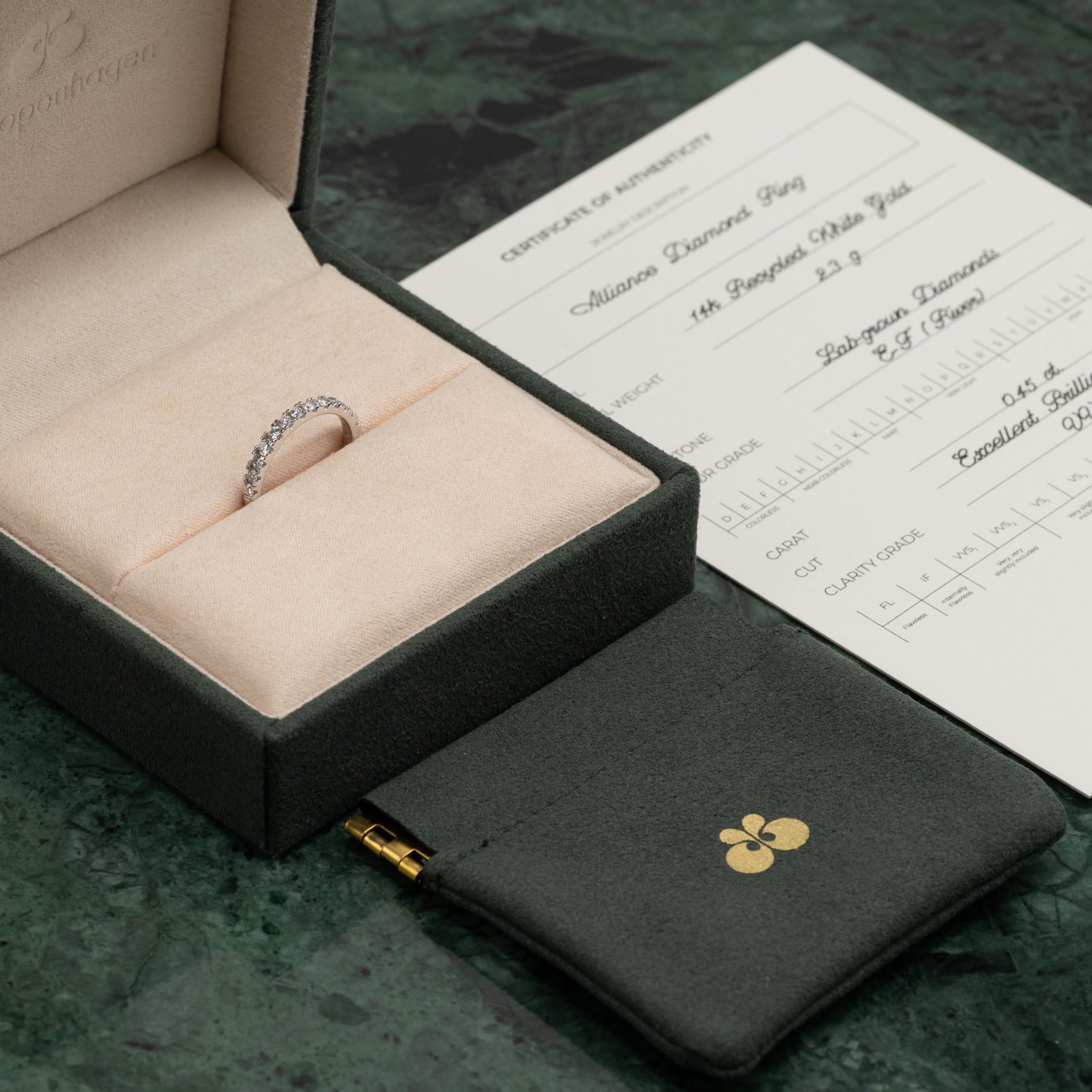 Alliansering med en lang rekke lab-dyrkede diamanter (totalt 0,45 ct.) langs den øvre halvdelen av ringenskinnen. Ringen er et klassisk og tidløst smykke som er en sikker vinner, også i hverdagen.
