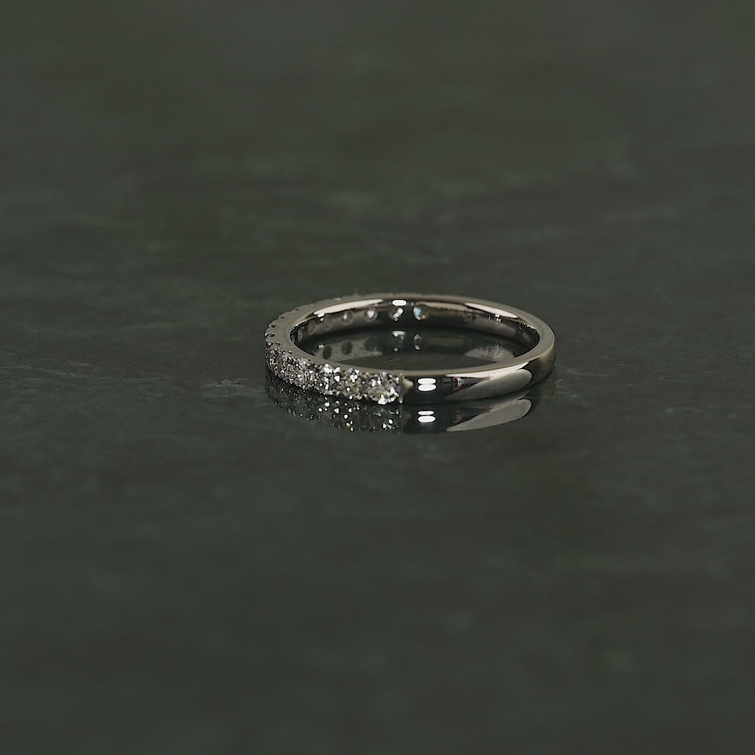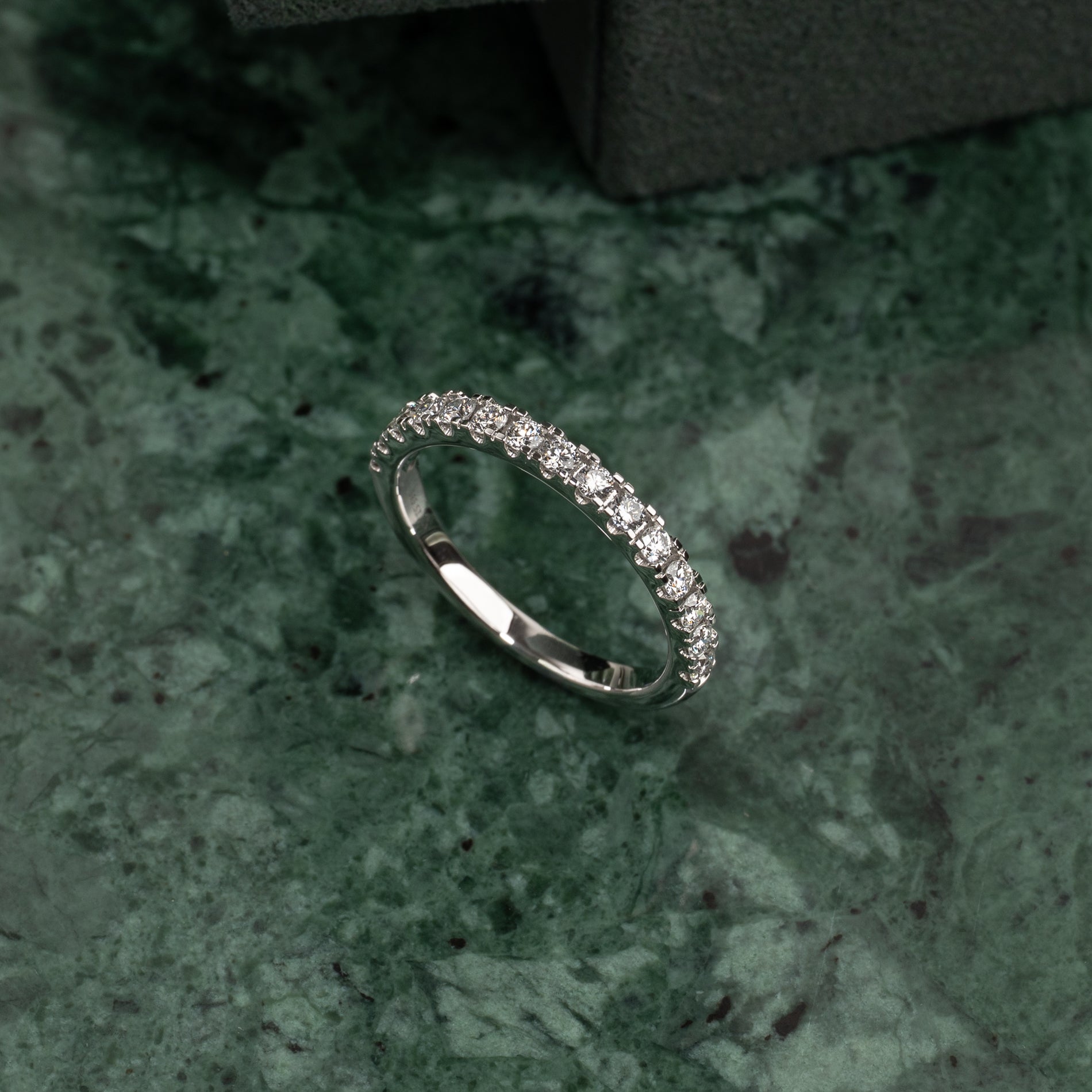 Ringen er laget i 14 karat massivt hvittgull med 15 lab-grown diamanter, og har en total vekt på 0,45 ct. Diamantene har fargen E/F (River) og klarhet VVS. Smykket er laget med omtanke; diamantene er produsert med blant annet solenergi, og gullet er 100 % sertifisert resirkulert.