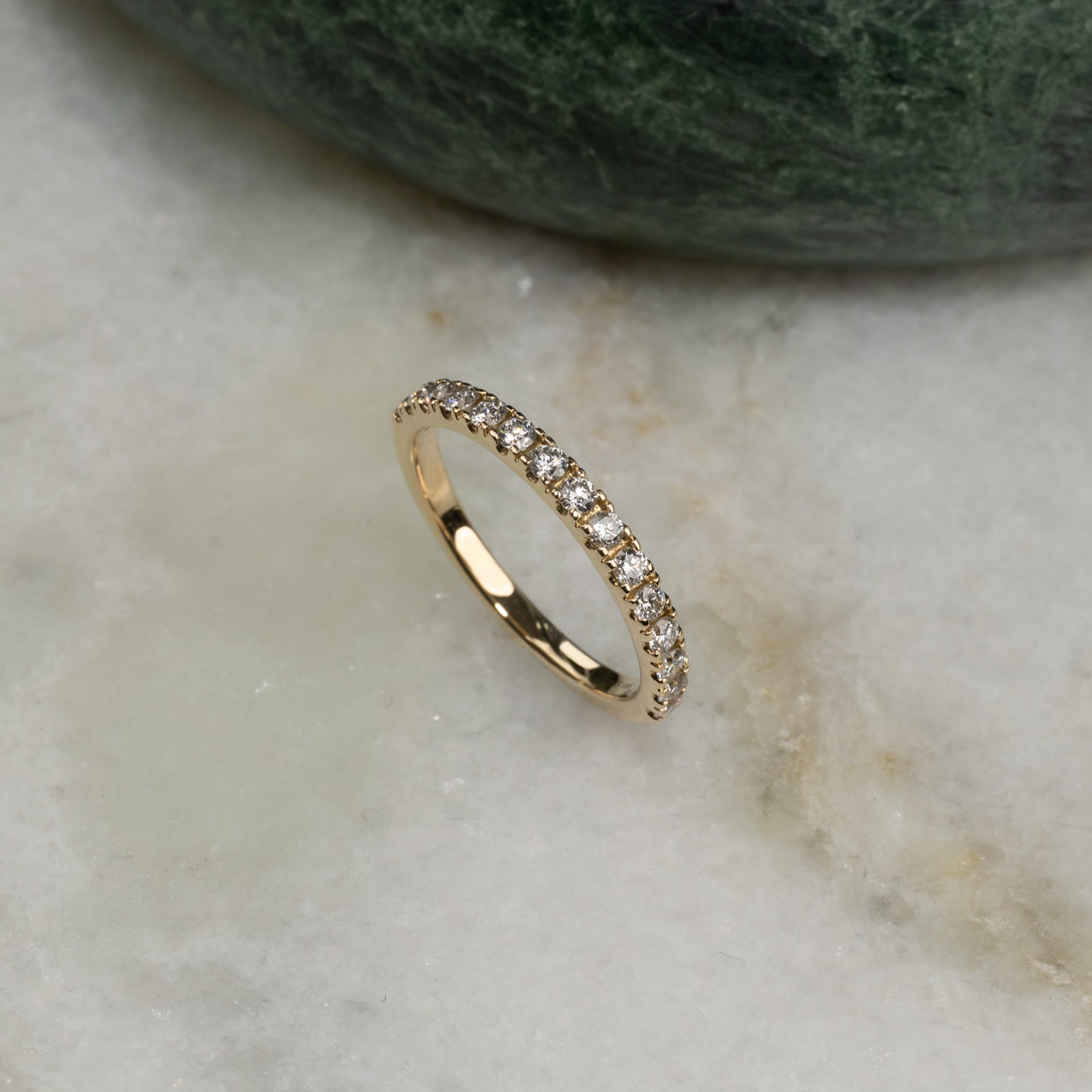 Ringen er laget i 14 karat massivt gull med 15 lab-grown diamanter, og har en total vekt på 0,45 ct. Diamantene har fargen E/F (River) og klarhet VVS. Smykket er laget med omtanke; diamantene er produsert med blant annet solenergi, og gullet er 100 % sertifisert resirkulert.