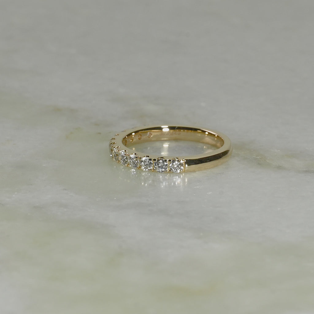 Allianseringen er laget i 14 karat gull med 12 lab-grown diamanter som sammen er 0,7 carat. Materialene gjør ringen lett og fin å bære, selv i en travel hverdag.