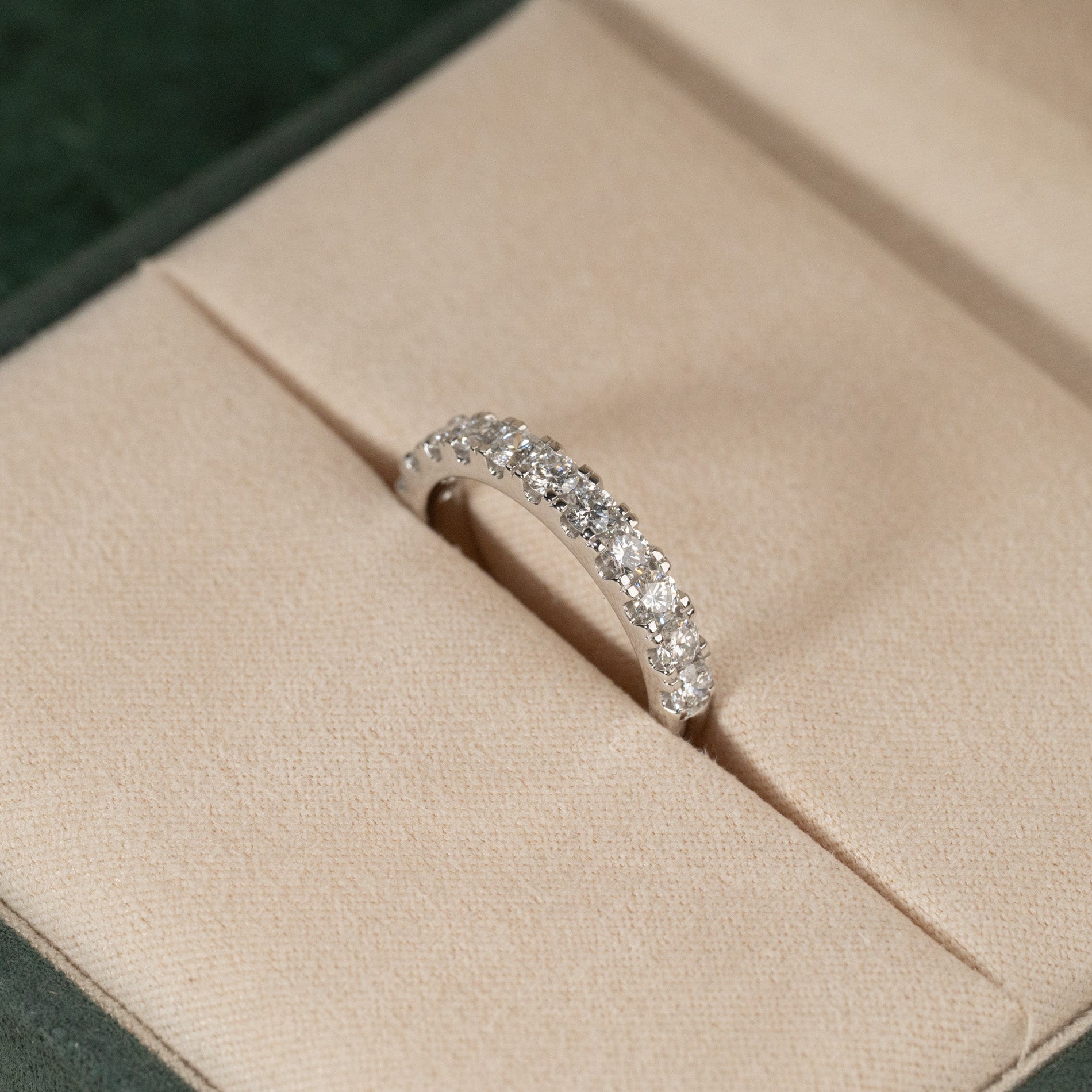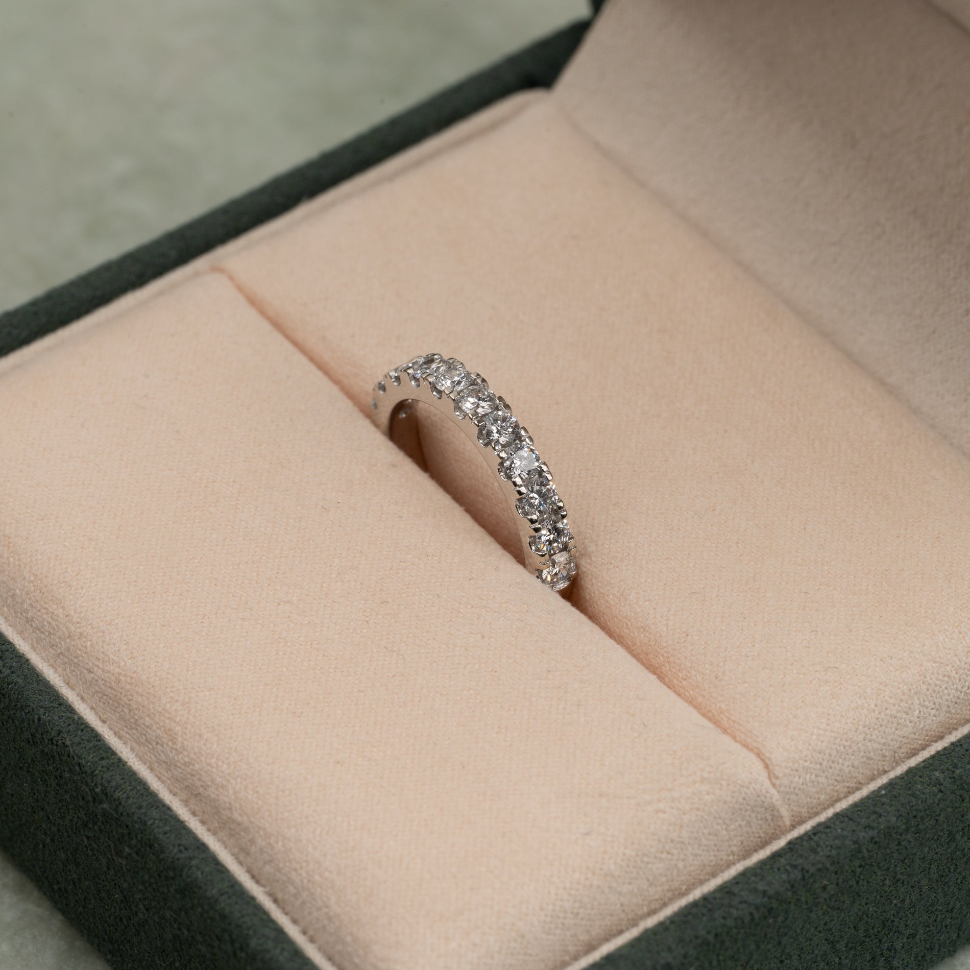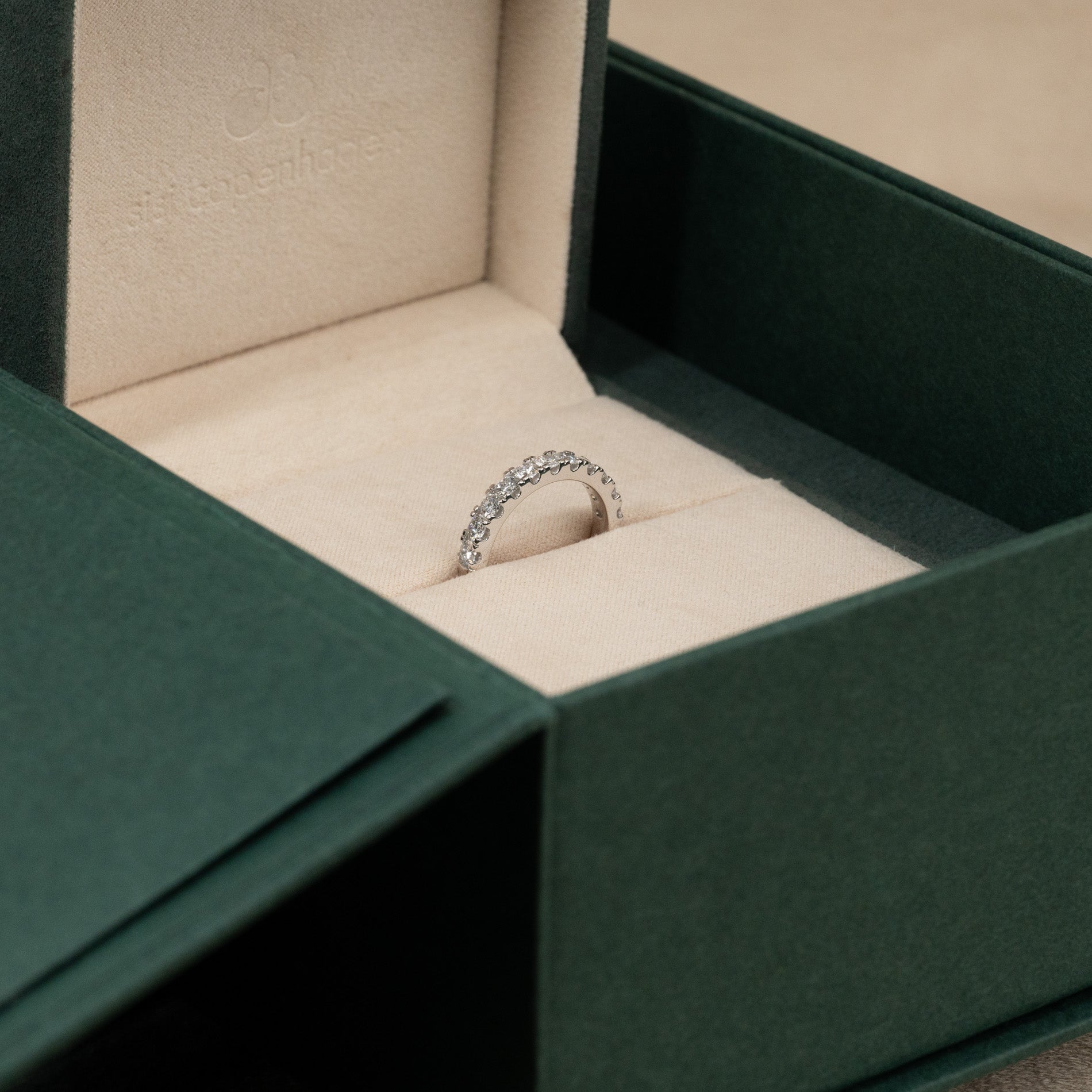 Allianseringen er laget i 14 karat hvitt gull med 11 lab-grown diamanter som sammen er 1,0 carat i den øvre delen av ringskinnen. Materialene gjør ringen lett og fin å bære, selv i en travel hverdag.