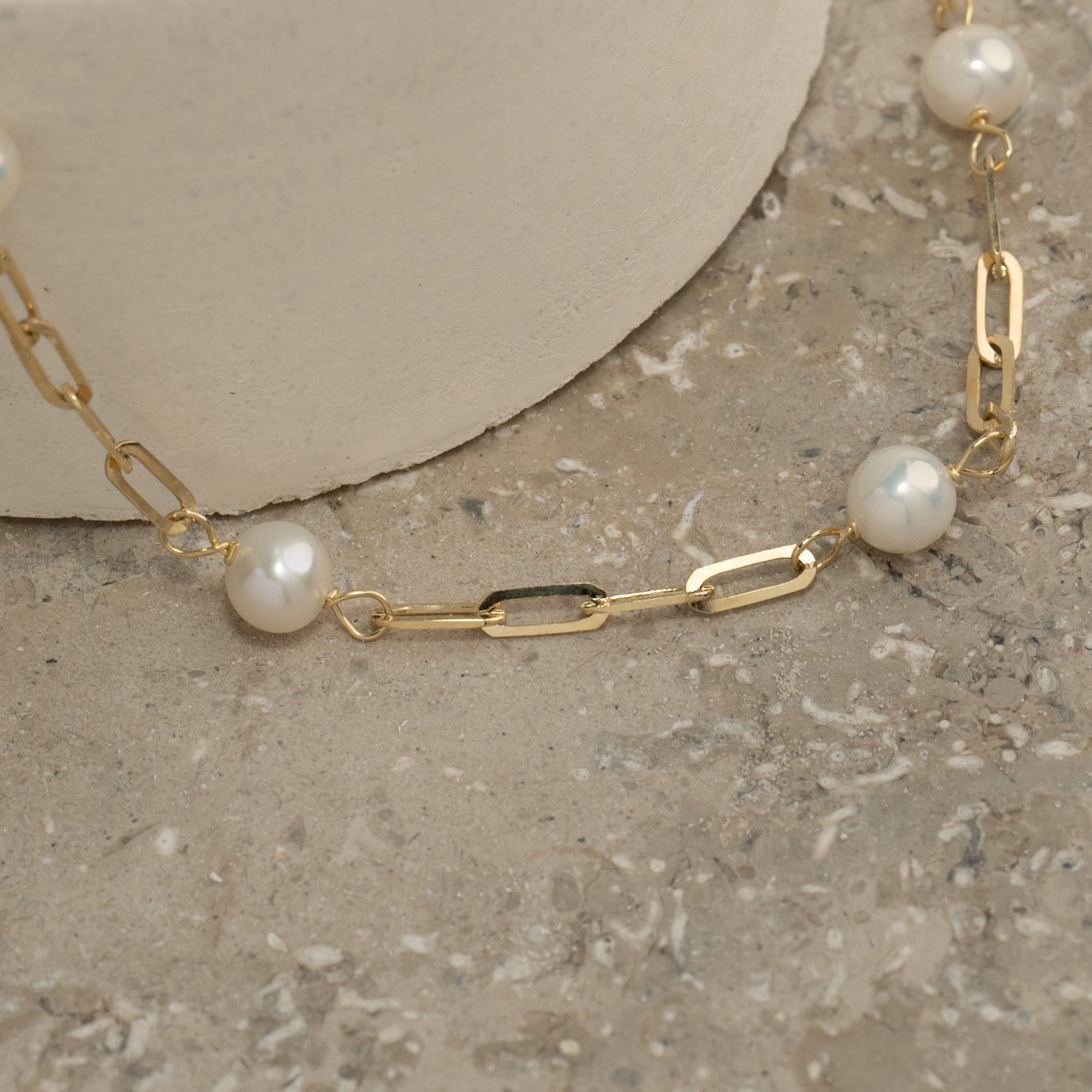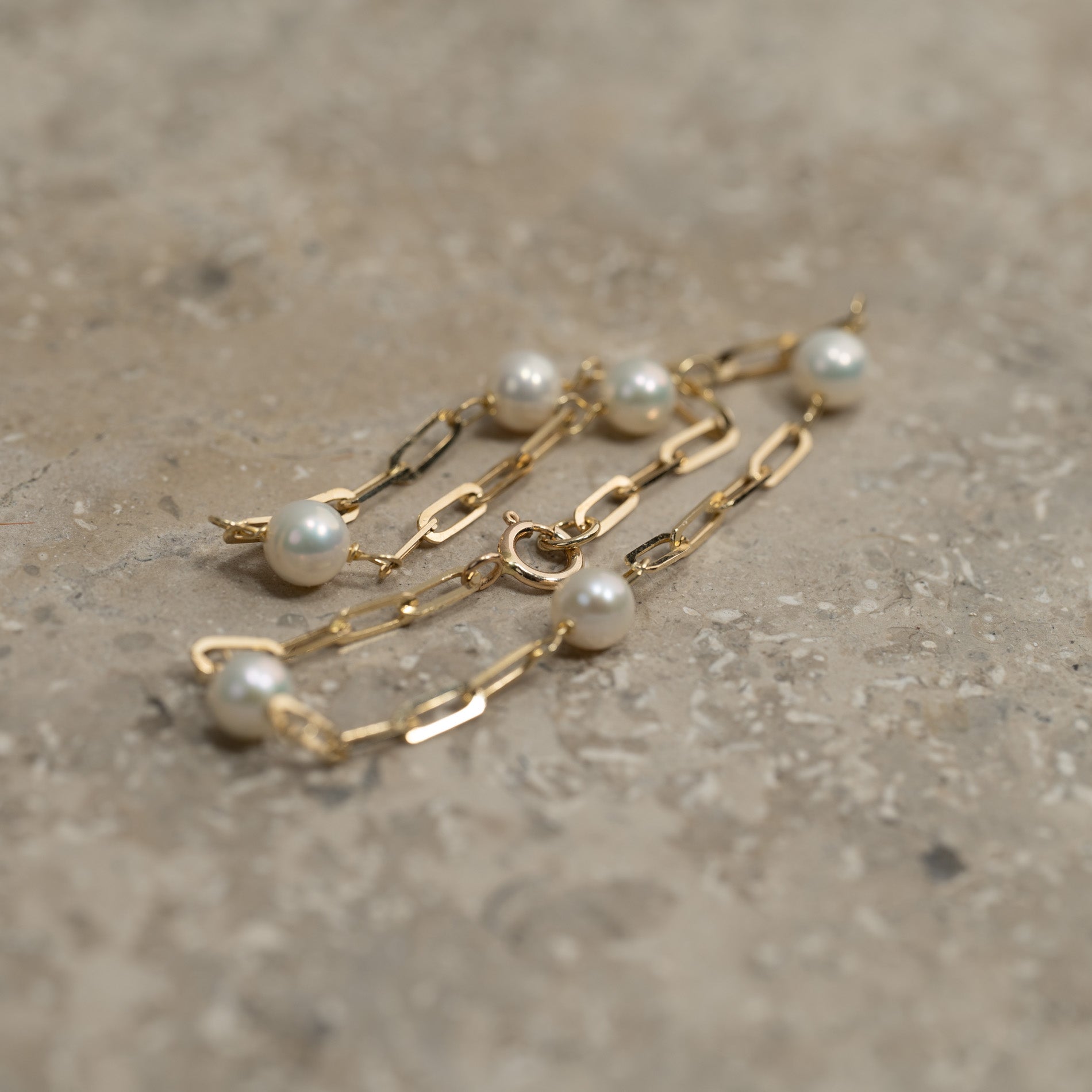 Armbånd laget i 100 % resirkulert massivt 9 kt gull med runde hvite ferskvannsperler.
