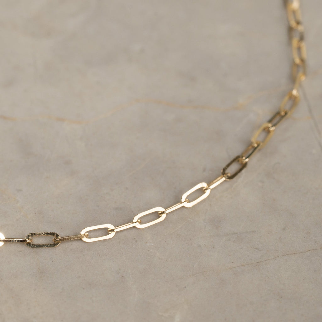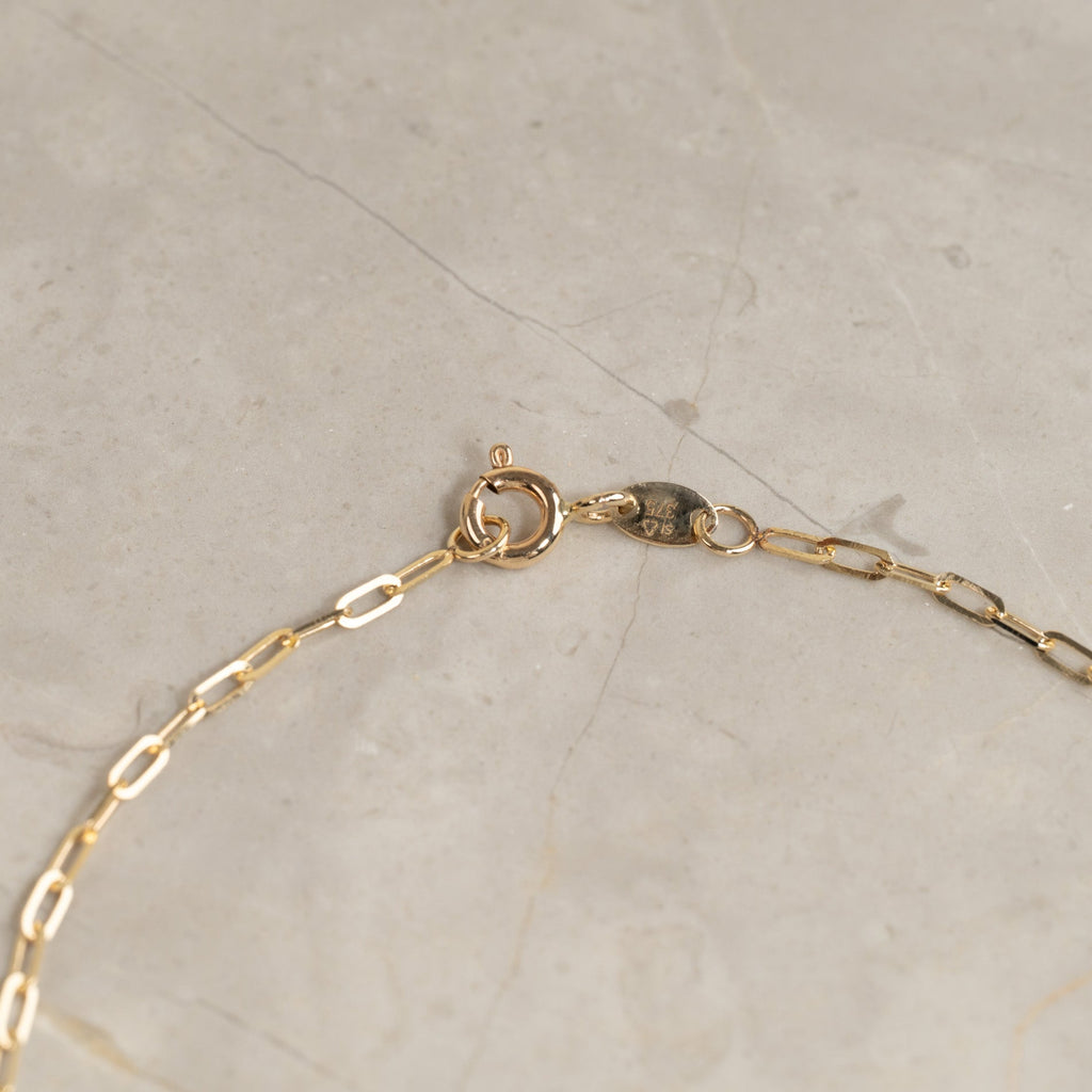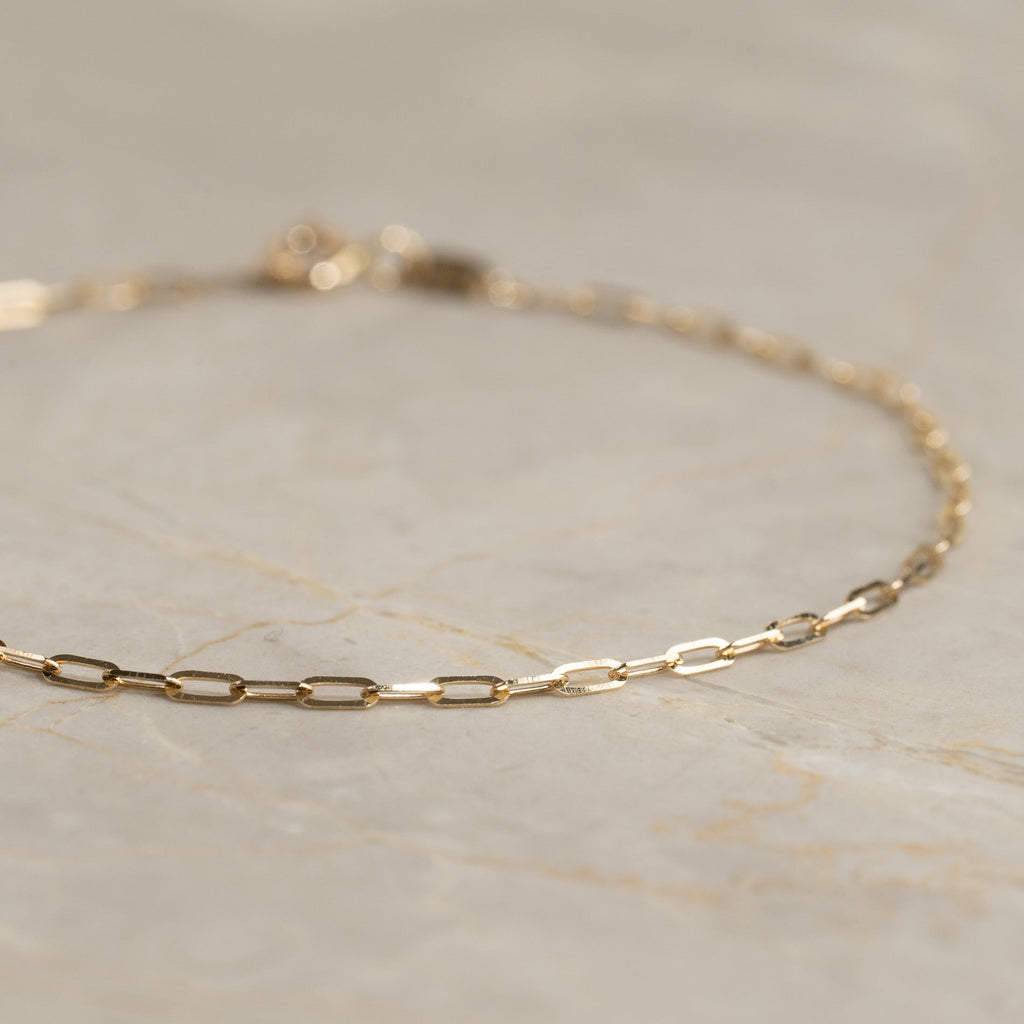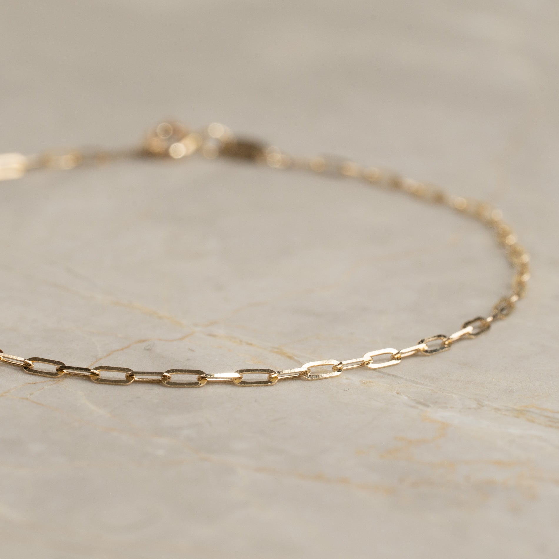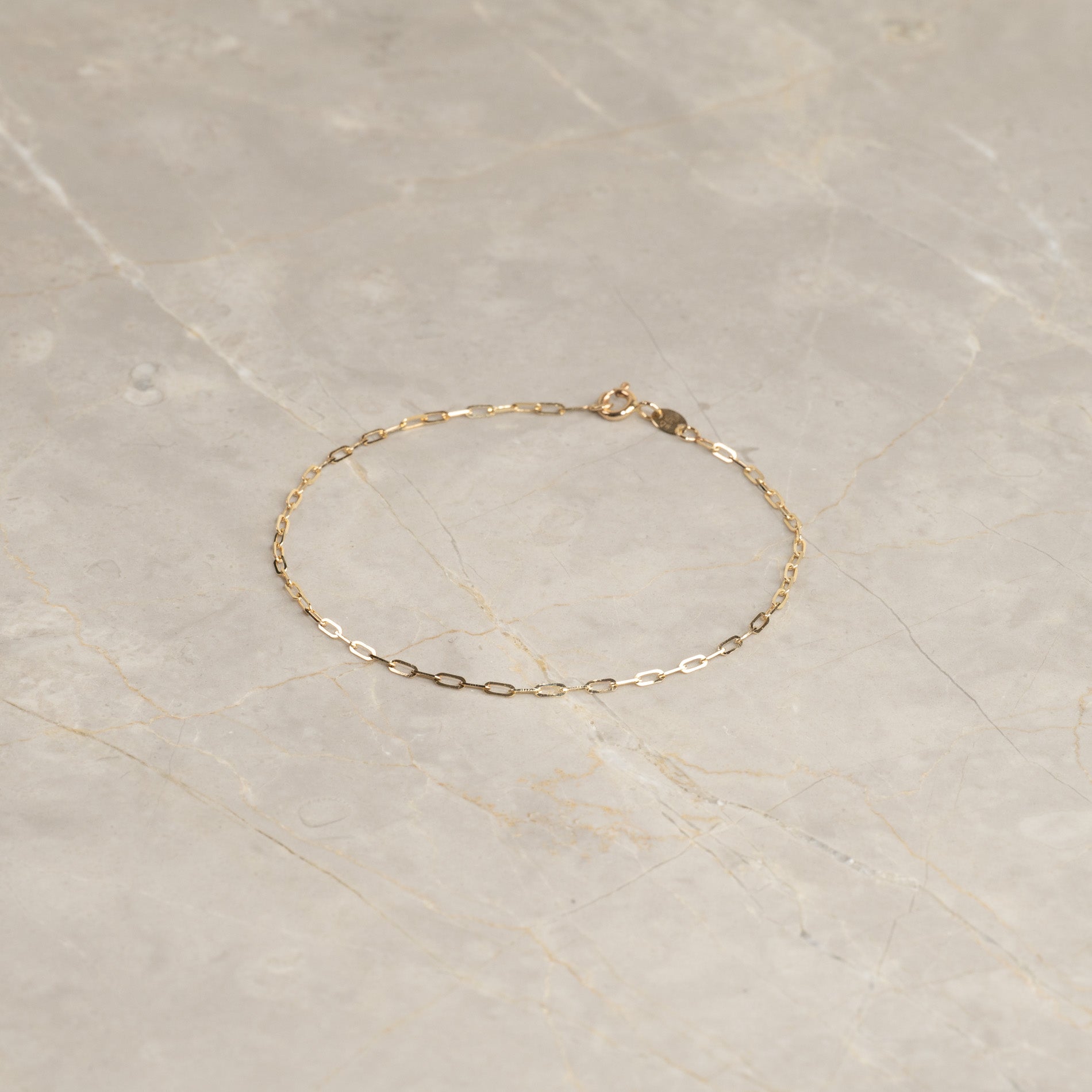 Vårt Alma medium gullarmbånd er laget i 100% resirkulert 9 karat massivt gull. Armbåndet er laget med et kjede som ligner binders, med avlangde kjedeledd.