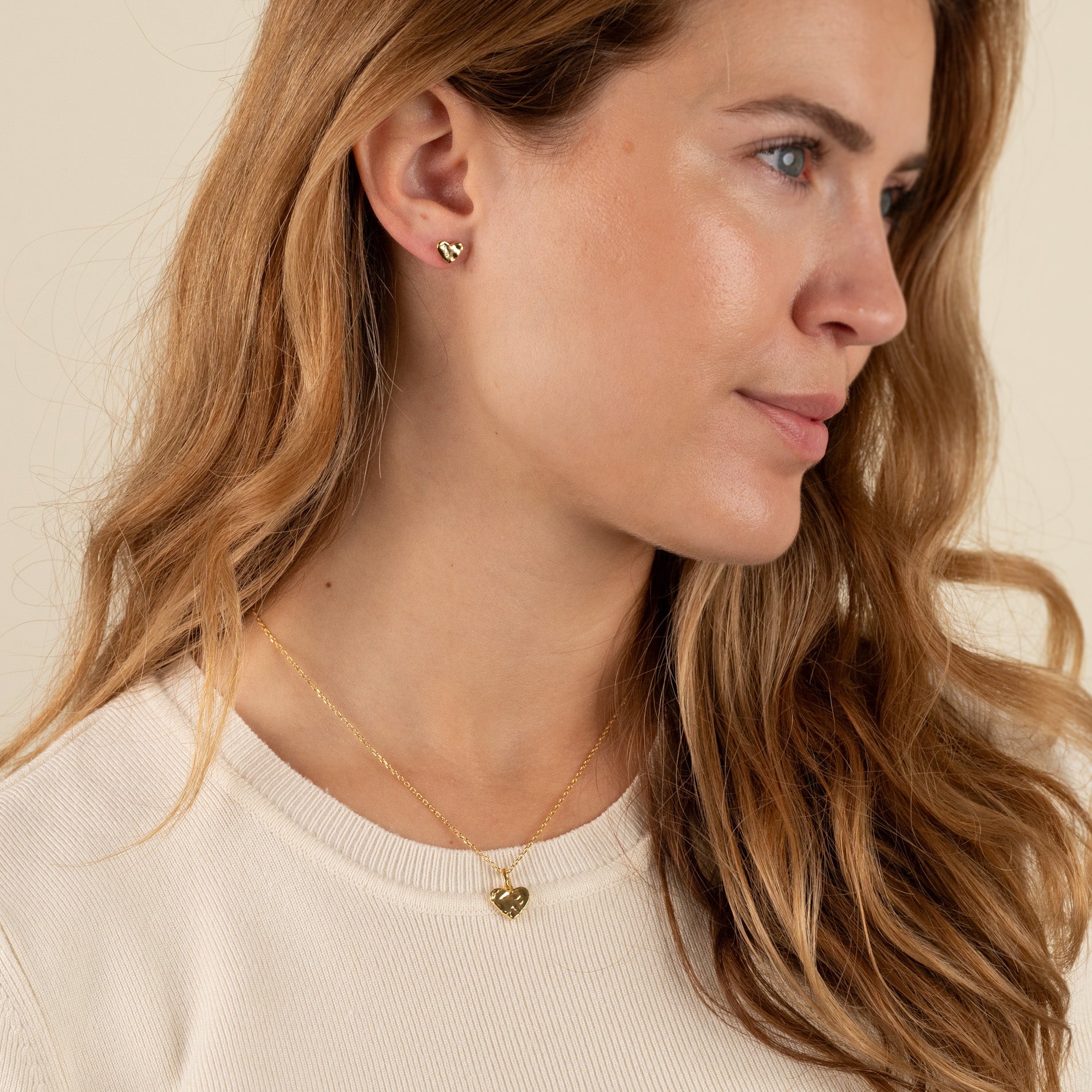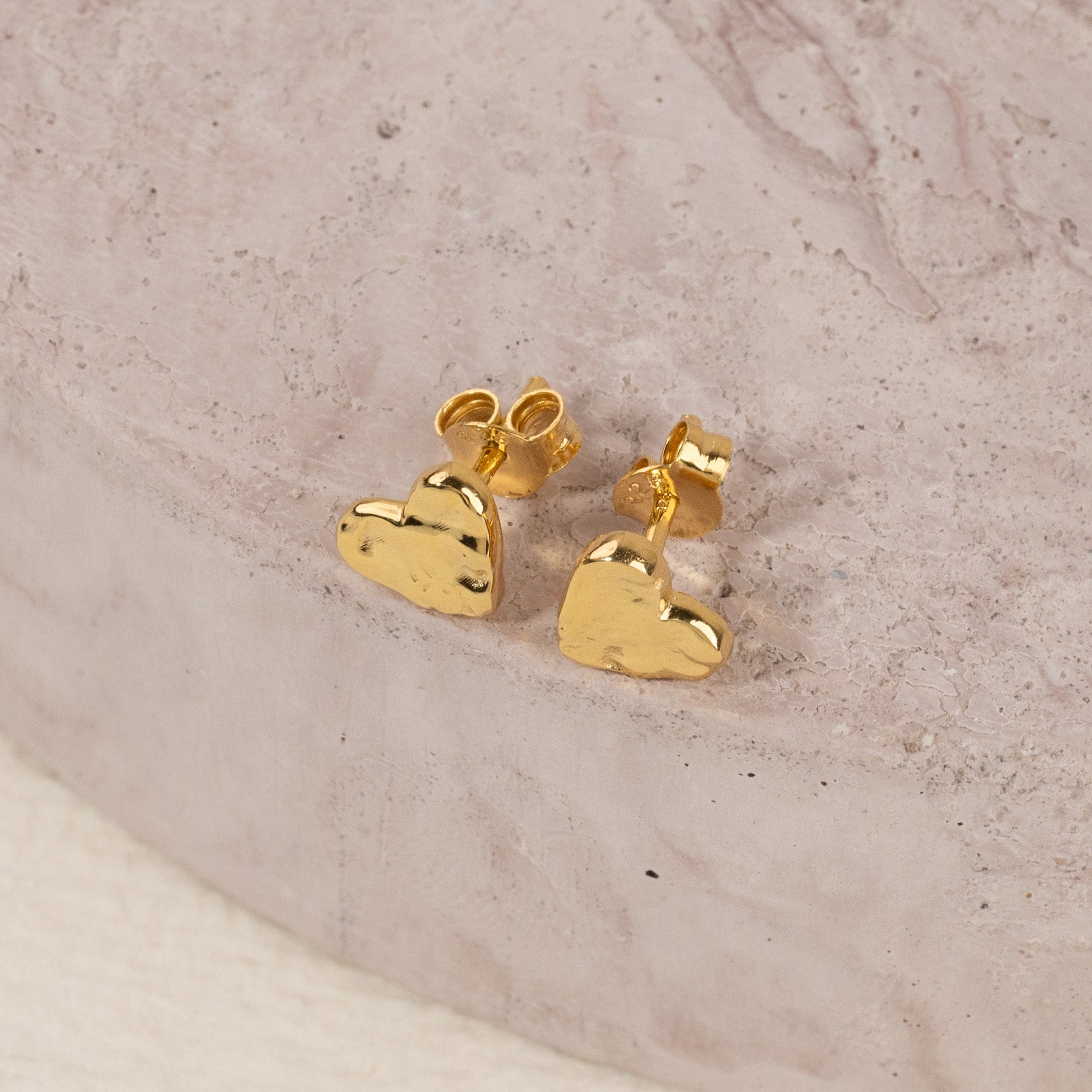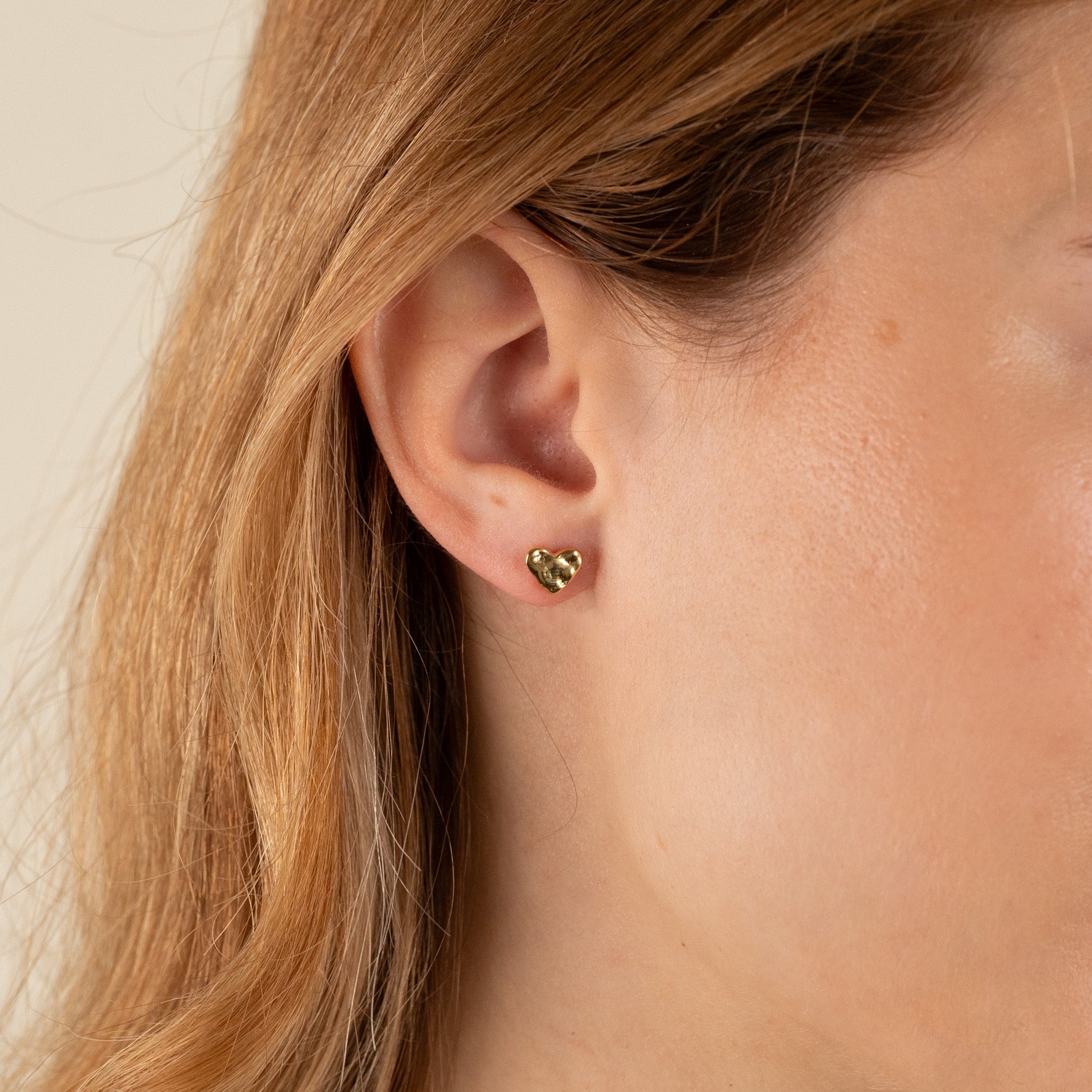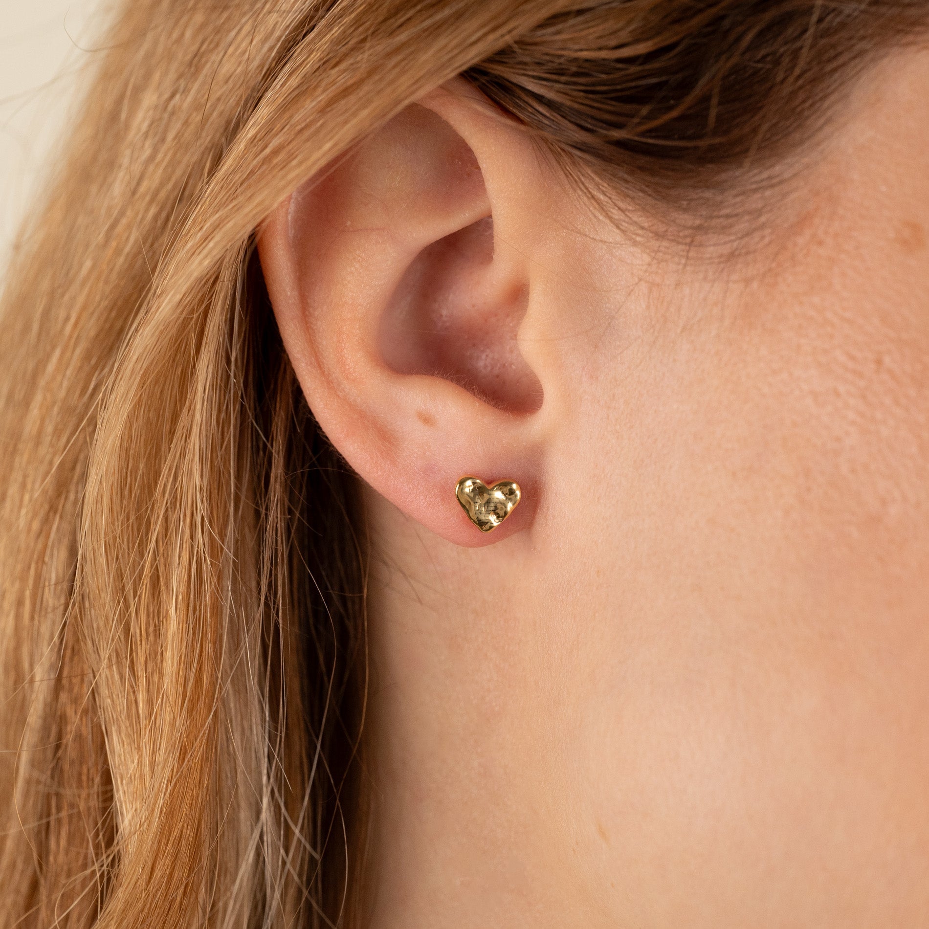 Øredobb i 100% resirkulert 18 karat forgylt sterlingsølv utformet som et hjerte. Øredobben har en rå overflate inspireret av smeltet metall.