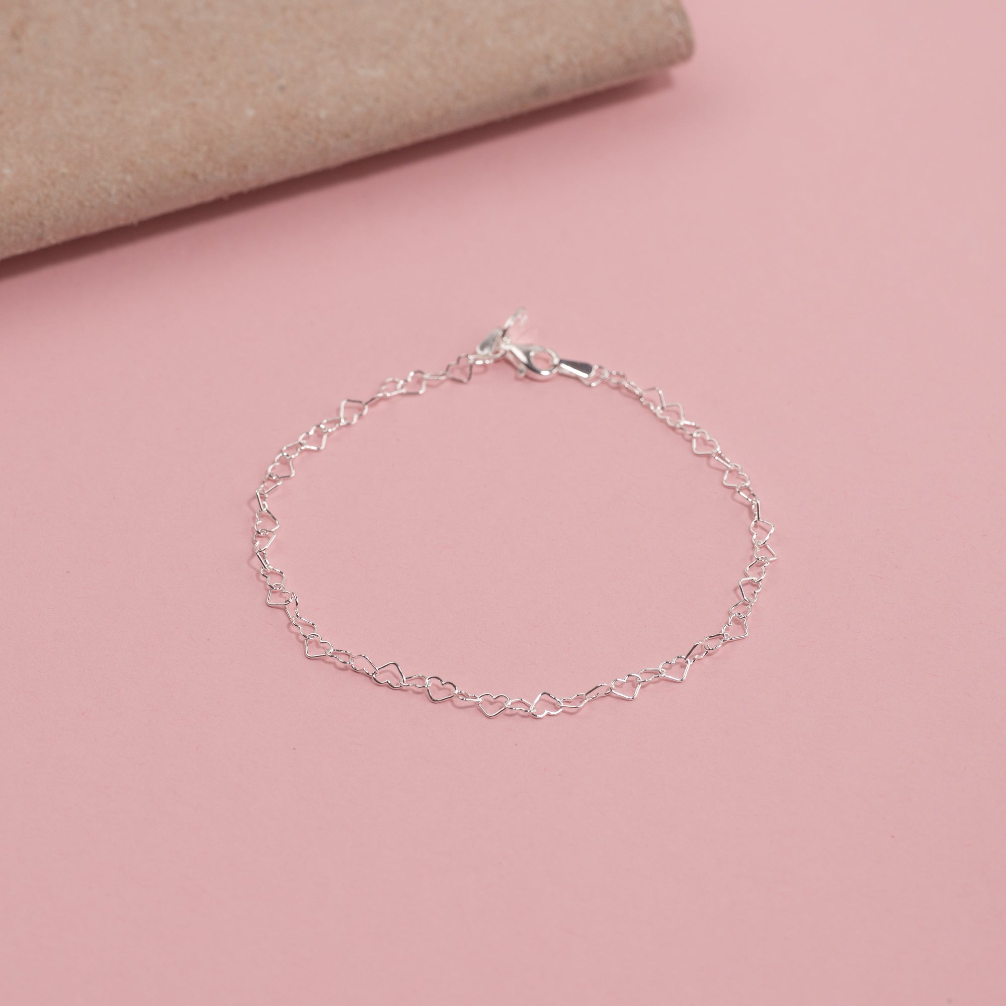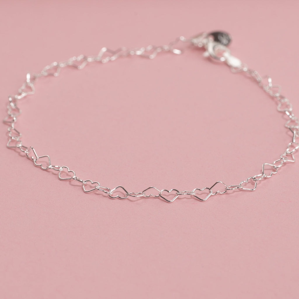 Armbåndet er laget av 100 % resirkulert 925 sterlingsølv og består av kjedeledd formet som små hjerter hele veien rundt.