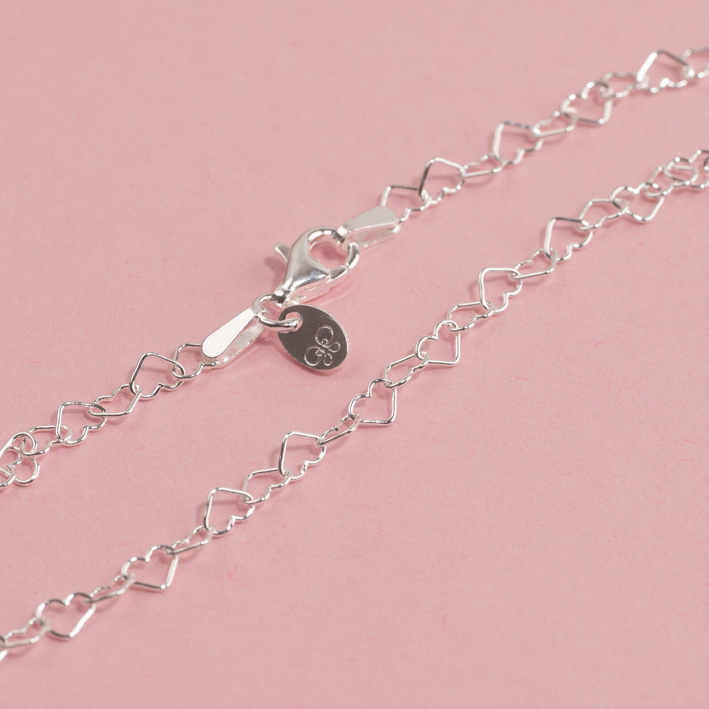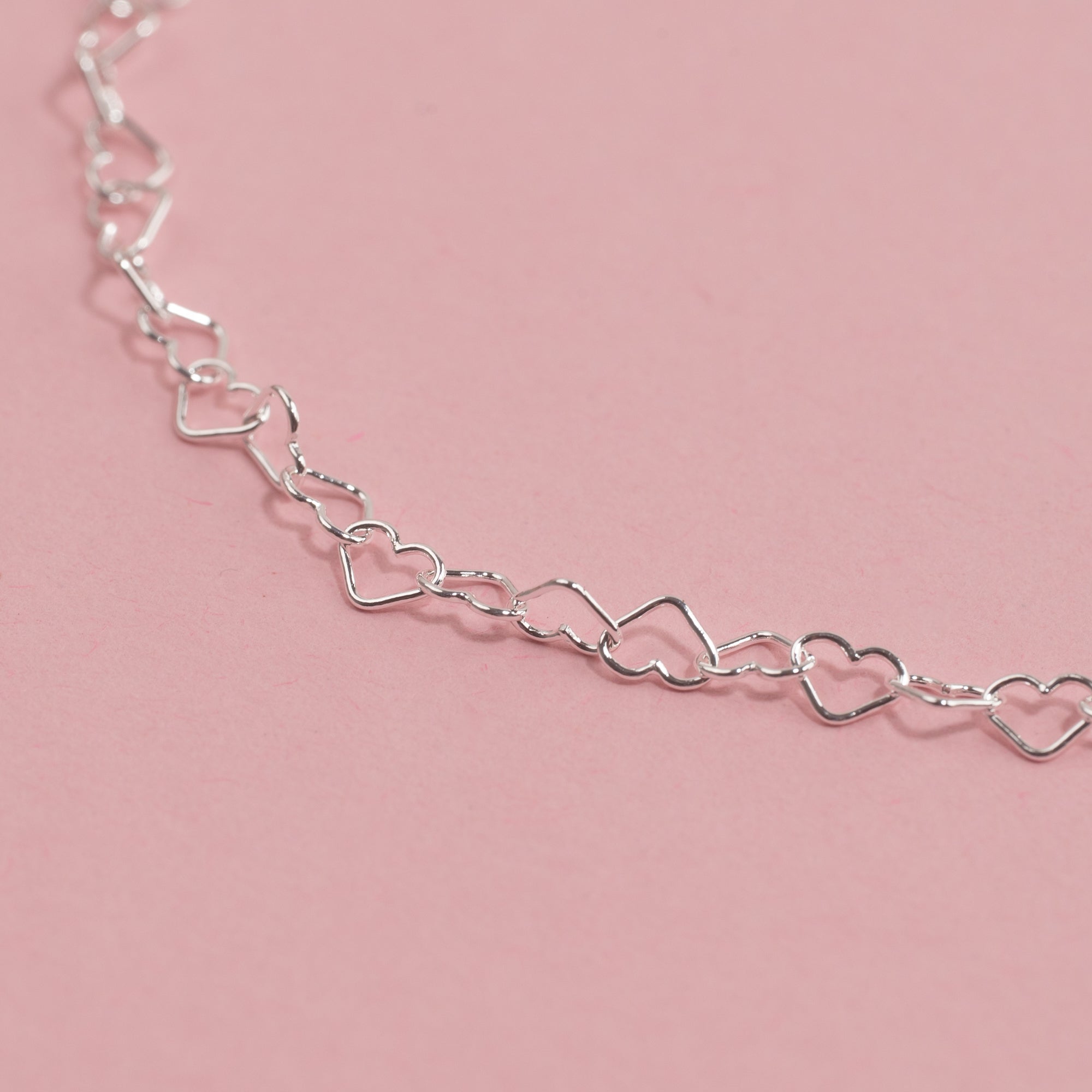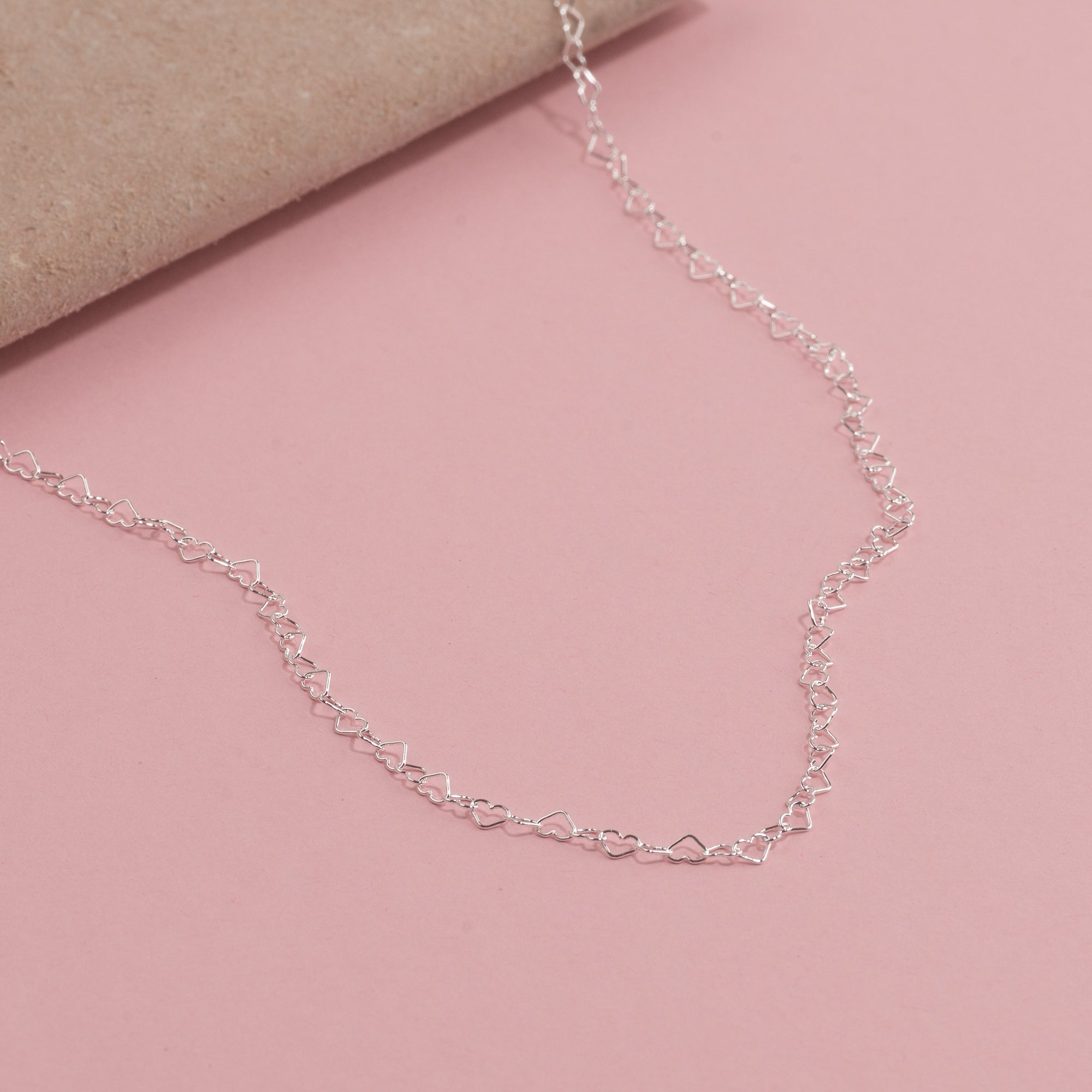 Halskjedet er laget av 100 % 925 sterlingsølv og består av kjedeledd formet som små åpne hjerter hele veien rundt.
