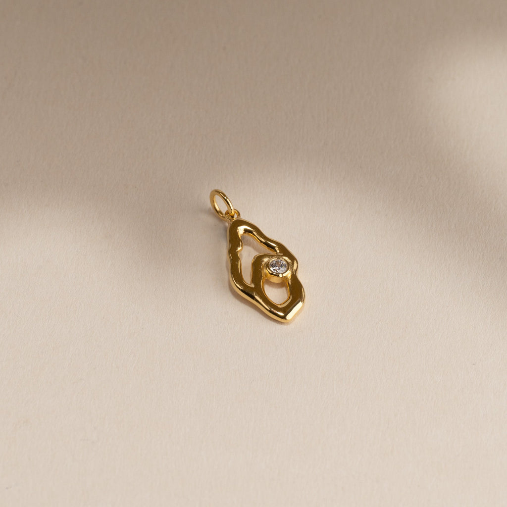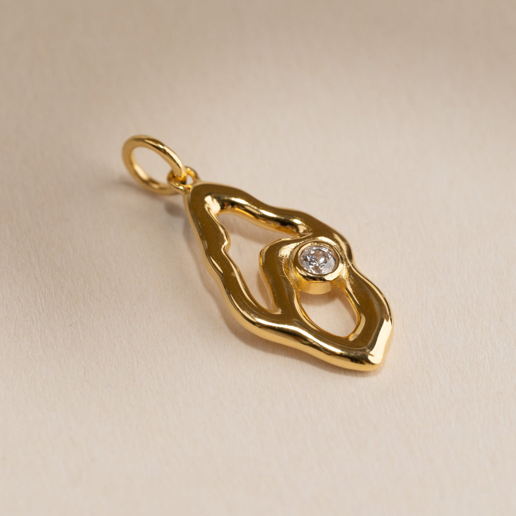 Anheng i 100% resirkulert 18 karat forgylt sterlingsølv med en klar zirkon i et organisk design. De myke formene gir anhenget et feminint og harmonisk uttrykk, som gjør det både unikt og iøynefallende.