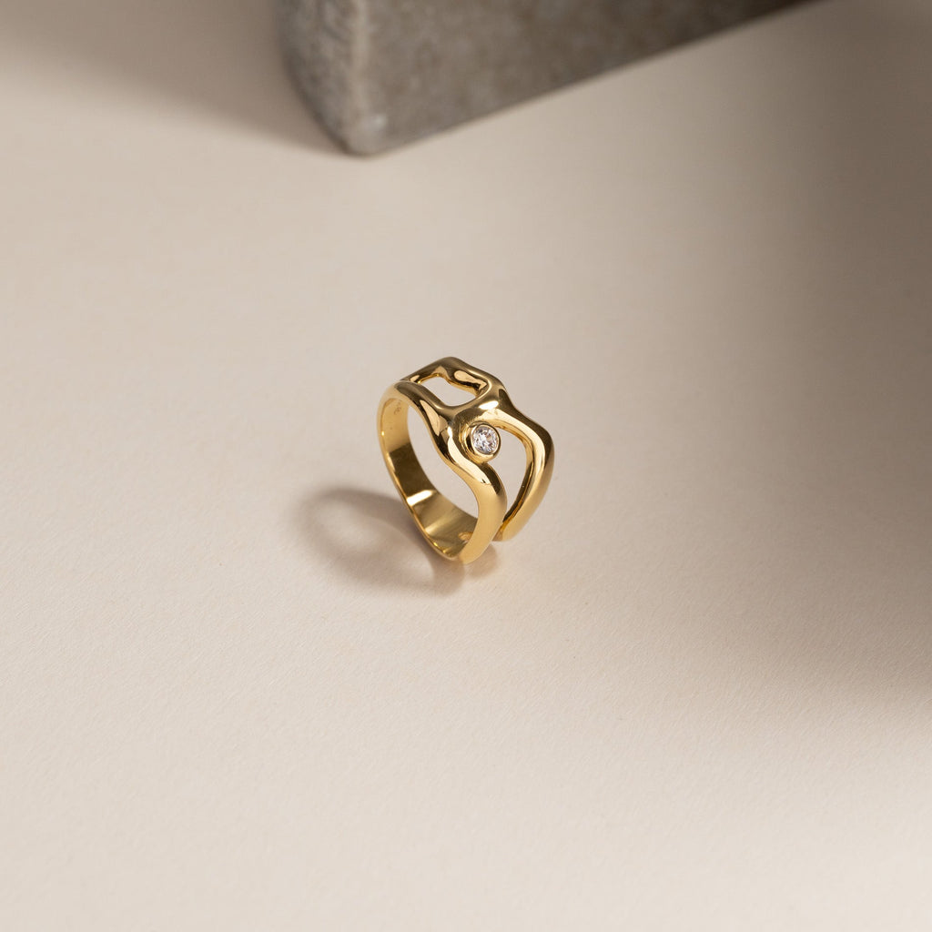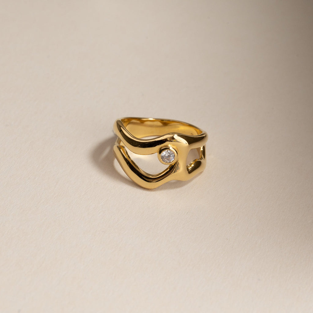 Ring i 100% resirkulert 18 karat forgylt sterlingsølv med en klar zirkon i et organisk design. De myke formene gir ringen et feminint og unikt uttrykk som gjør den både elegant og iøynefallende.