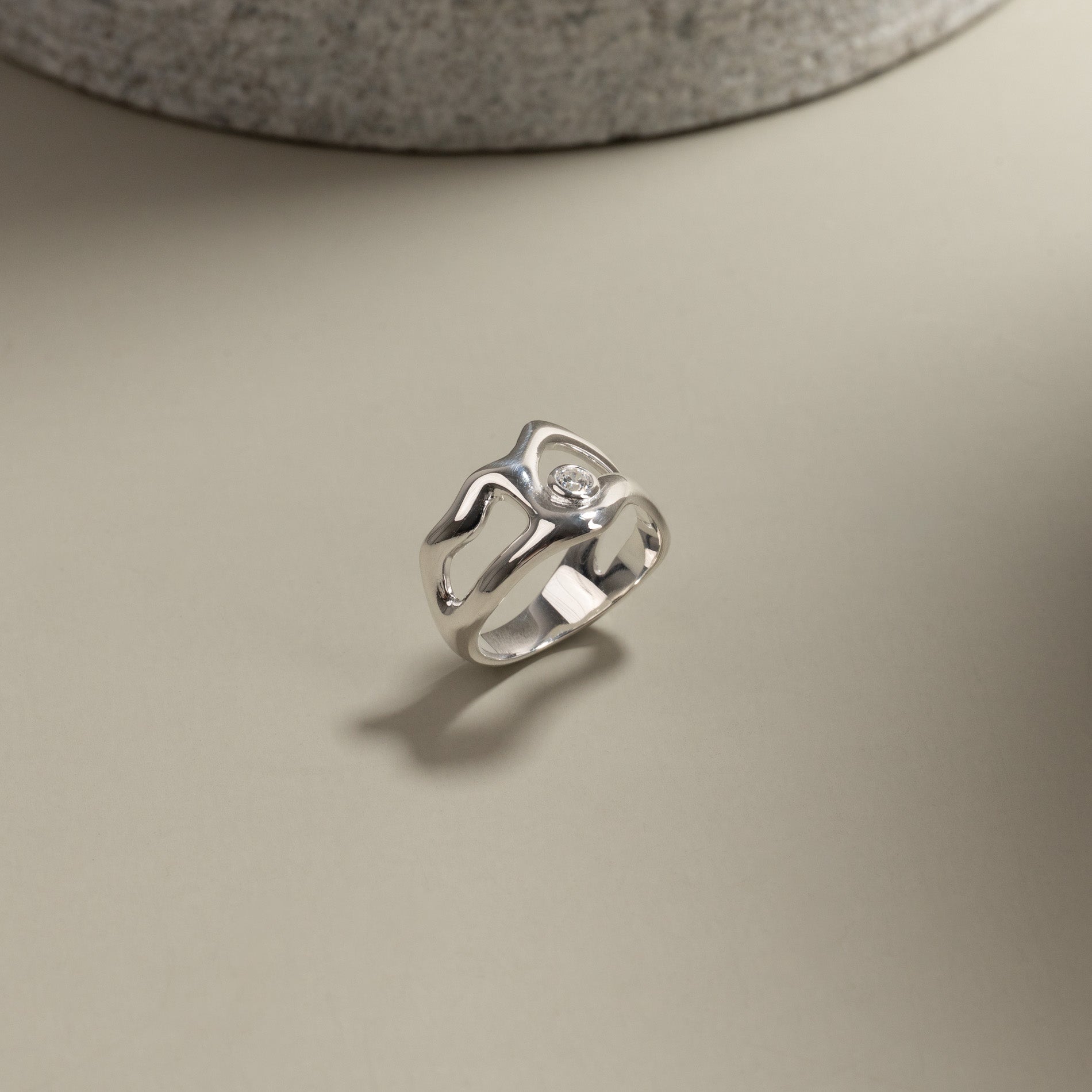 Ring i 100 % resirkulert 925 karat sterlingsølv med en klar zirkon i et organisk design. De myke formene gir ringen et feminint og unikt uttrykk som gjør den både elegant og iøynefallende.