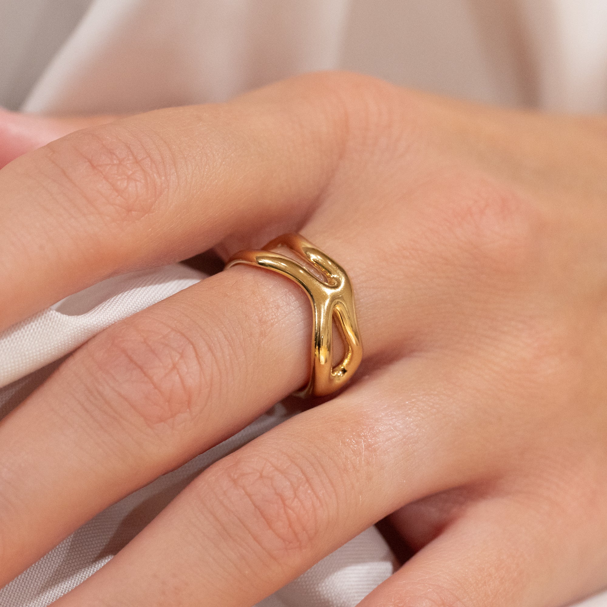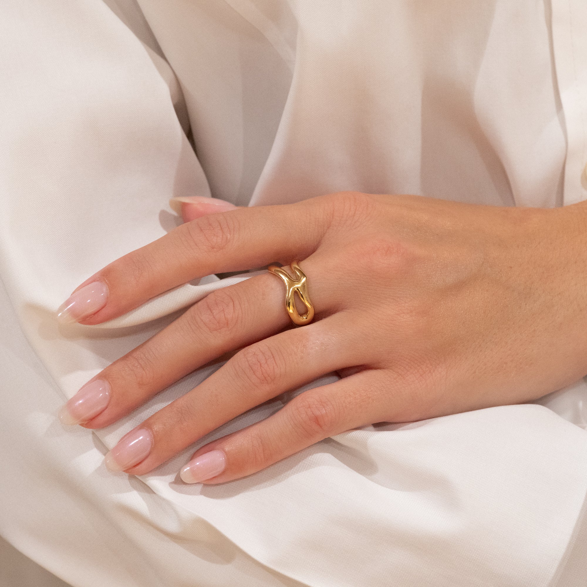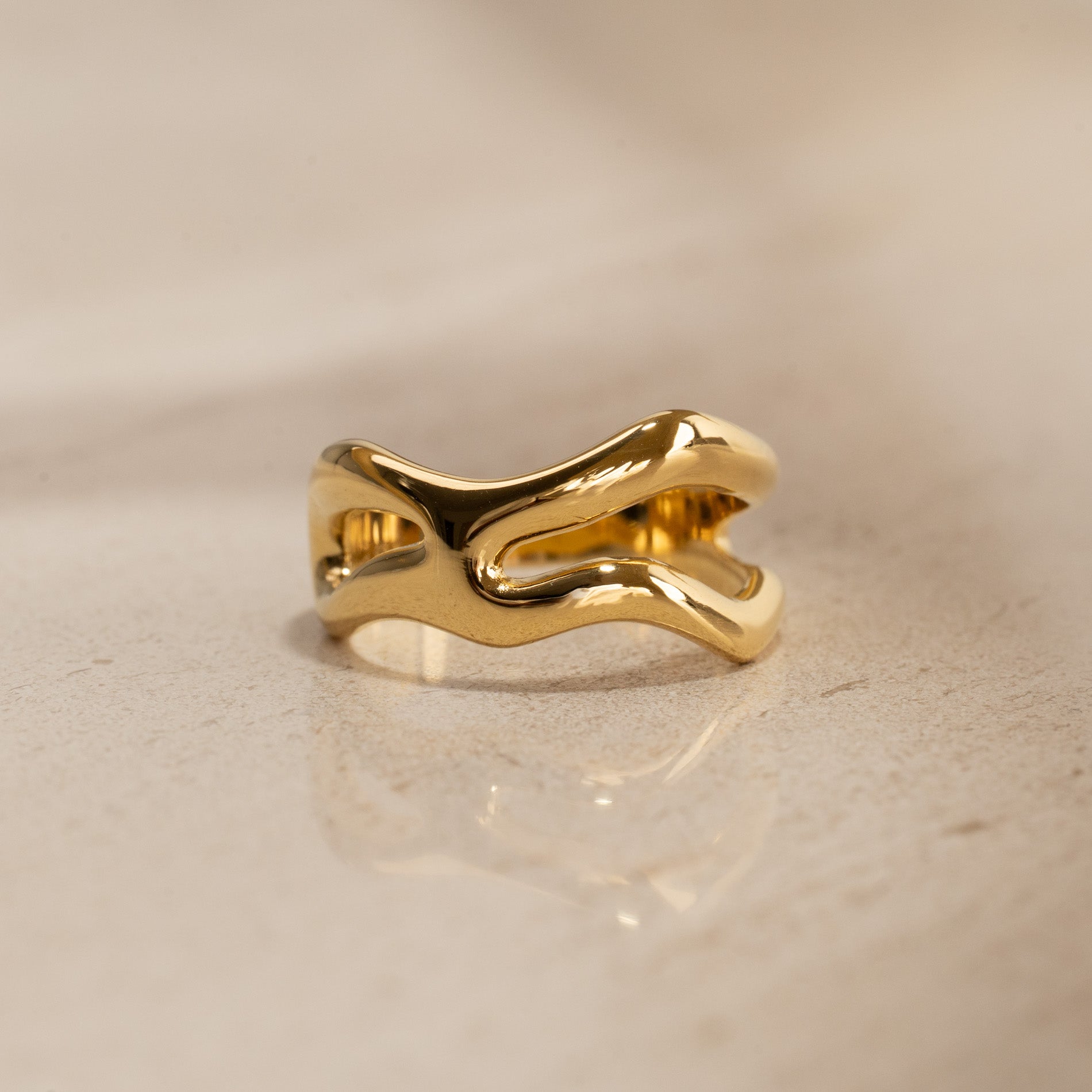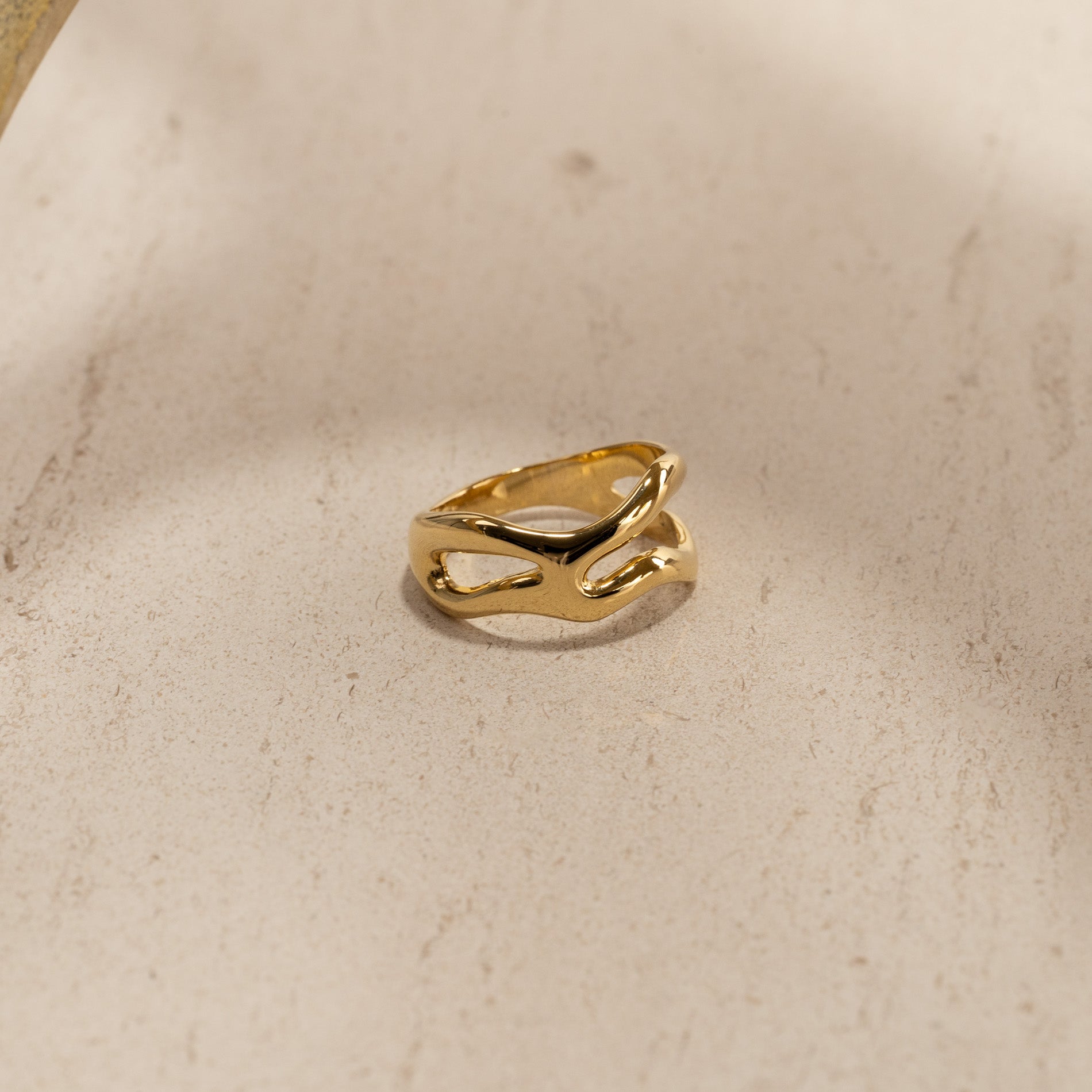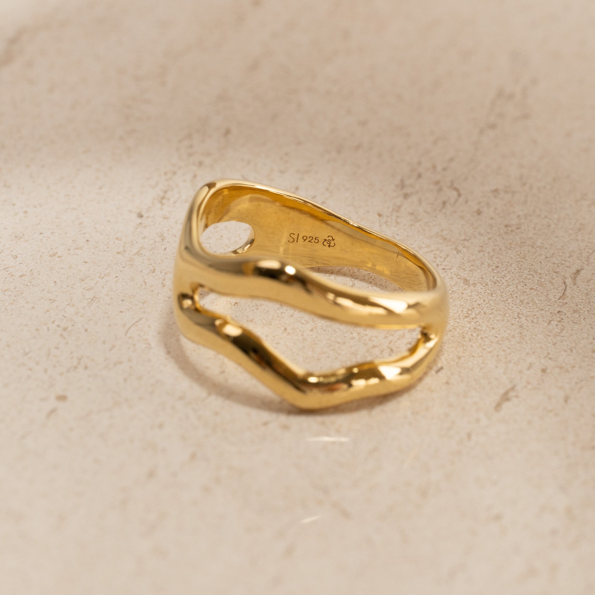 Ring i 100% resirkulert 18 karat forgylt sertlingsølv med et organisk design. De myke formene gir ringen et feminint og unikt uttrykk som gjør den både elegant og iøynefallende.