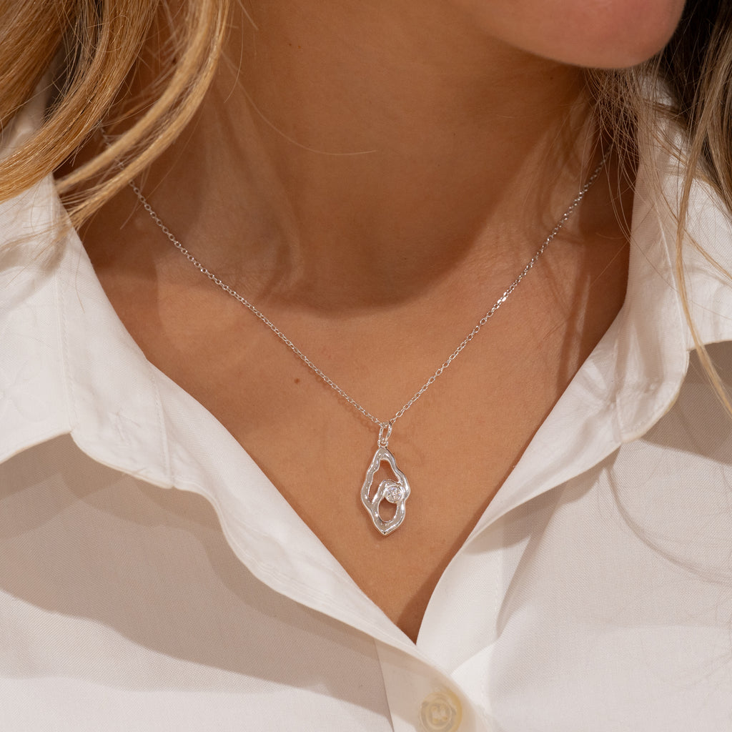 Anheng i 100% resirkulert 925 sterlingsølv med en klar zirkon i et organisk design. De myke formene gir anhenget et feminint og harmonisk uttrykk, som gjør det både unikt og iøynefallende.