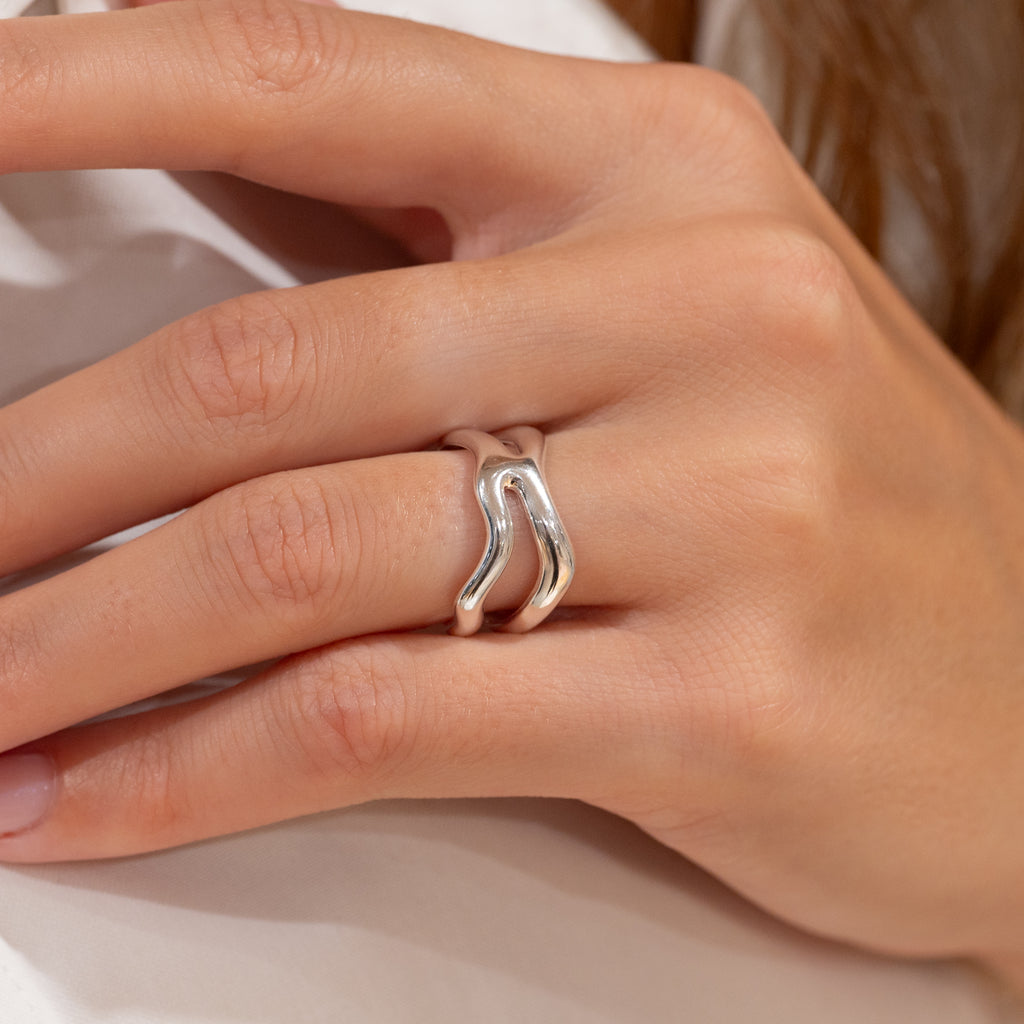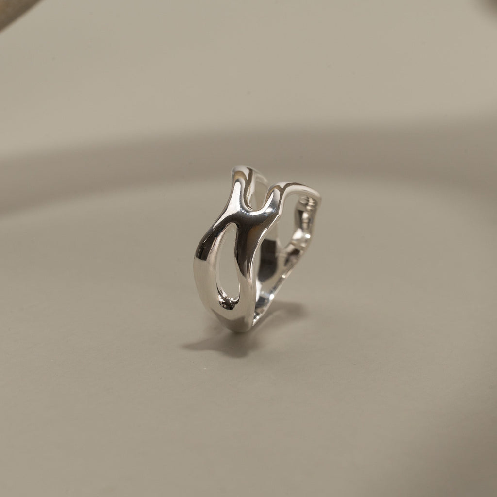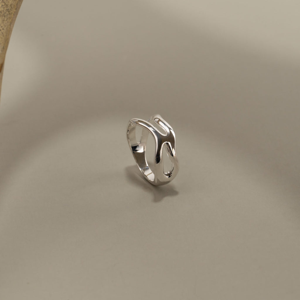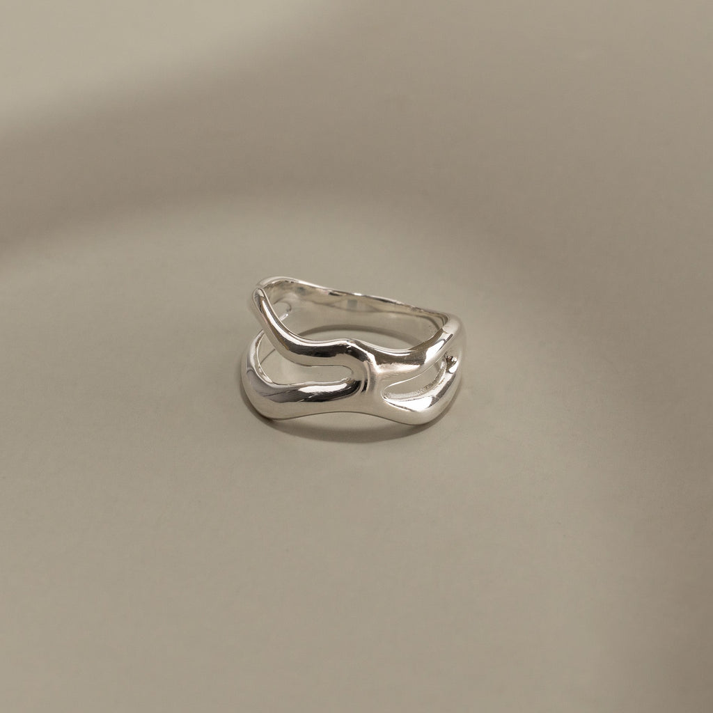 Ring i 100 % resirkulert 925 sterlingsølv med et organisk design. De myke formene gir ringen et feminint og unikt uttrykk som gjør den både elegant og iøynefallende.