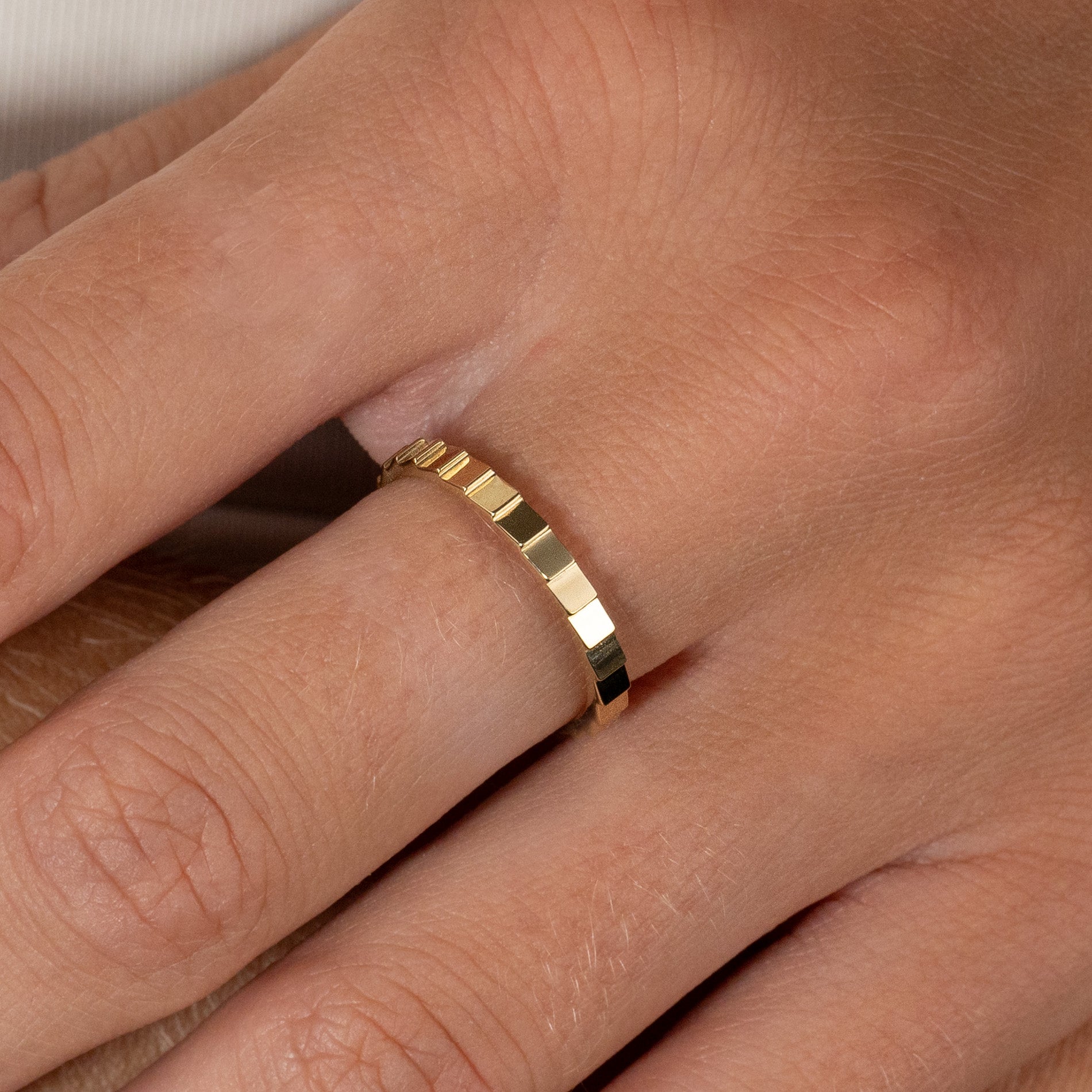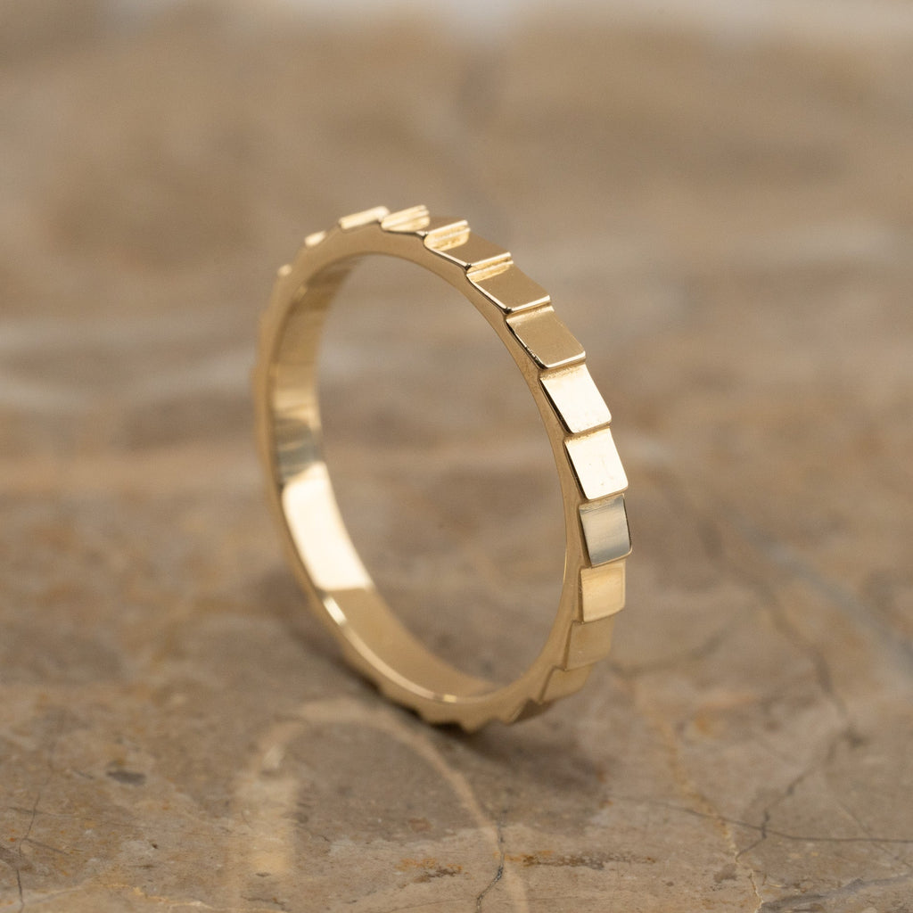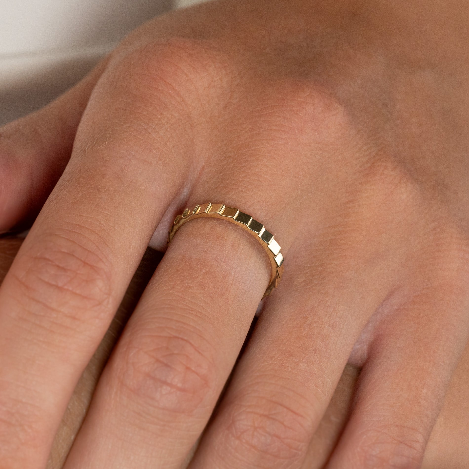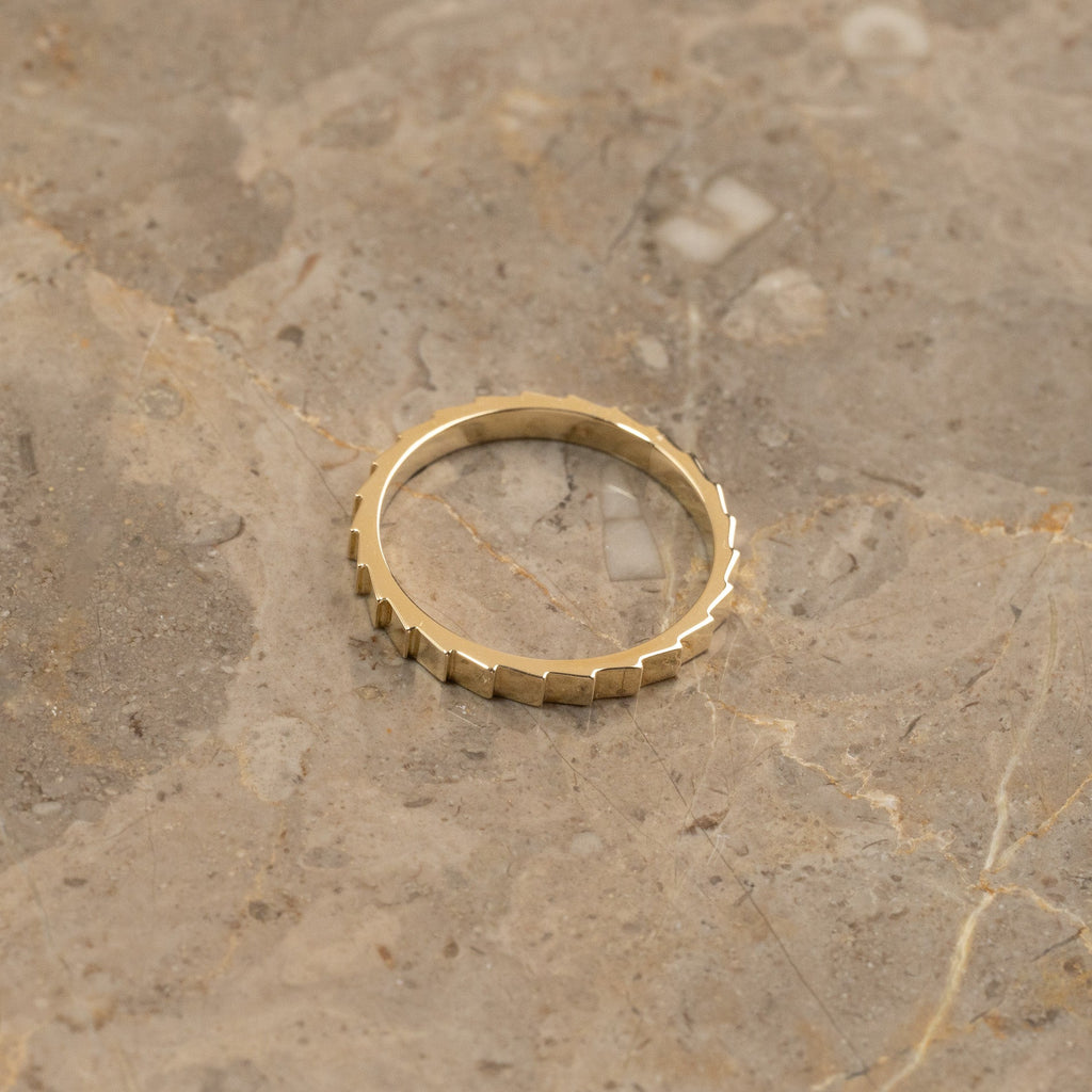 Ringen er designet med en rå overflade med flere små flater som sammen danner en en hakkete struktur. Ringen har nærmest et mekanisk uttrykk, som er en fin kontrast til lysrefleksjonen fra alle de vakre og skinnende overflatene.