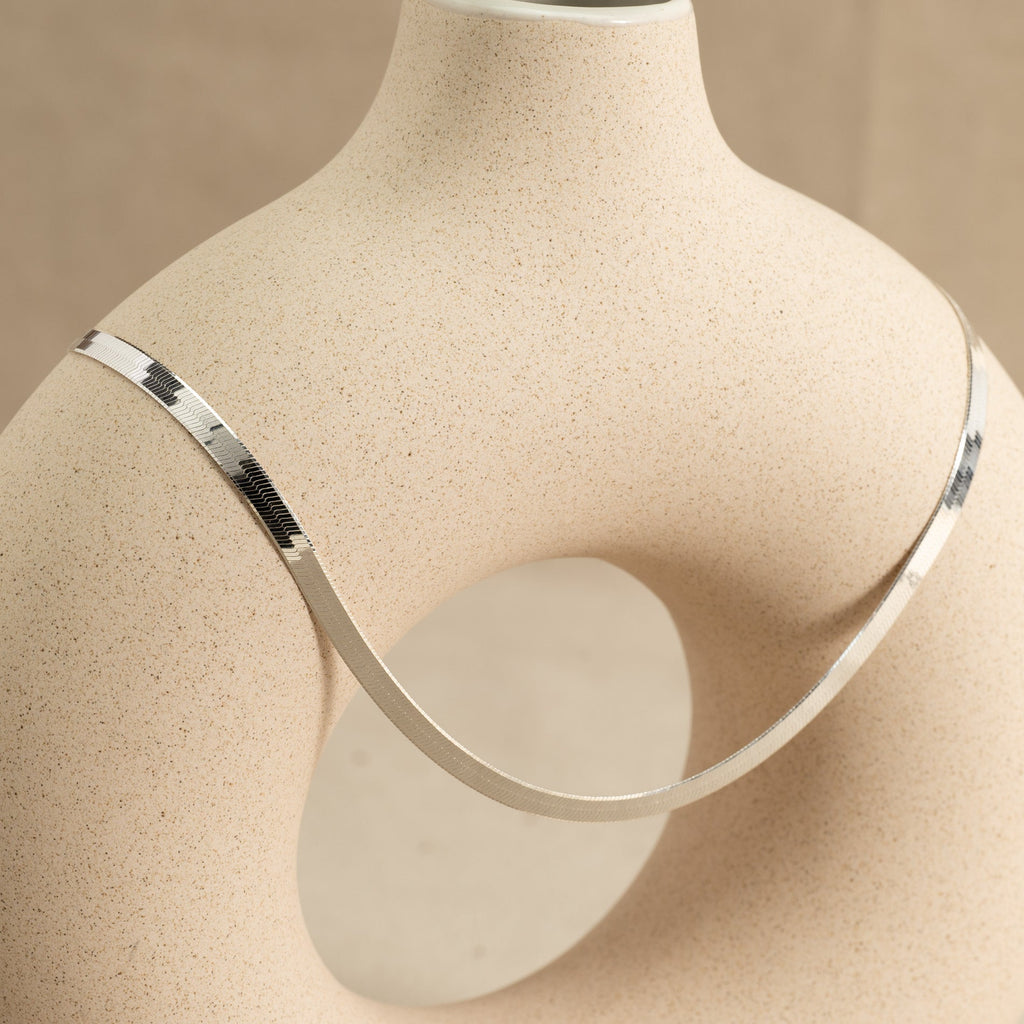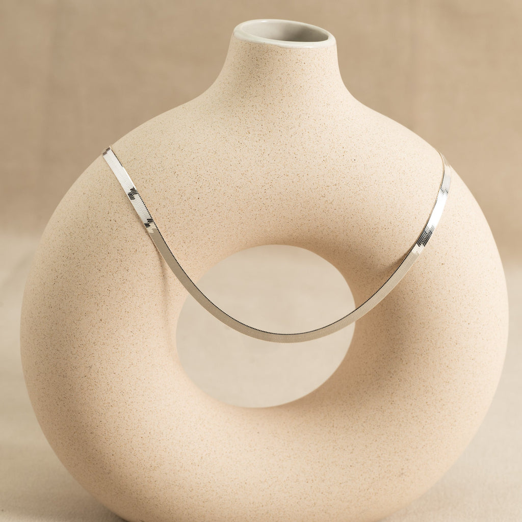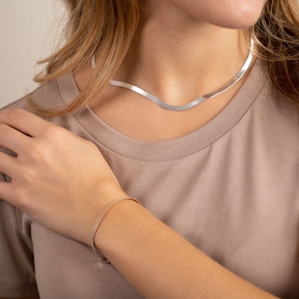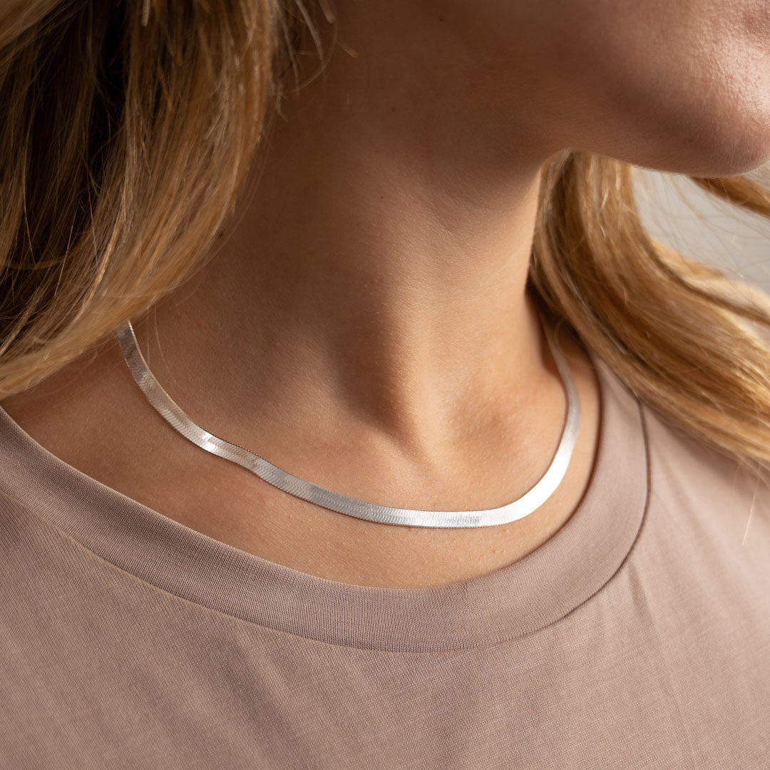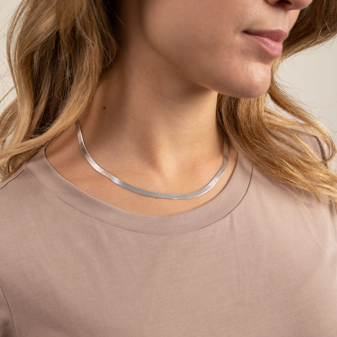 Aya slangekjede er det perfekte tilskuddet til enhver smykkesamling. Det enkle og elegante slangehalskjede legger seg nydelig rundt halsen. De tettsittende leddene har en skinnende flate, som gir det flate slangekjede sitt spesielle uttrykk.