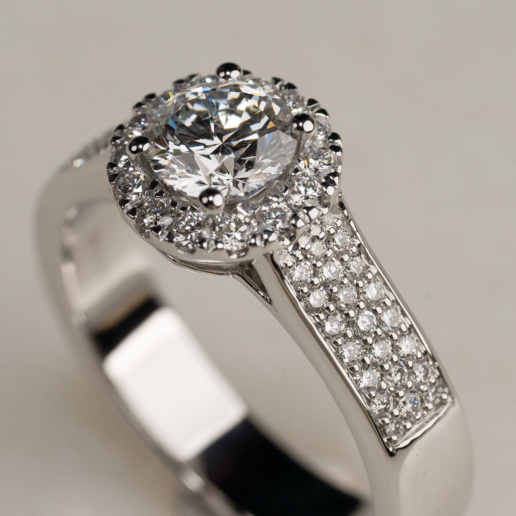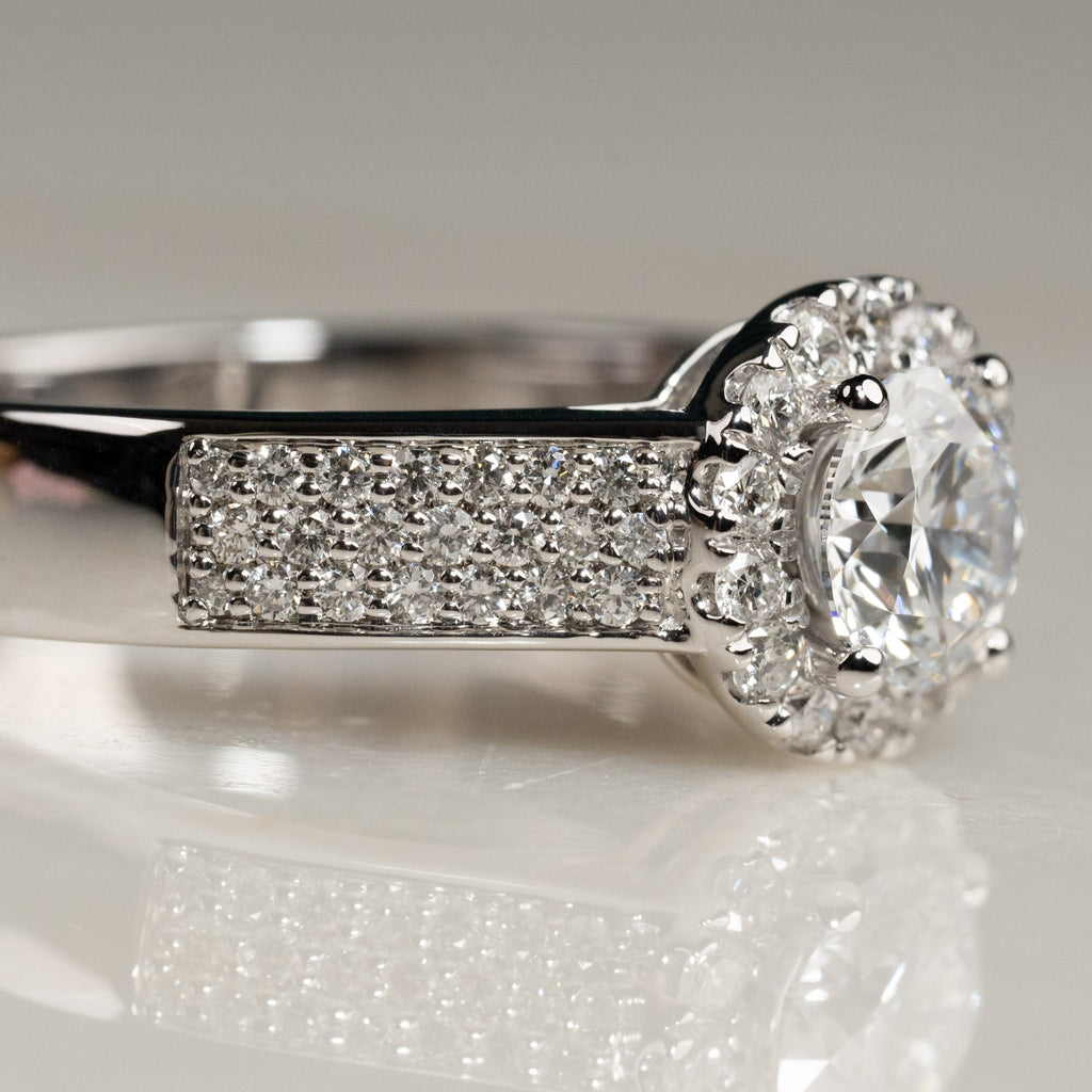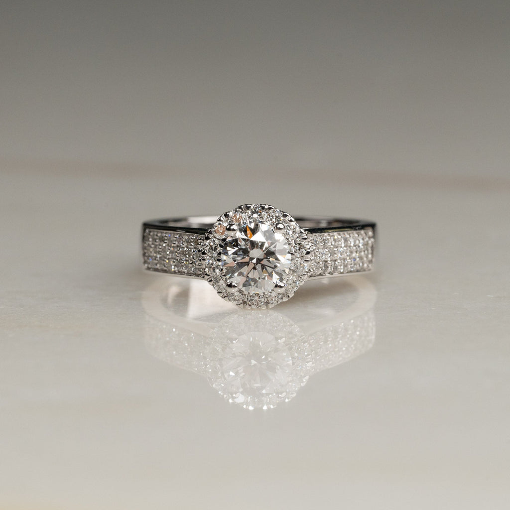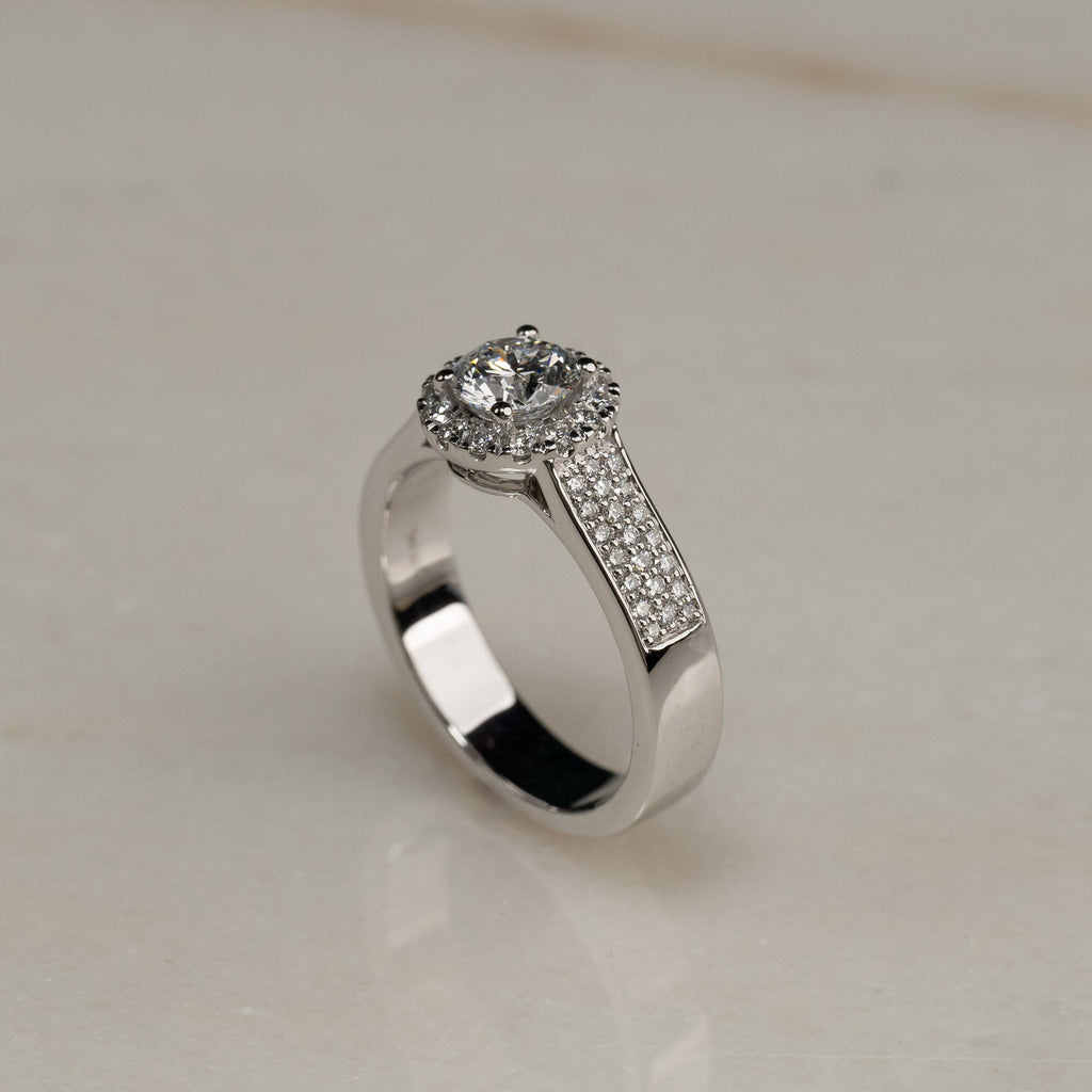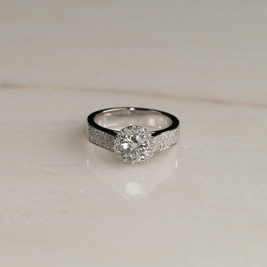 Ringen er designet i 14 karat hvitt gull og har en klassisk og elegant pavé-innfatning, med små diamanter som pryder ringbåndet. I midten er det en vakker sentral diamant, omgitt av en glorie av små diamanter, som gir ekstra glans og fremhever skjønnheten til den sentrale steinen. Diamantene er River-farge og VVS1-klarhet, og med en total diamantvekt på 1,55 ct er ringen et tidløst og eksklusivt valg, hvor hver detalj bidrar til et elegant og sofistikert utseende.