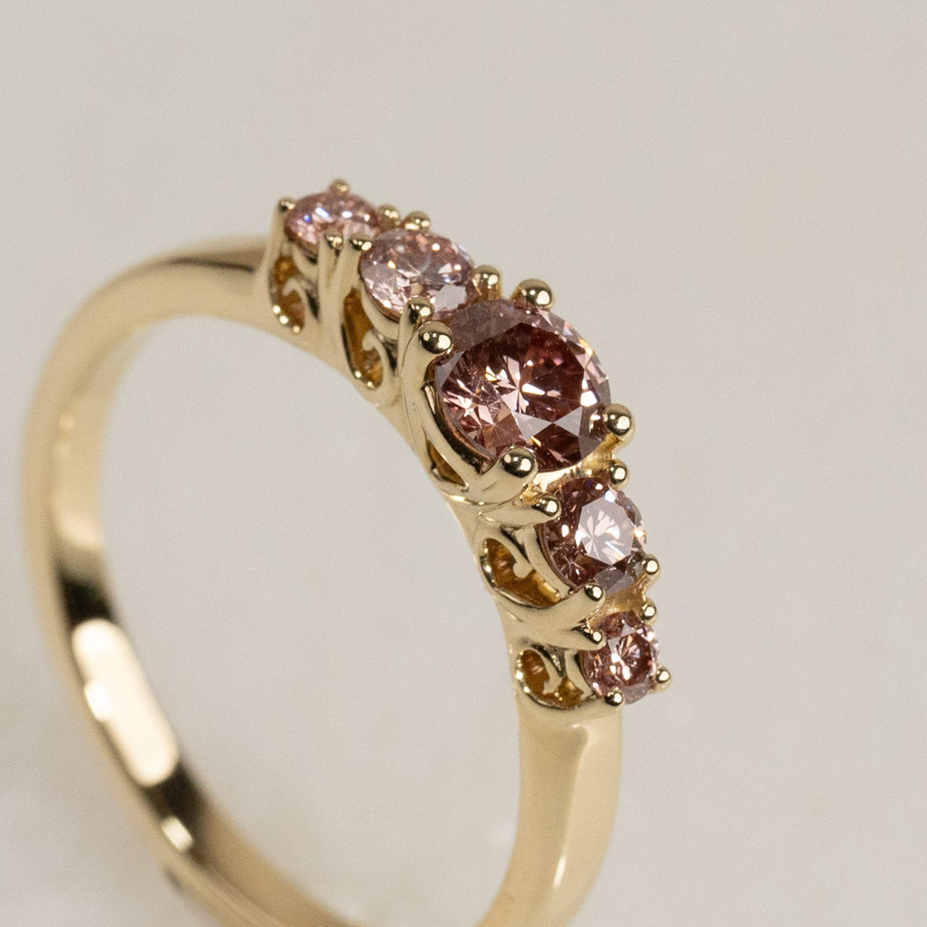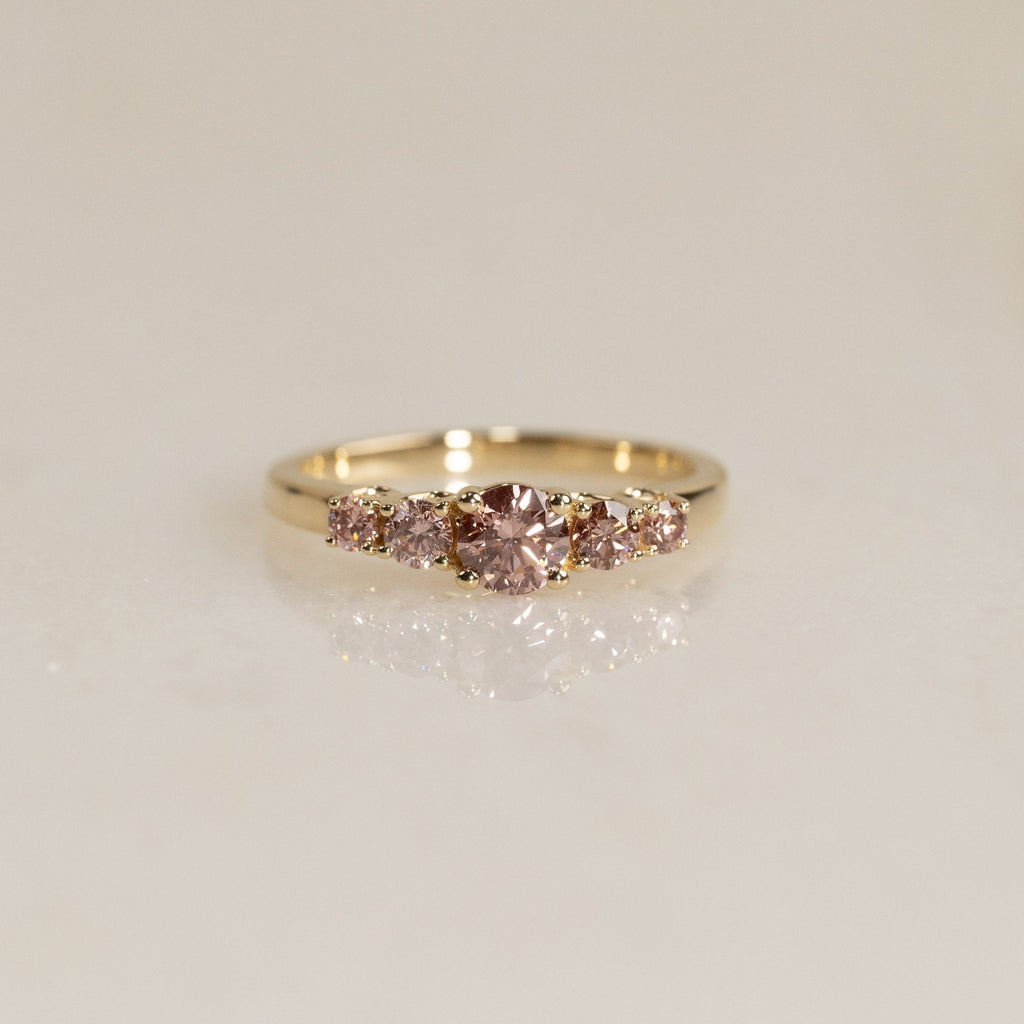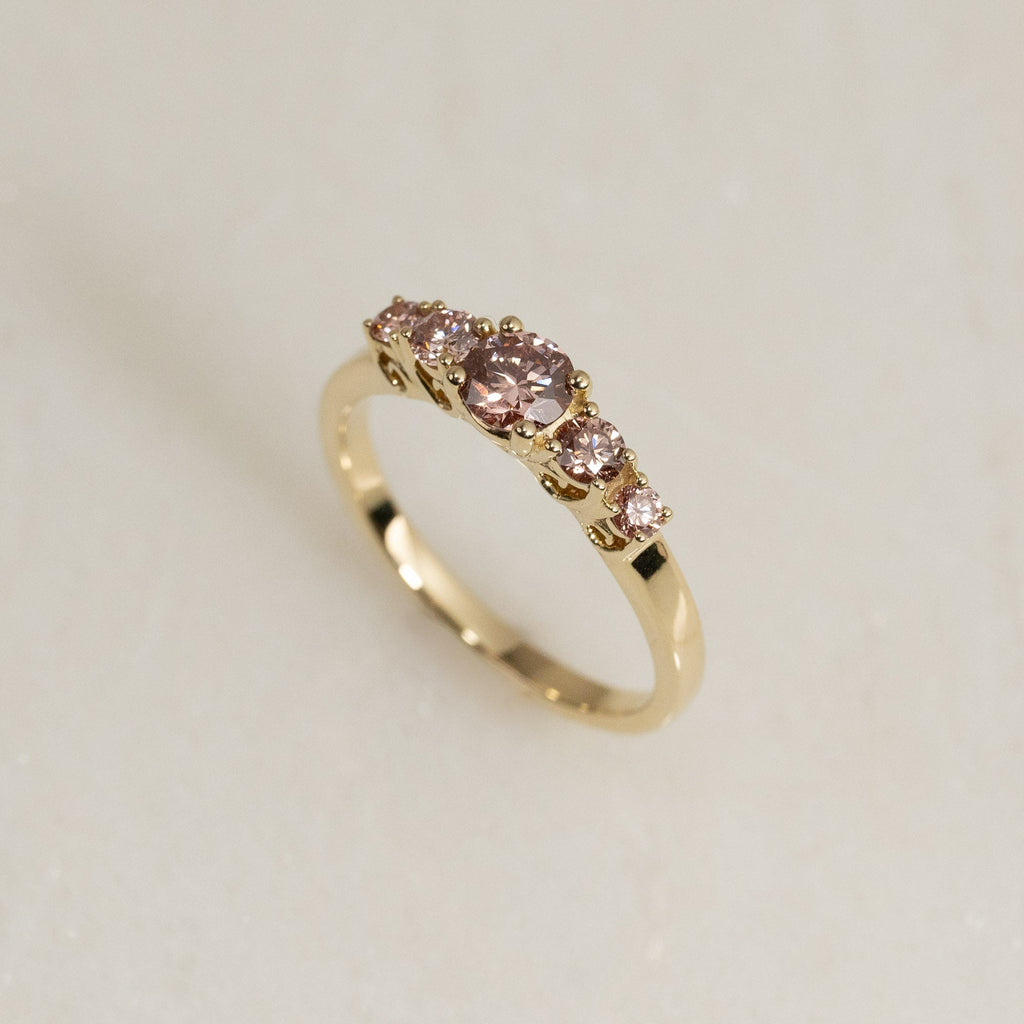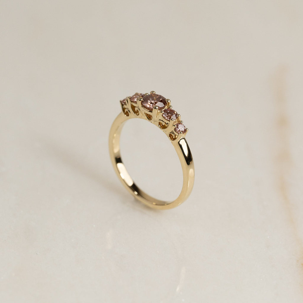 Ringen er designet i 14 karat gull med fem vakre champagnfargede diamanter satt i en elegant trellis-fatning. Diamantene er gradert i størrelse slik at de omgir midtstenen på en vakker måte og skaper en harmonisk balanse. Gitterinnfatningen er preget av sine dekorative, sammenflettede klør, som gir et klassisk og tidløst utseende samtidig som de fremhever steinene fra alle vinkler. Den totale diamantvekten er 0,7 ct.