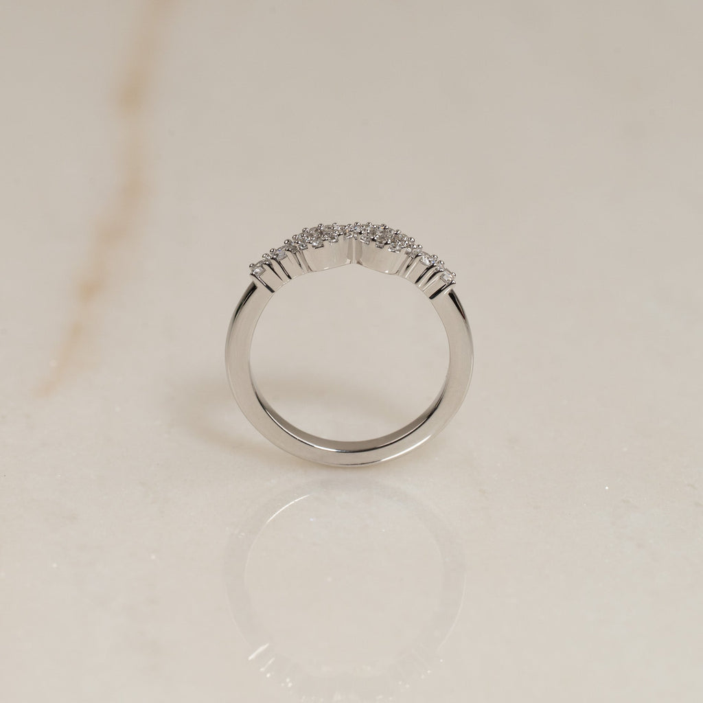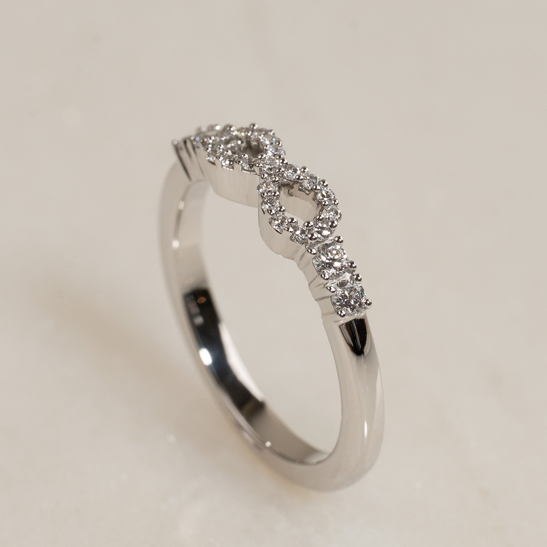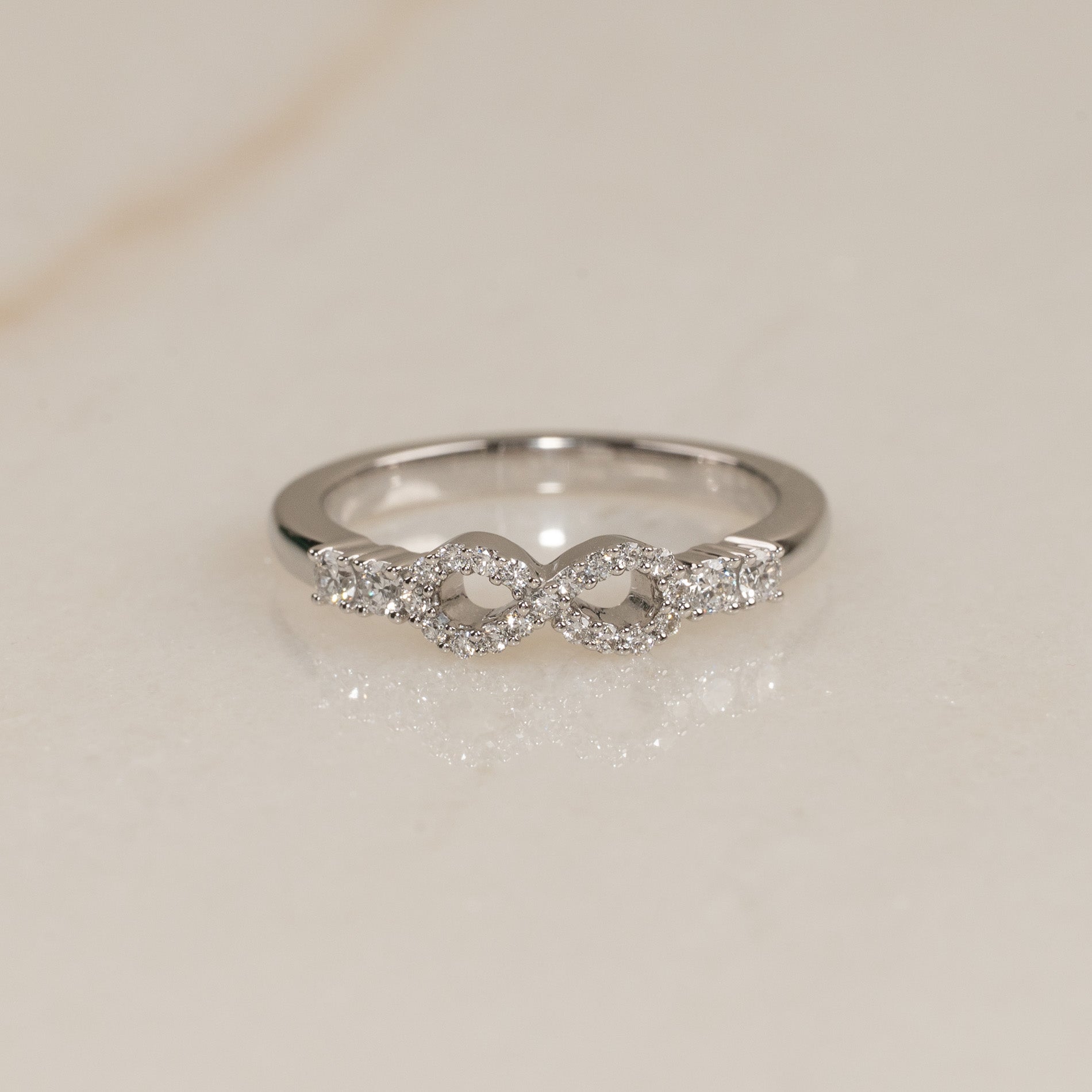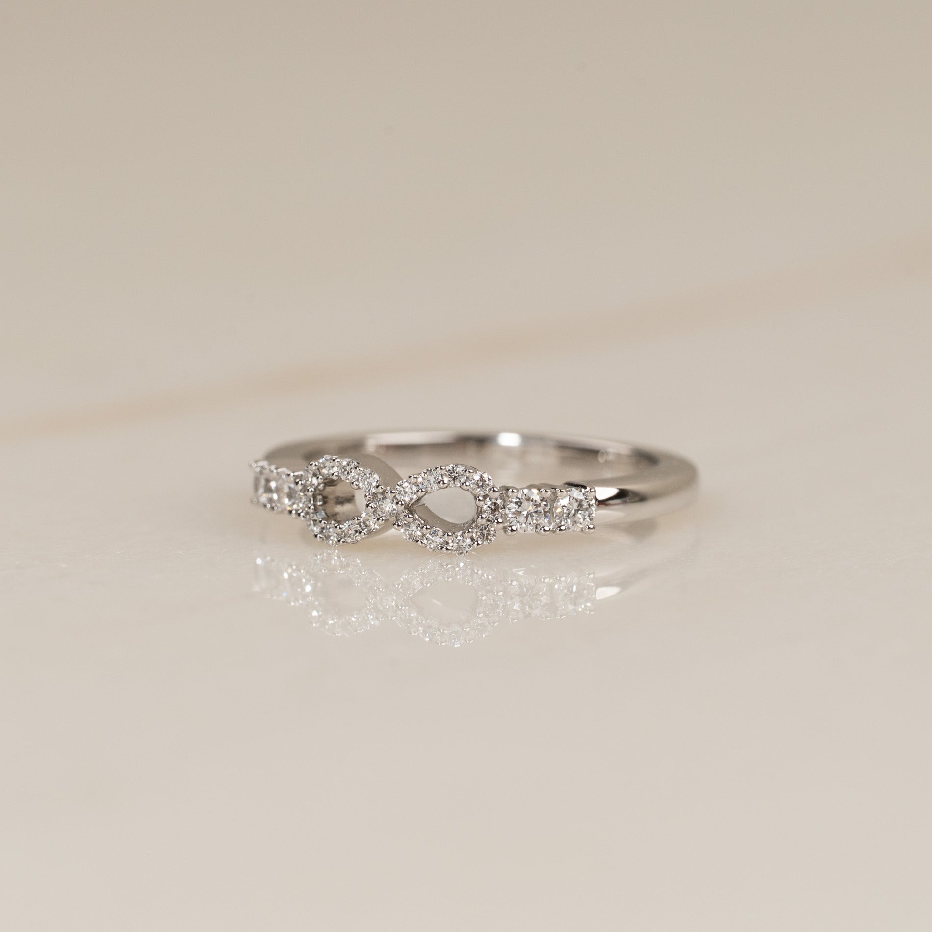 Ringen er laget i 18 karat massivt hvitt gull og satt med lab-grown diamanter. Det glitrende designet er personliggjort med et elegant uendelighetsmotiv i midten, vakkert komplementert av to sidesten på hver side. Til sammen har ringen en total karatvekt på 0,39 ct. Diamantene er E/F (River) i farge og VVS i klarhet.