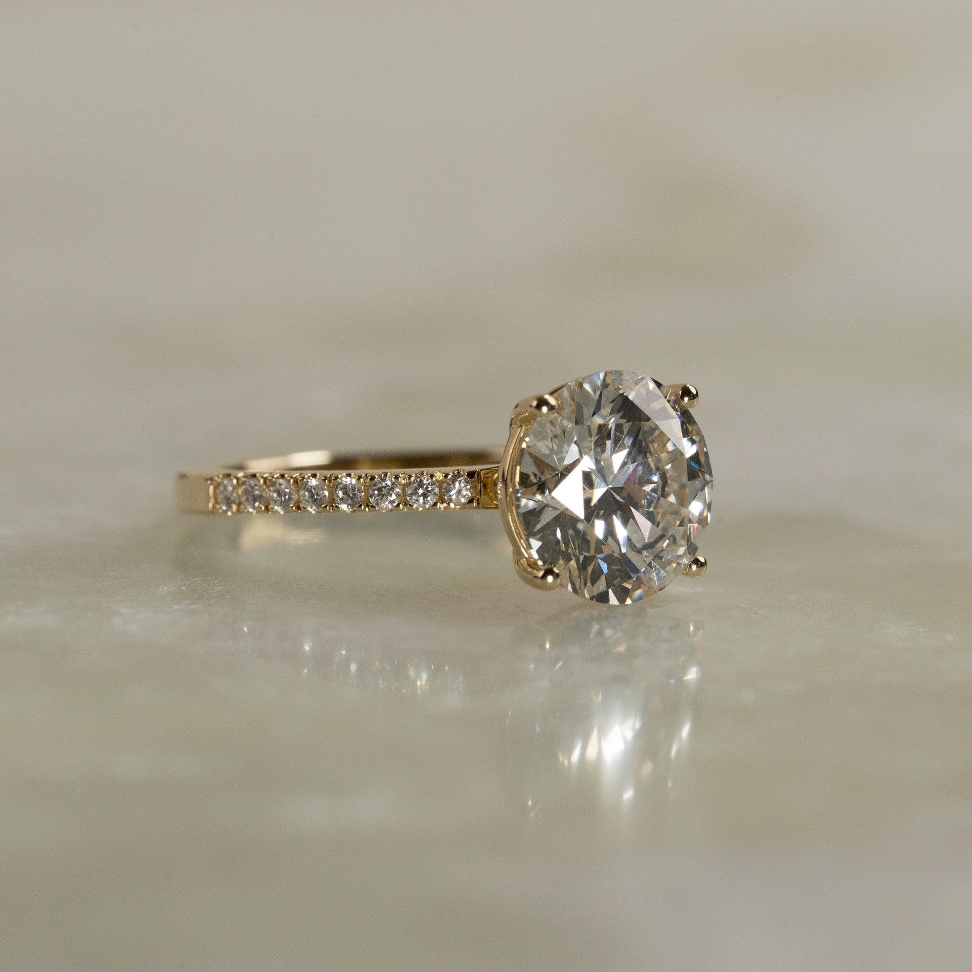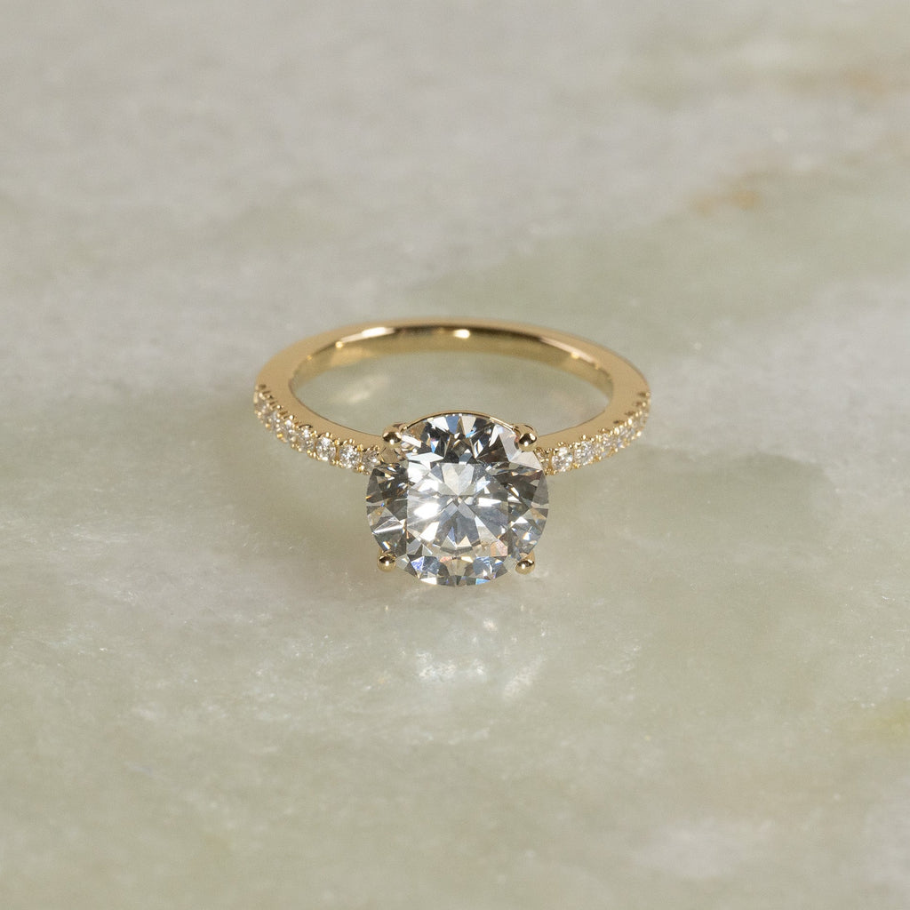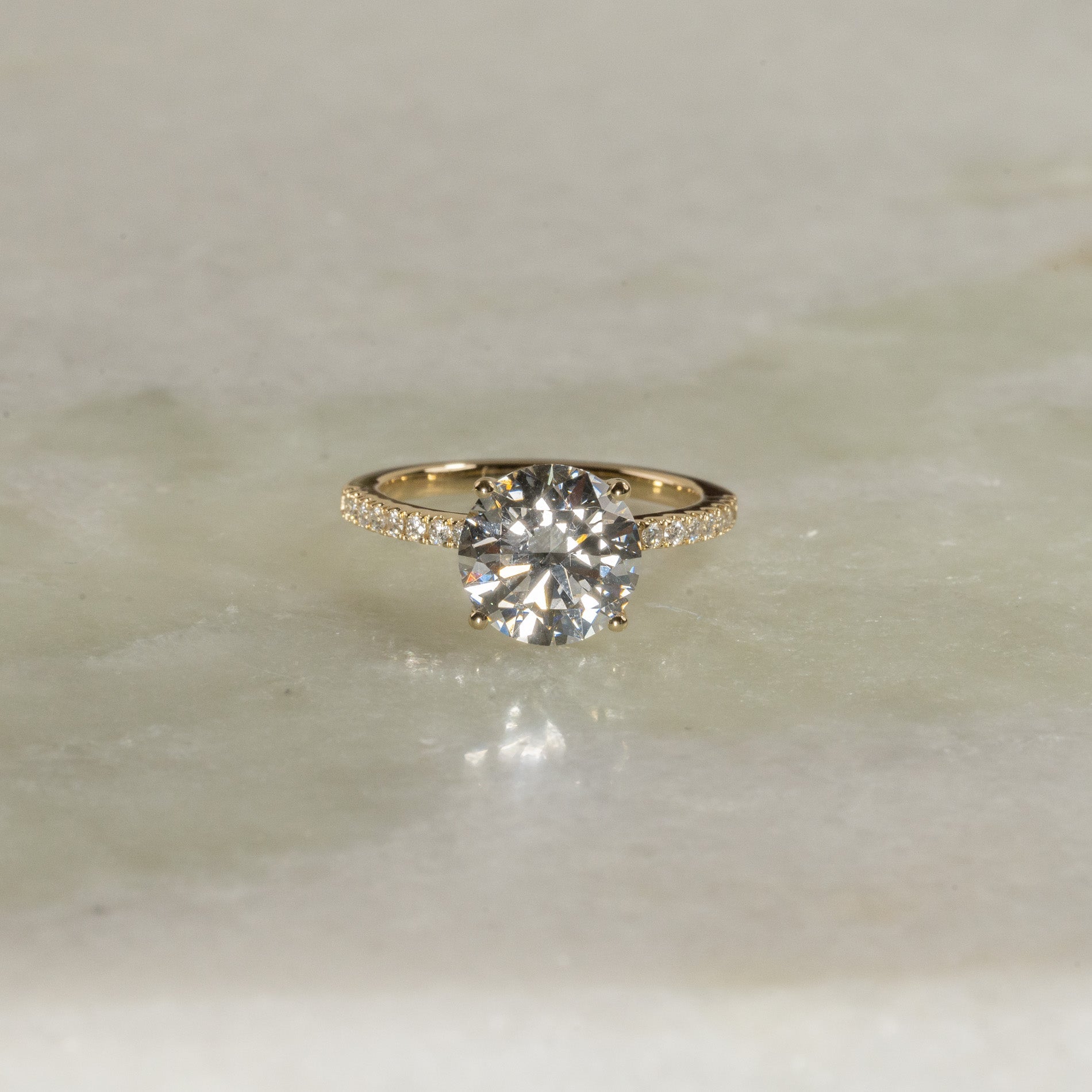 Ringen er laget i 14 karat gull og har et elegant og tidløst uttrykk. Den slanke ringskinnen er utformet som en alliansering, der små lab-grown diamanter omkranser fingeren. I sentrum sitter en vakker 3,0 ct., lab-grown diamant, som virkelig setter prikken over i-en. Til sammen har diamantene en vekt på 3,1 ct. med fargen River og klarhet på VVS1.