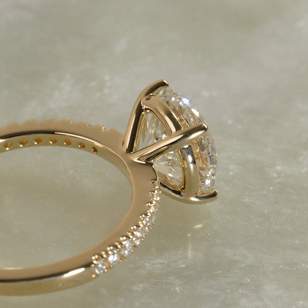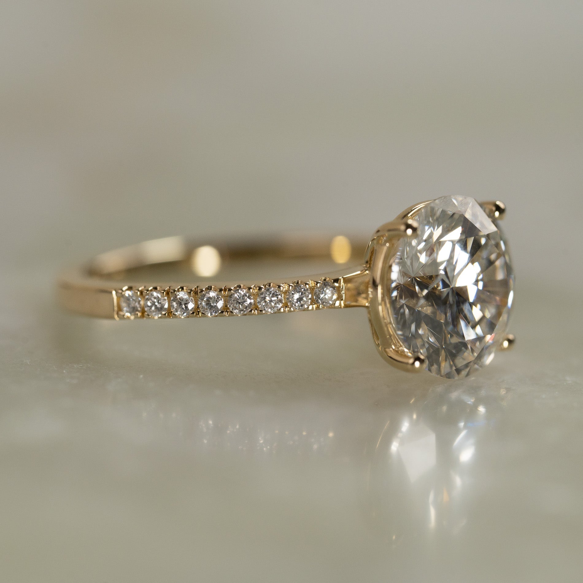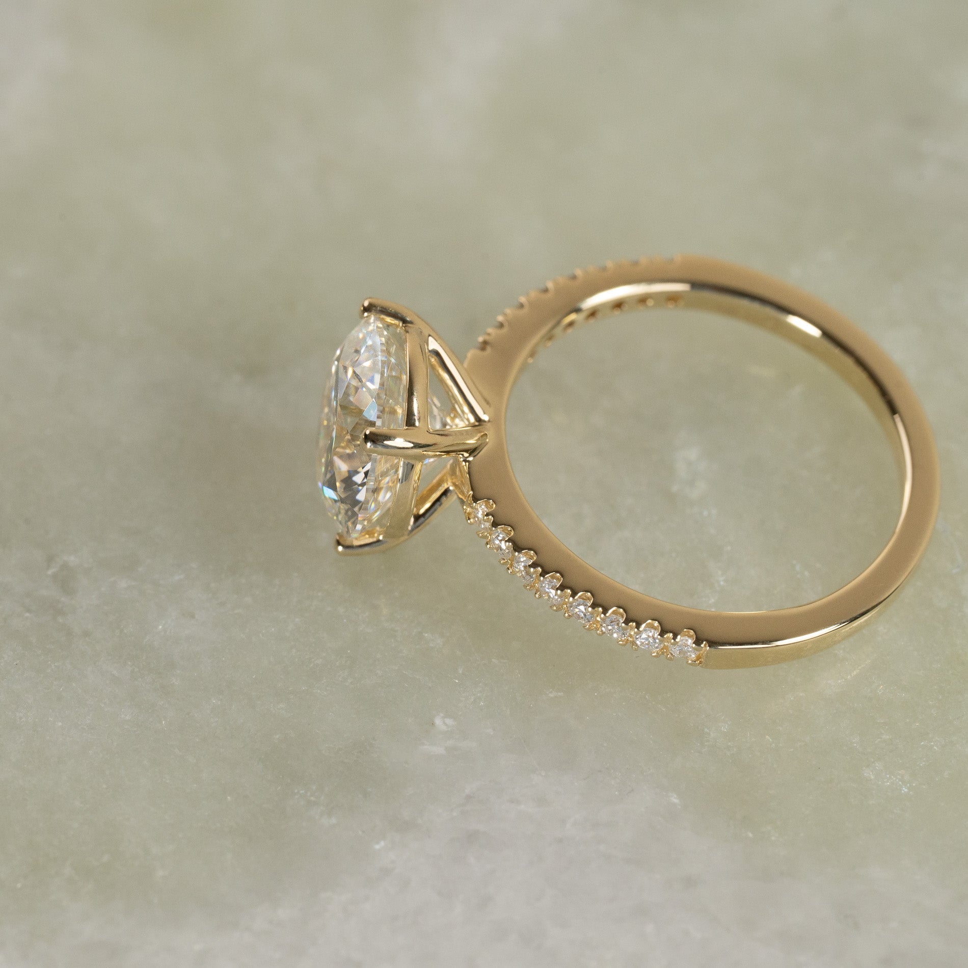 Ringen er laget i 14 karat gull og har et elegant og tidløst uttrykk. Den slanke ringskinnen er utformet som en alliansering, der små lab-grown diamanter omkranser fingeren. I sentrum sitter en vakker 3,0 ct., lab-grown diamant, som virkelig setter prikken over i-en. Til sammen har diamantene en vekt på 3,1 ct. med fargen River og klarhet på VVS1.