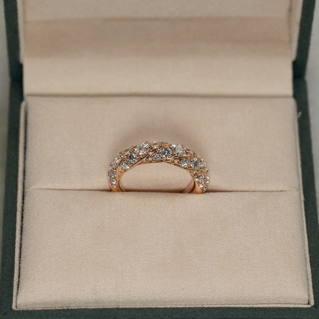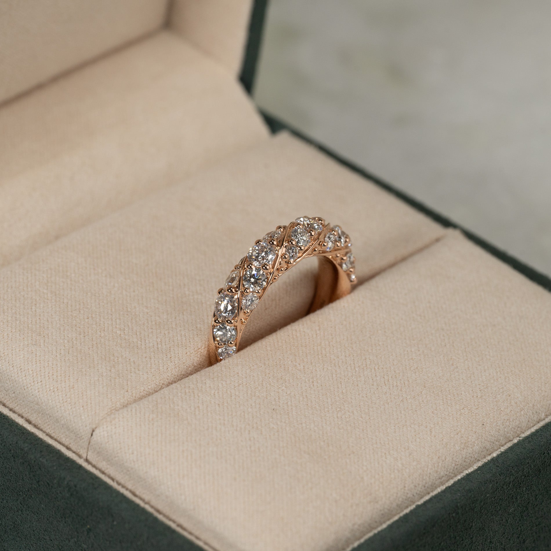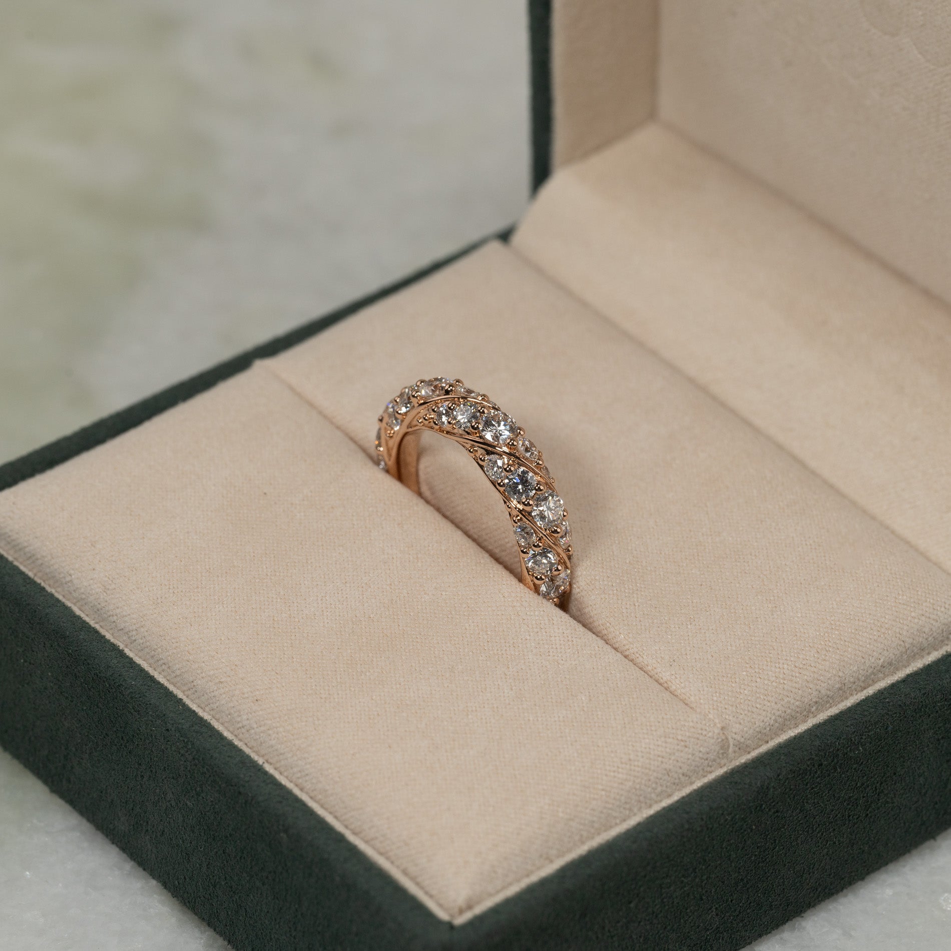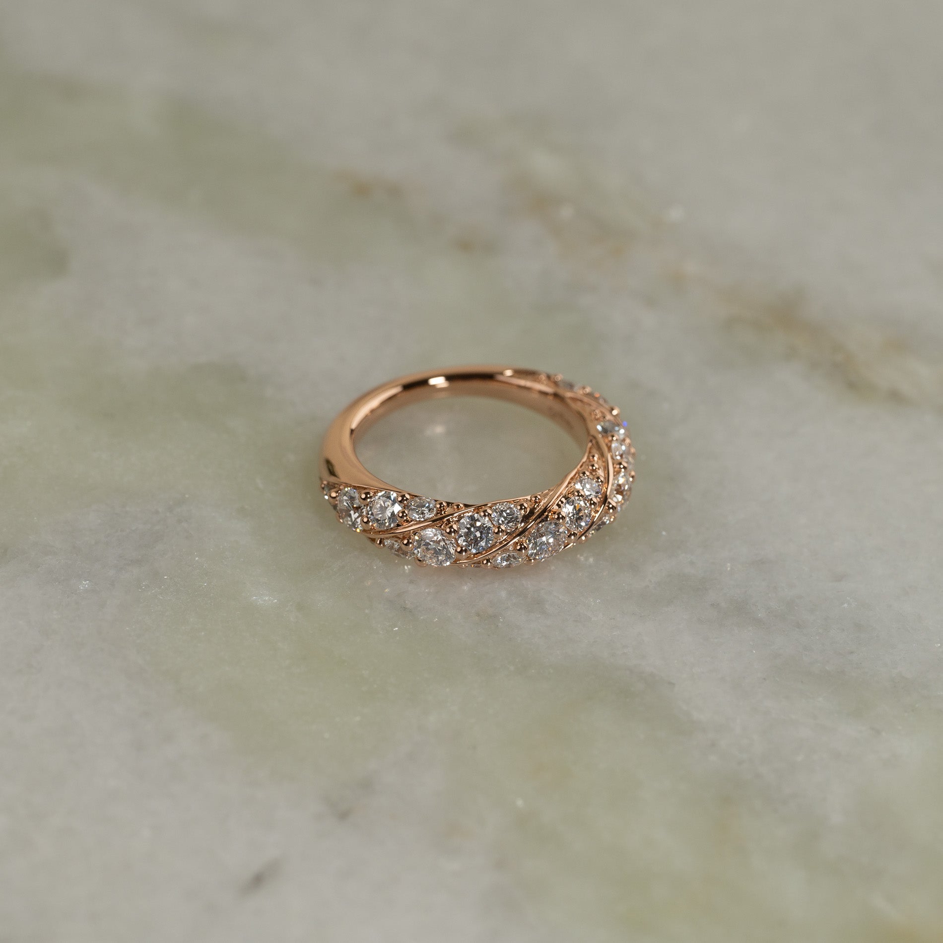 Ringen er laget i 18 karat rosegull og har en elegant tvunnet allianse-innfatning, der diamantene vakkert følger ringens buede form. Designet skaper et naturlig og eksklusivt uttrykk, som fremhever diamantenes lys og glans fra alle vinkler. Med en samlet vekt på 2.64 ct. er diamantene av beste kvalitet, med fargen River og klarhet VVS1.