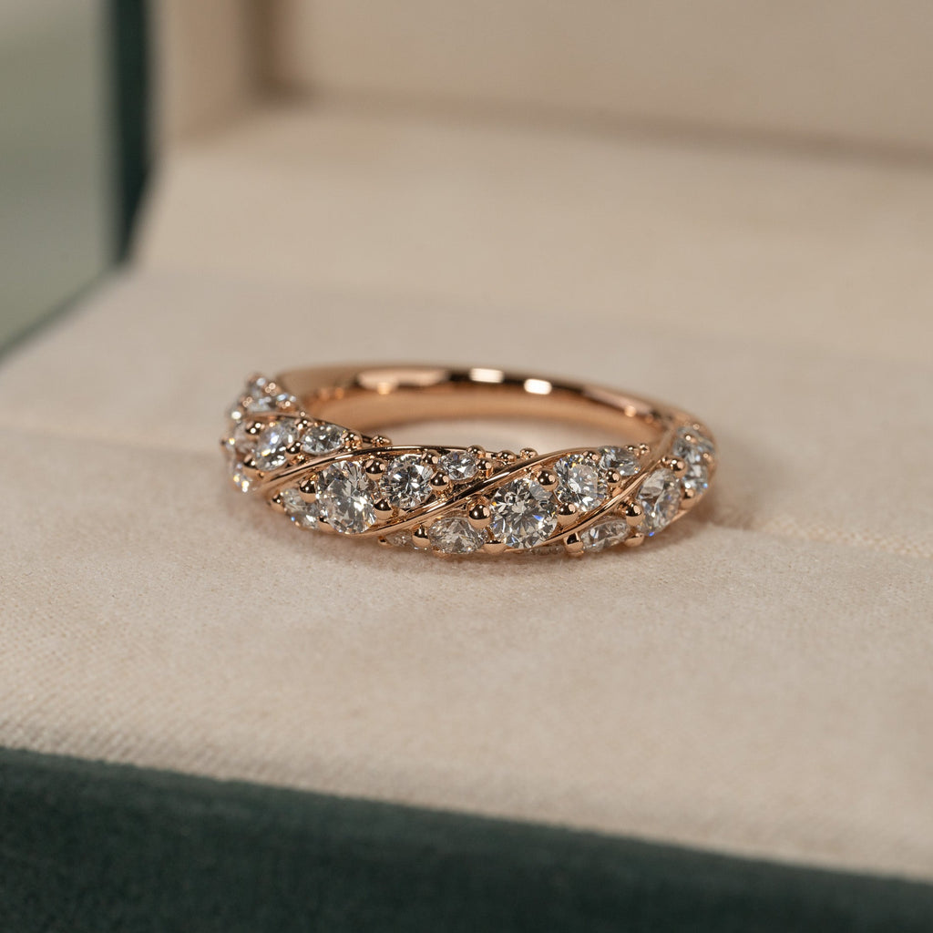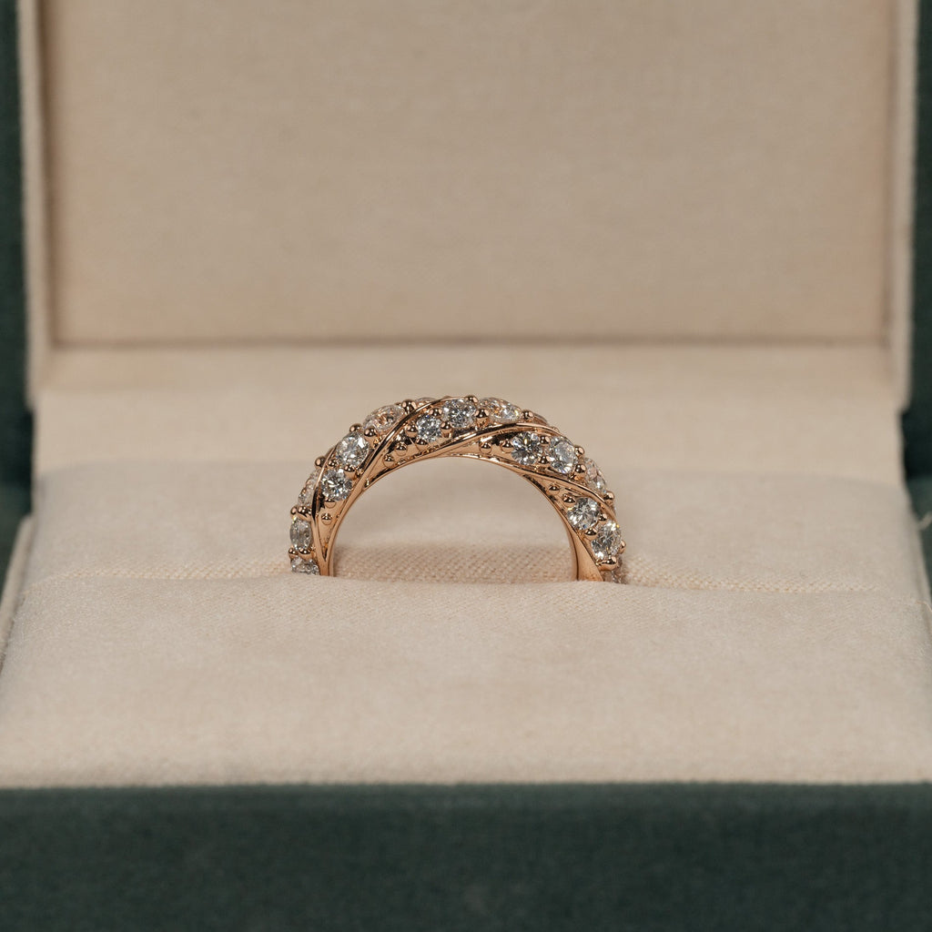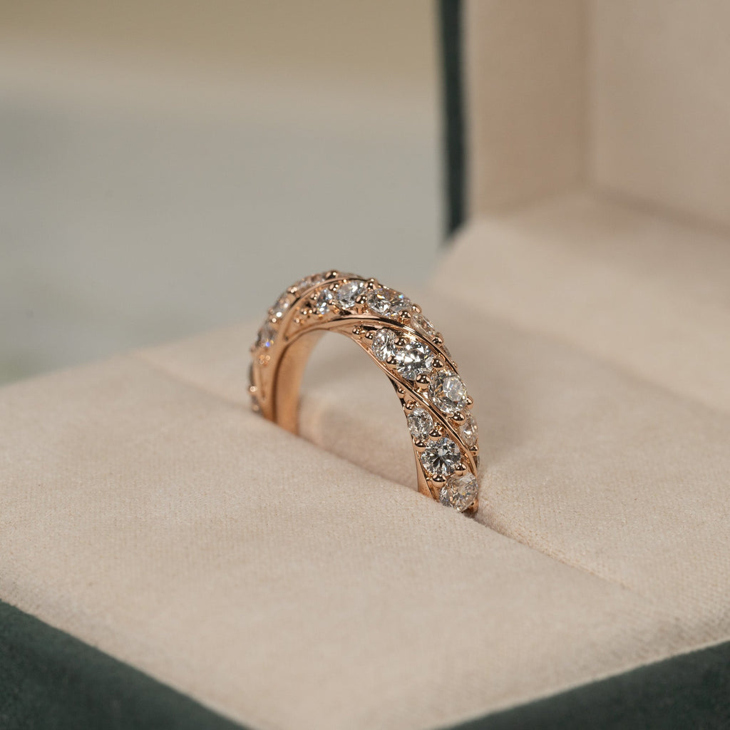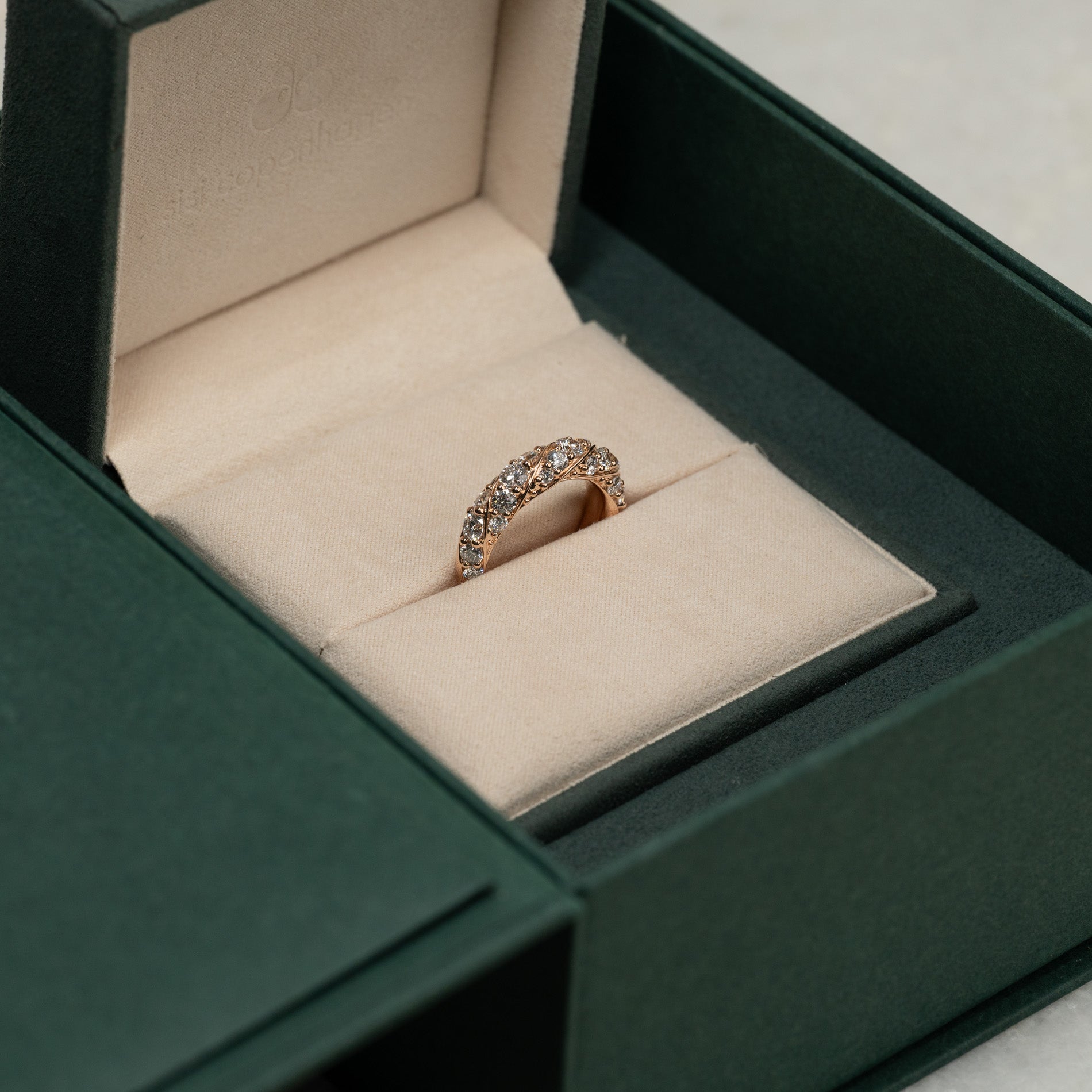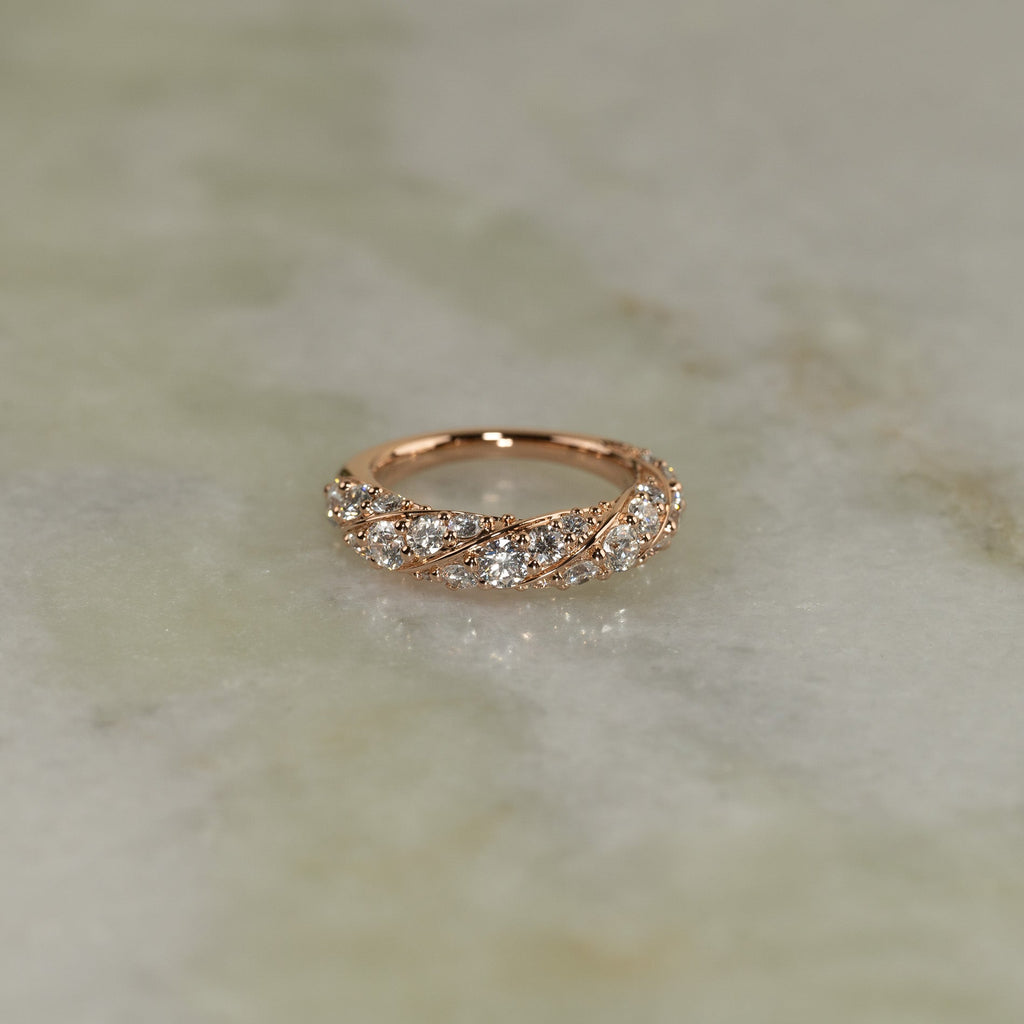 Ringen er laget i 18 karat rosegull og har en elegant tvunnet allianse-innfatning, der diamantene vakkert følger ringens buede form. Designet skaper et naturlig og eksklusivt uttrykk, som fremhever diamantenes lys og glans fra alle vinkler. Med en samlet vekt på 2.64 ct. er diamantene av beste kvalitet, med fargen River og klarhet VVS1.