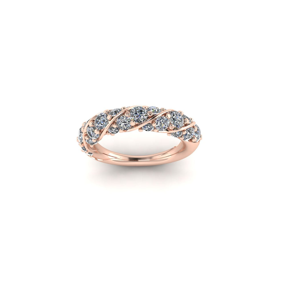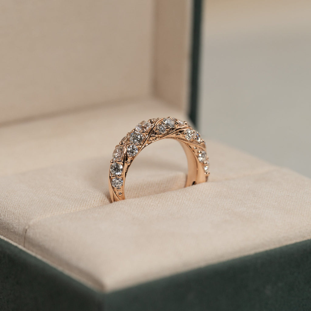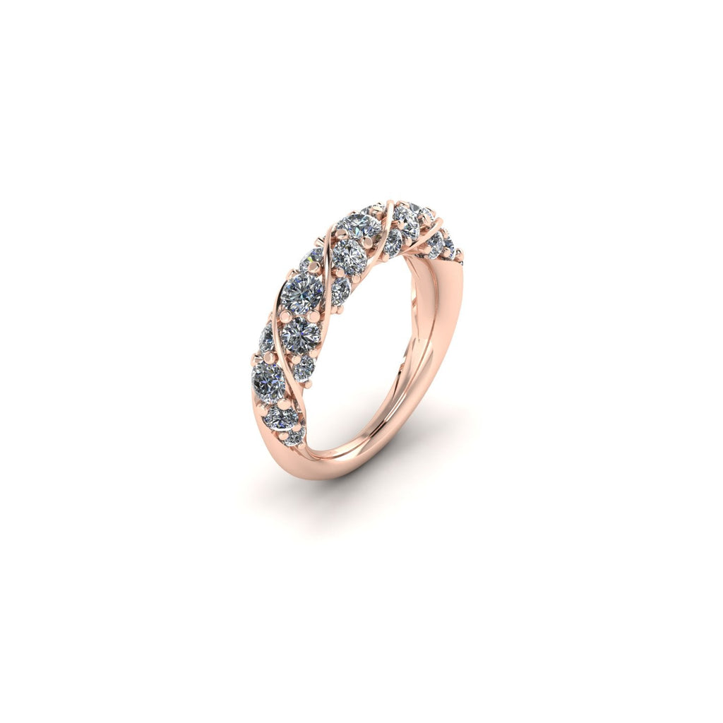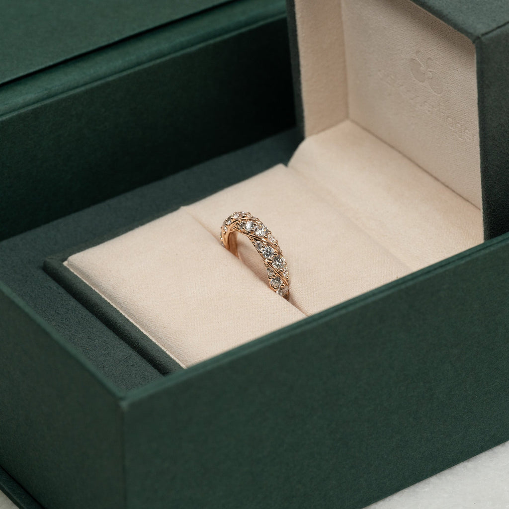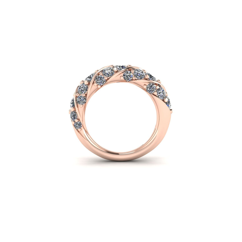 Ringen er laget i 18 karat rosegull og har en elegant tvunnet allianse-innfatning, der diamantene vakkert følger ringens buede form. Designet skaper et naturlig og eksklusivt uttrykk, som fremhever diamantenes lys og glans fra alle vinkler. Med en samlet vekt på 2.64 ct. er diamantene av beste kvalitet, med fargen River og klarhet VVS1.