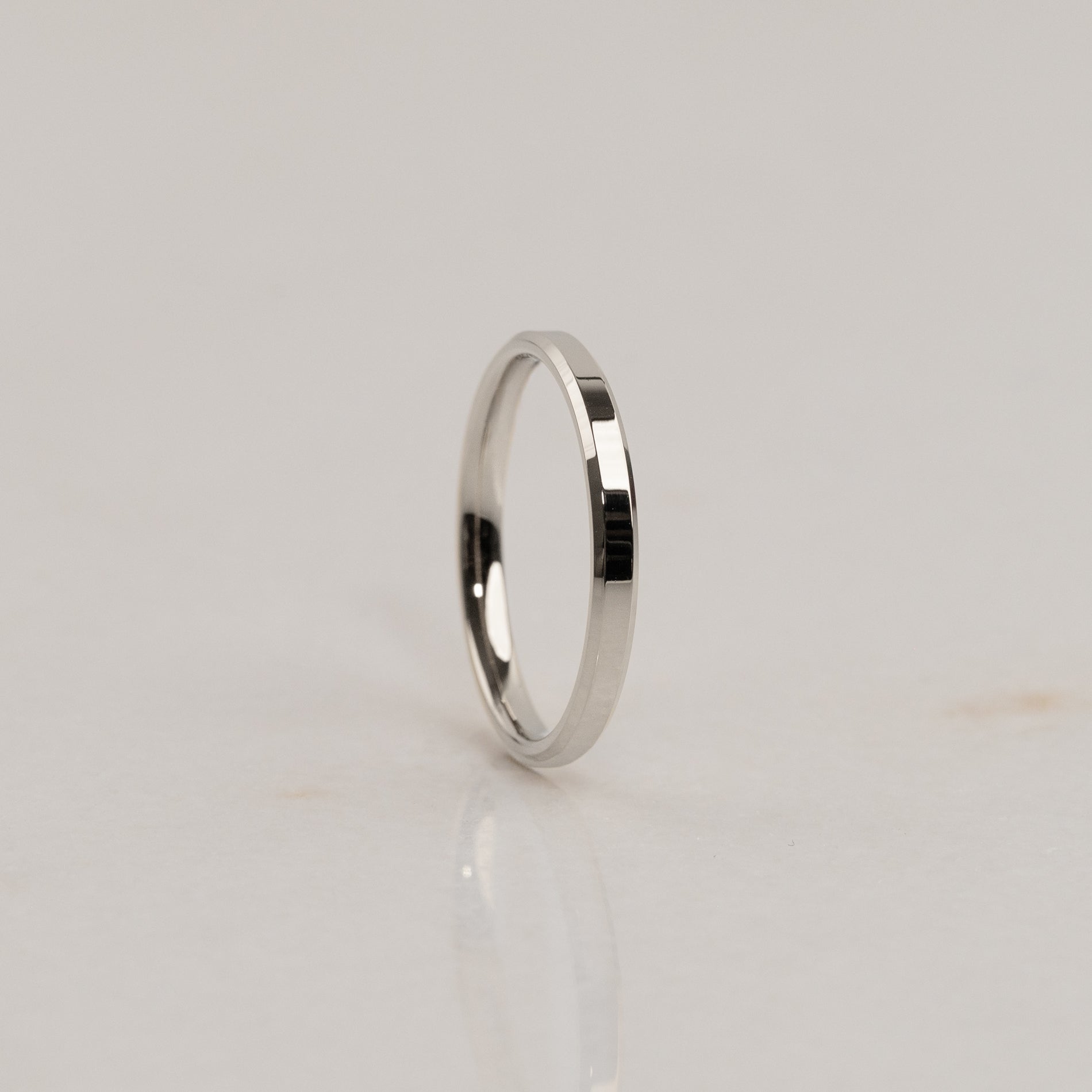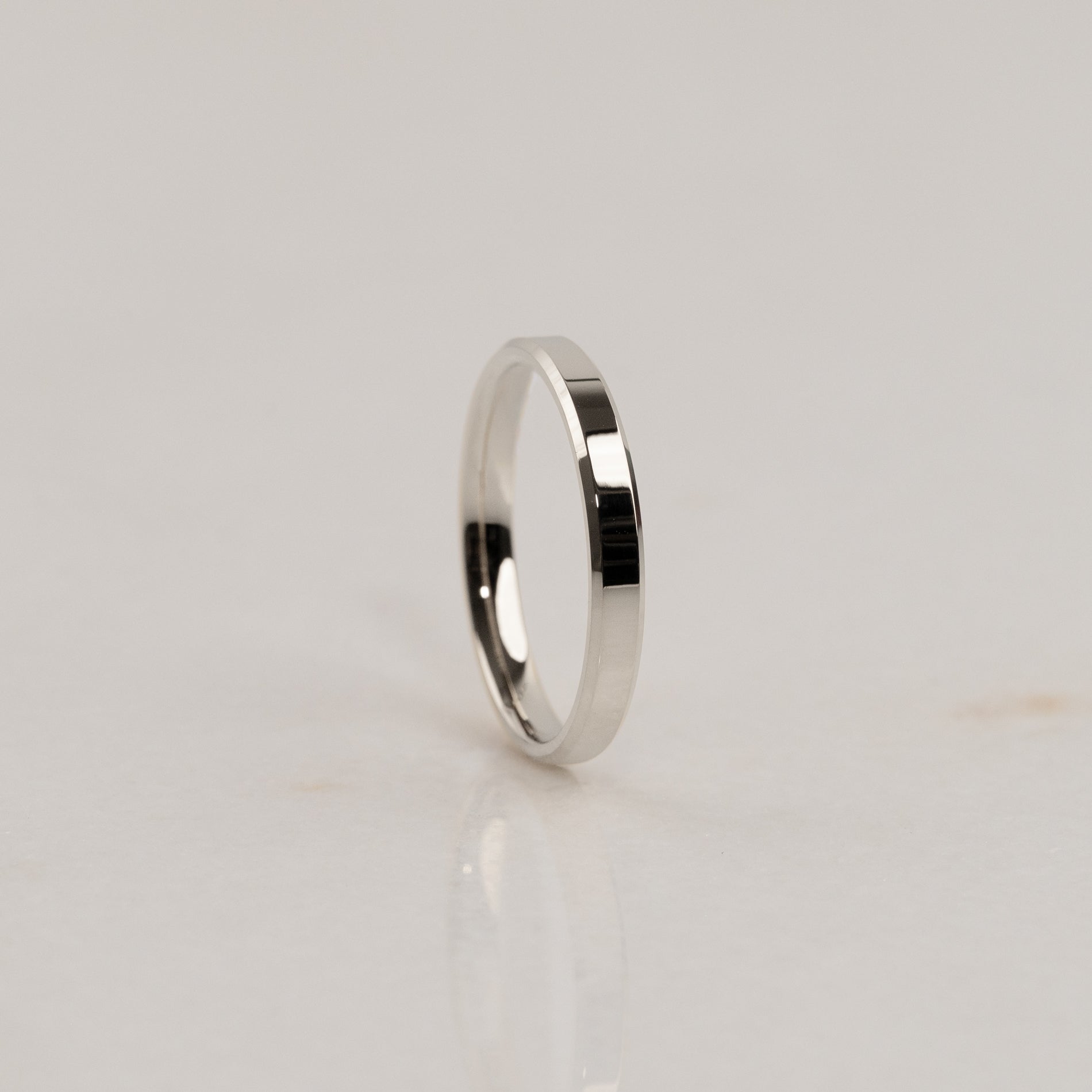 Vår Beveled Flat Comfort-profil er en moderne giftering med et minimalistisk uttrykk. Den flate yttersiden, kombinert med de fasetterte kantene, gir ringen et markant og rent uttrykk, mens den lett avrundede innsiden sørger for en behagelig passform.