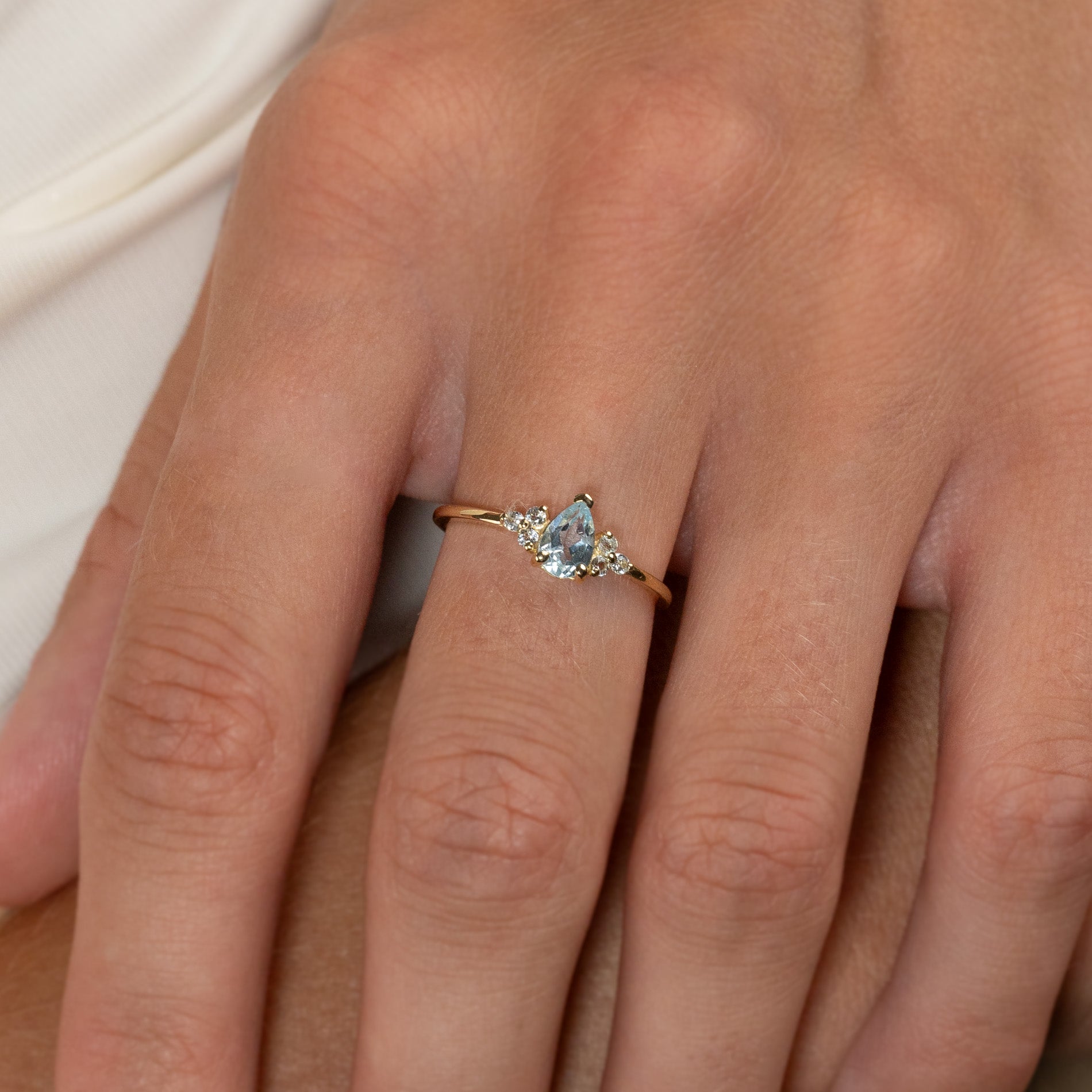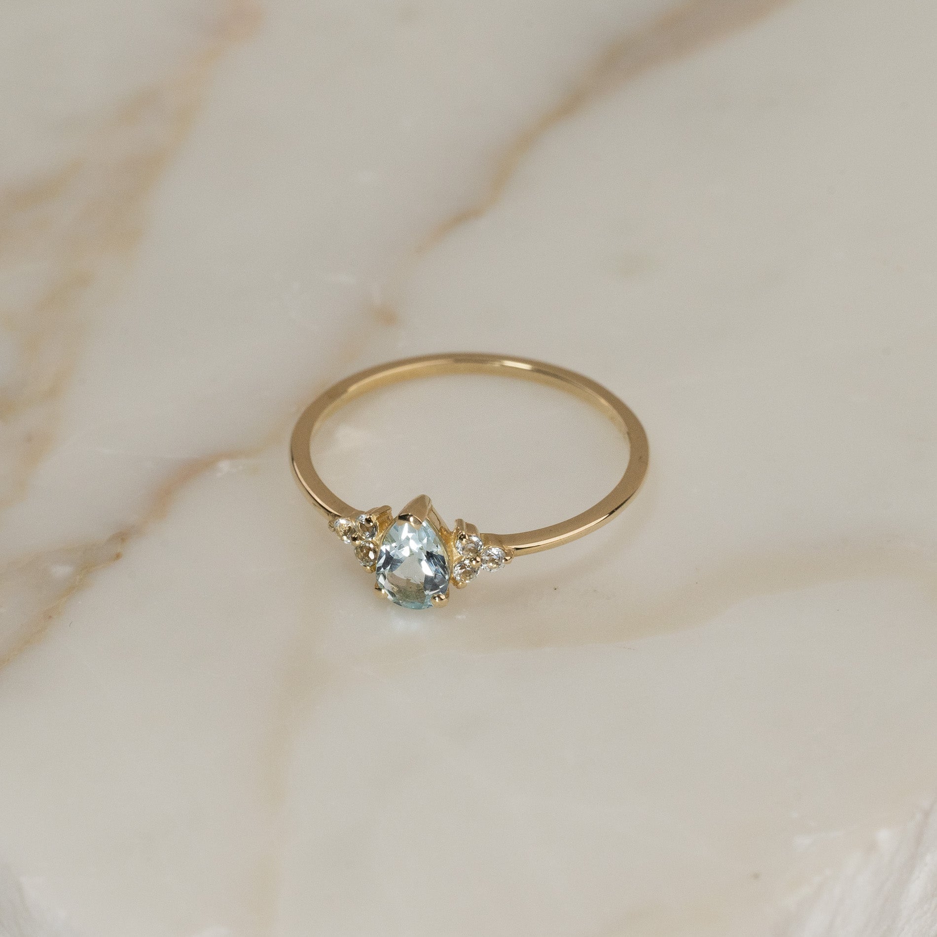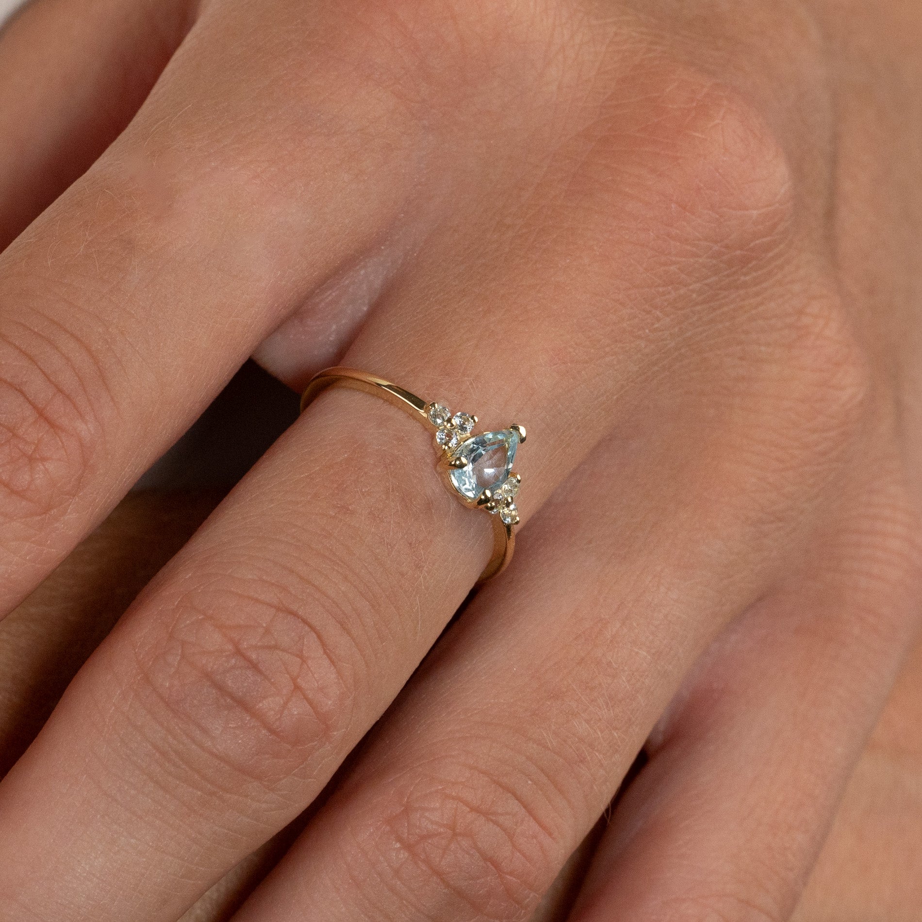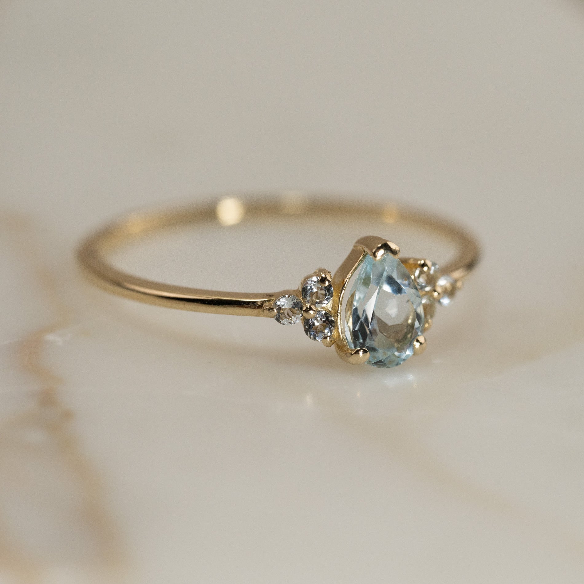 Ringen består av en dråpeformet 6x4mm blå topas, som sitter i midten omgitt av tre, små sten på hver side. Dette gir ringen et utrolig vakkert og elegant uttrykk.