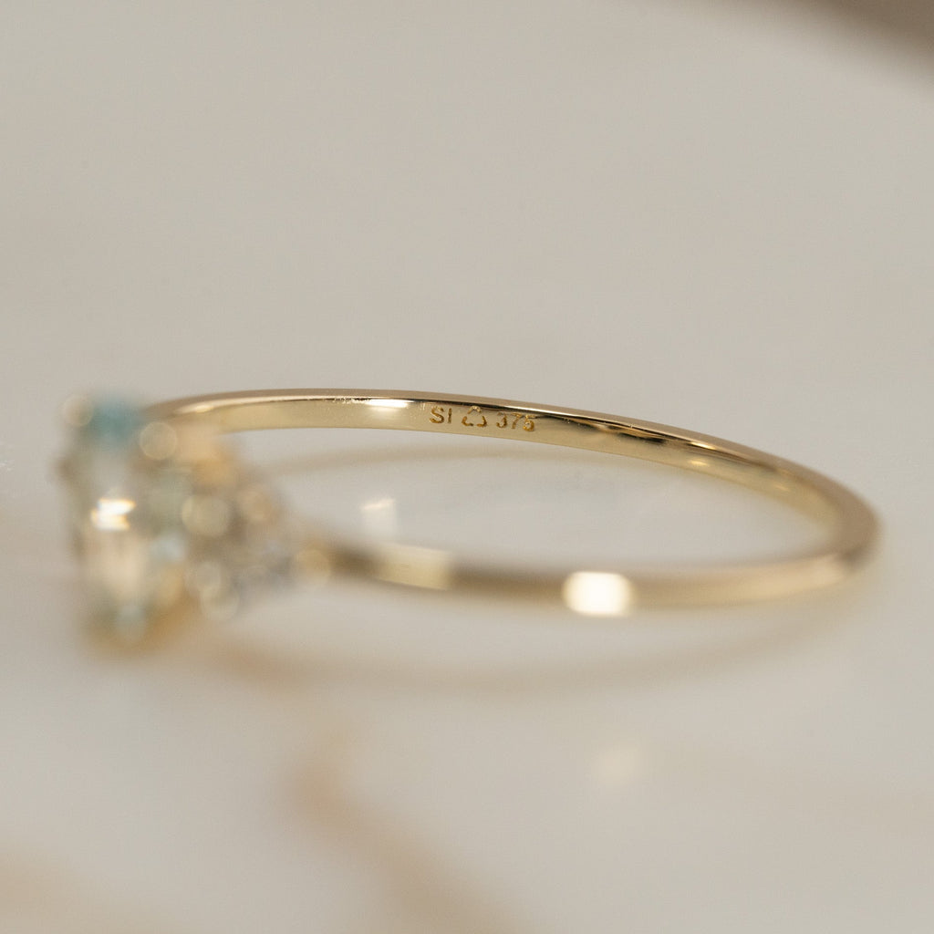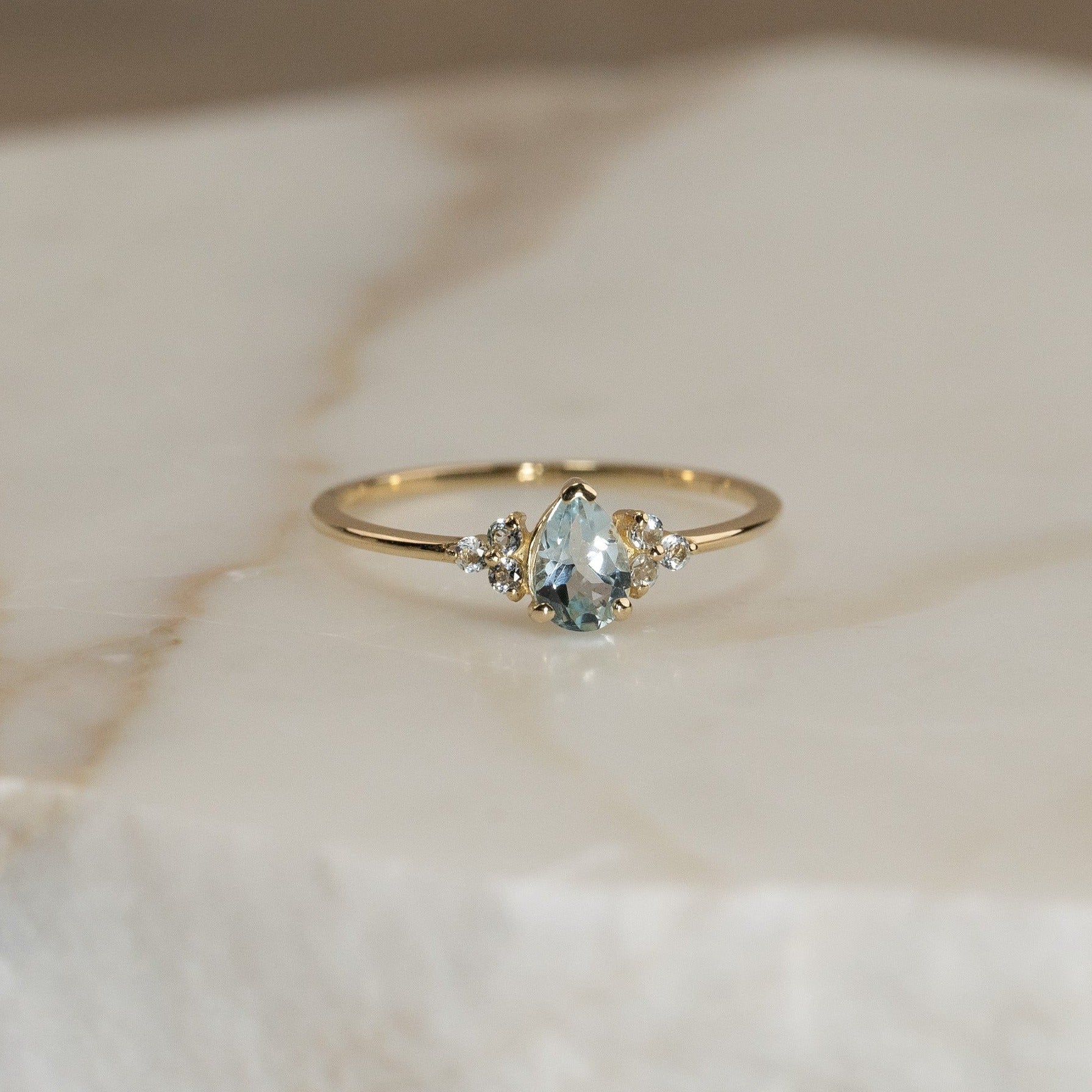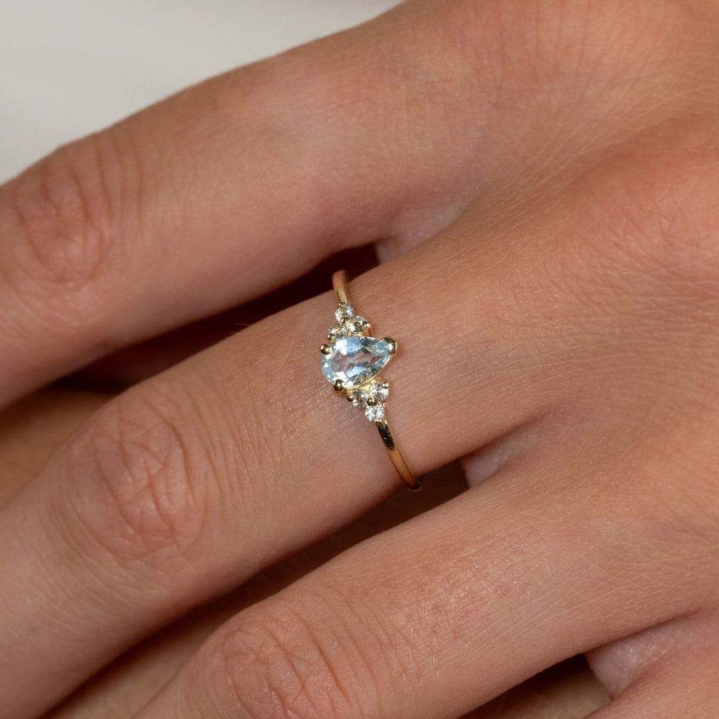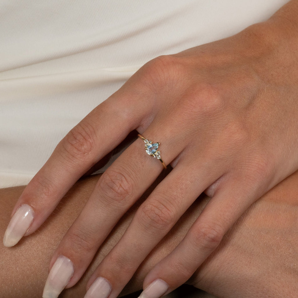 Ringen består av en dråpeformet 6x4mm blå topas, som sitter i midten omgitt av tre, små sten på hver side. Dette gir ringen et utrolig vakkert og elegant uttrykk.