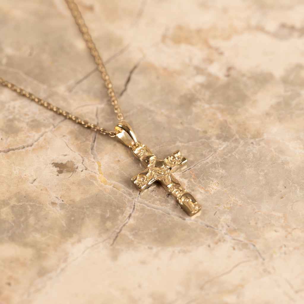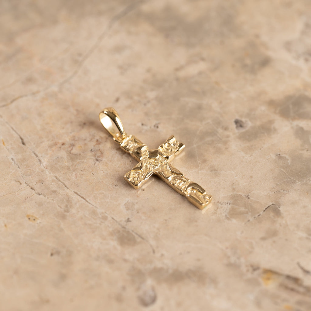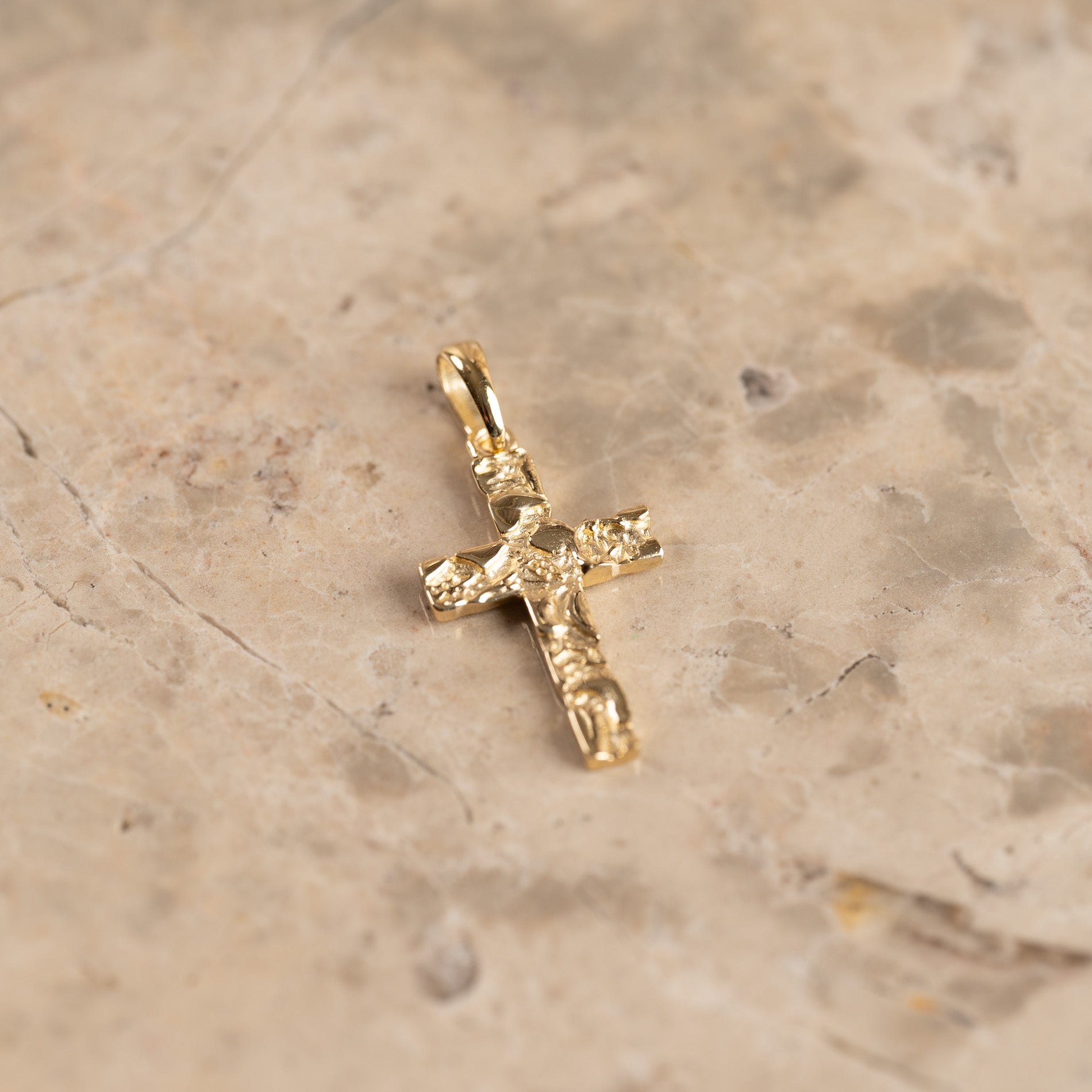 Dette anhenget er laget i 100% resirkulert 9 karat massivt gull. Anhenget har en moderne vri på et klassisk smykke; korset har en smeltet overflate med fine detaljer og et rustikt look. Smykket er perfekt om man ønsker et kristent symbol som også har et moderne uttrykk. En god konfirmasjonsgave til både gutter og jenter.