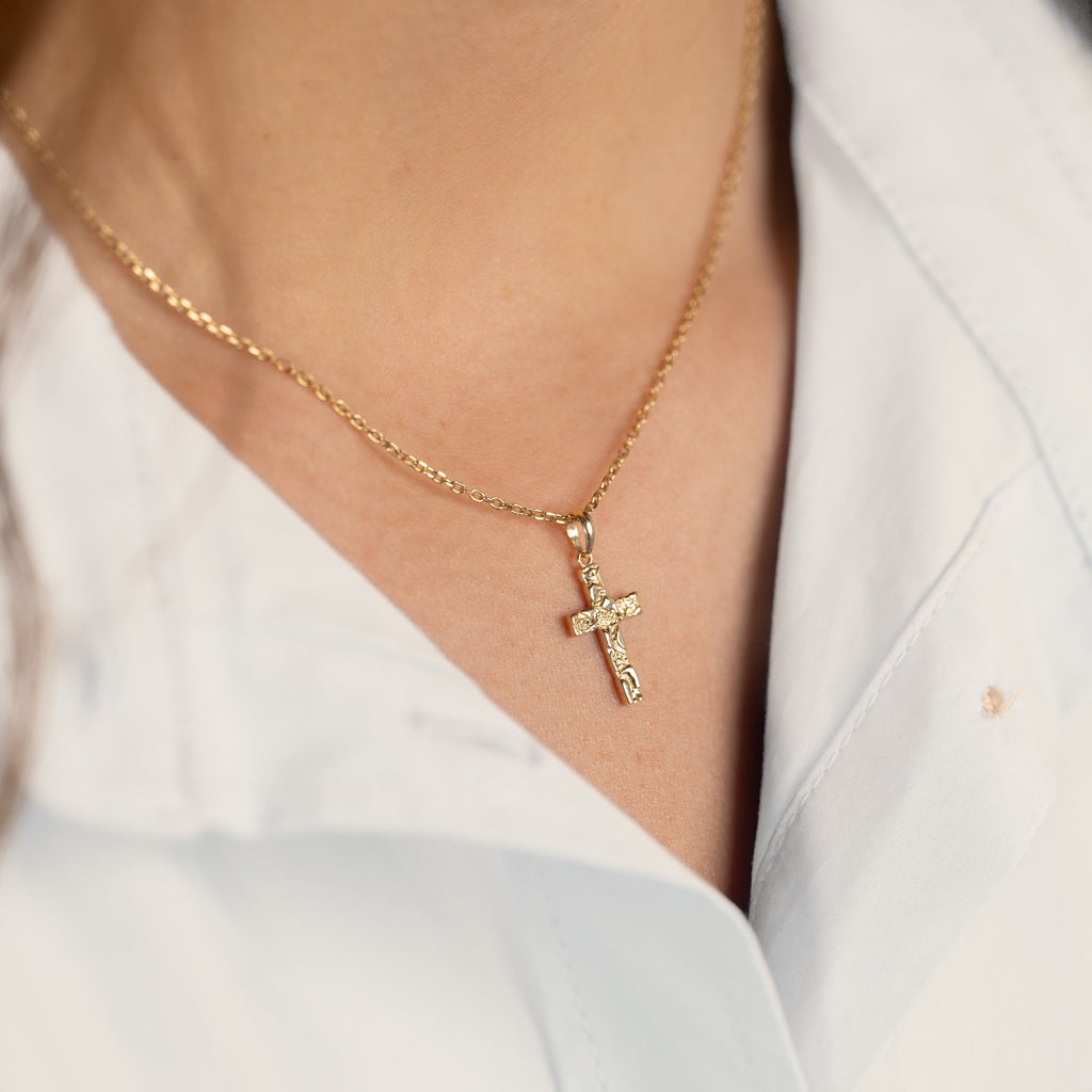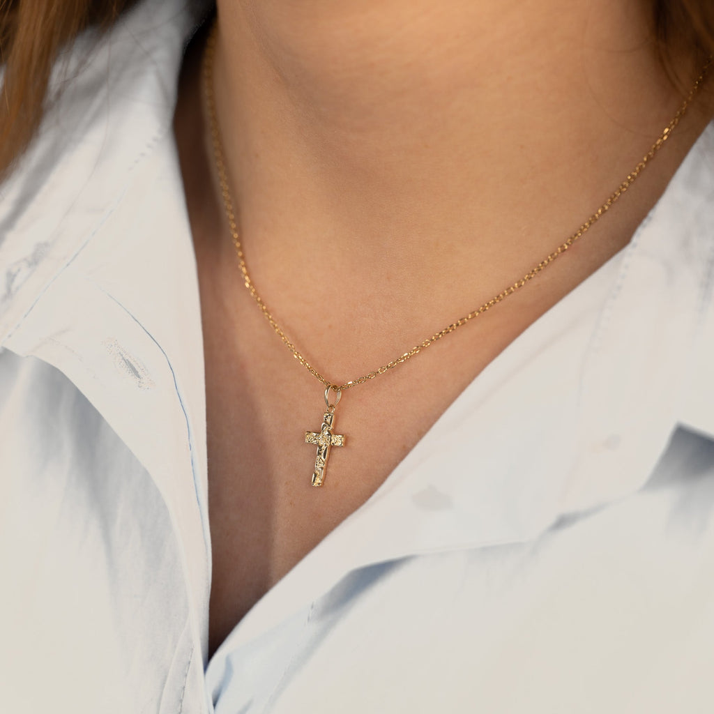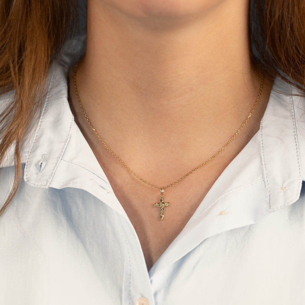 Dette anhenget er laget i 100% resirkulert 9 karat massivt gull. Anhenget har en moderne vri på et klassisk smykke; korset har en smeltet overflate med fine detaljer og et rustikt look. Smykket er perfekt om man ønsker et kristent symbol som også har et moderne uttrykk. En god konfirmasjonsgave til både gutter og jenter.