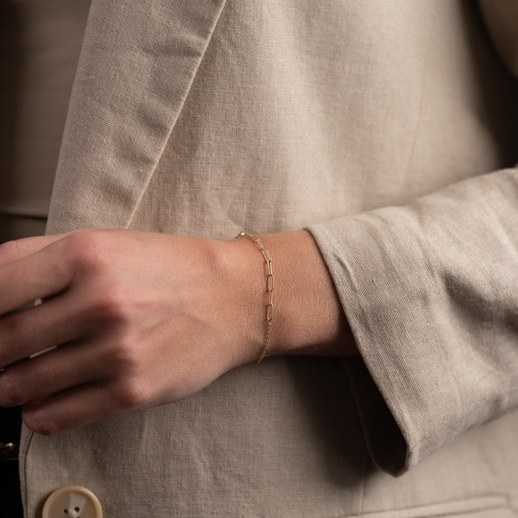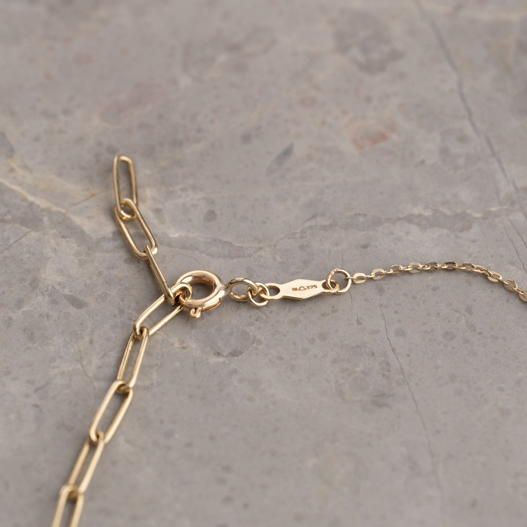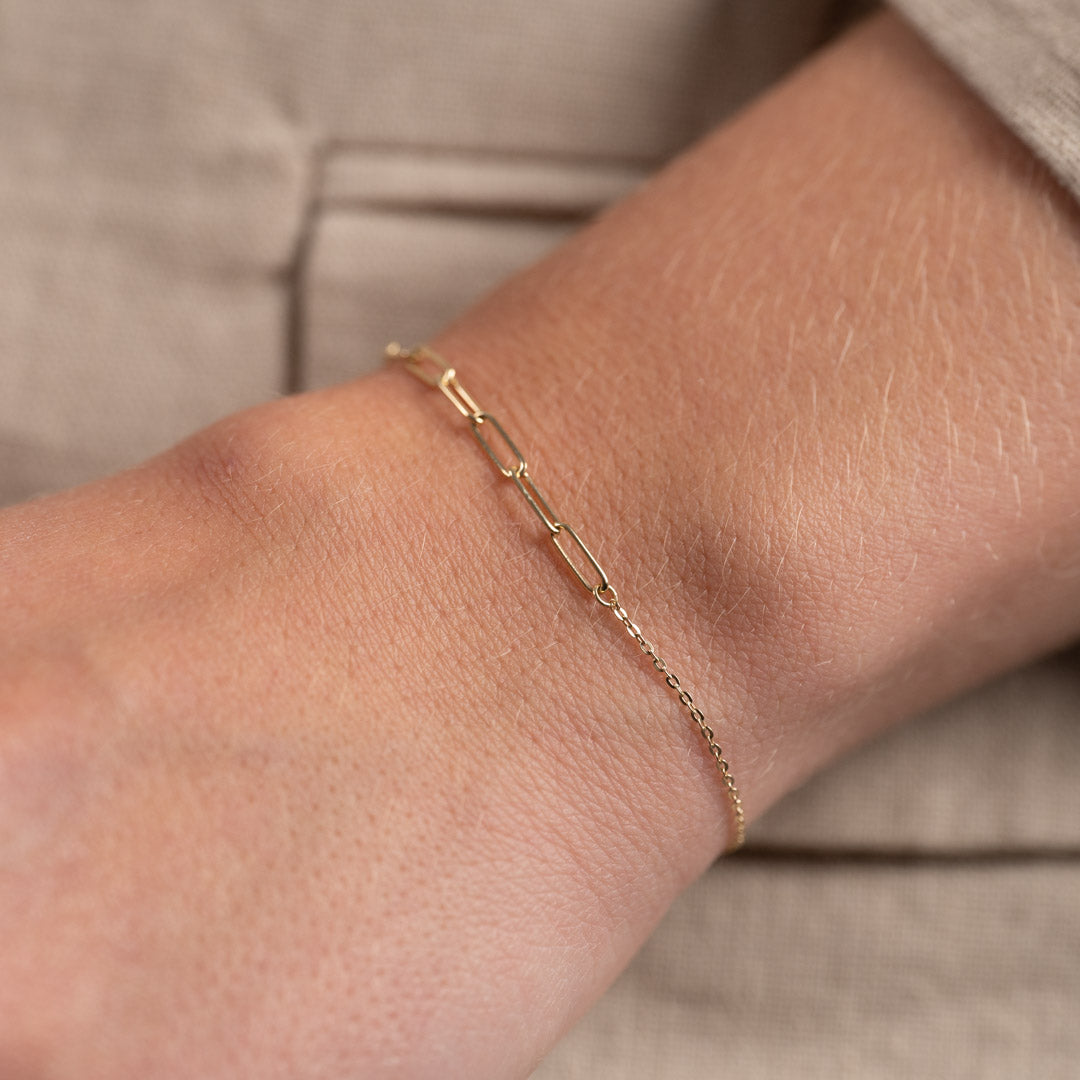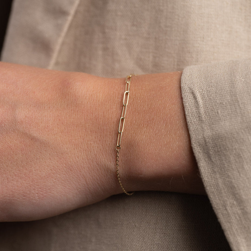 Vårt Charlize Gull-armbånd er laget av 100% resirkulert 9 karat massivt gull. Armbåndet er laget med to forskjellige kjeder; 10 cm 'Paper Clips' ledd og 10 cm av vårt fine ankerkjede. Armbåndets lengde justeres direkte i de store 'Paper Clips'-leddene, og kan på den måten justeres til en passende lengde mellom 10 og 20 cm.