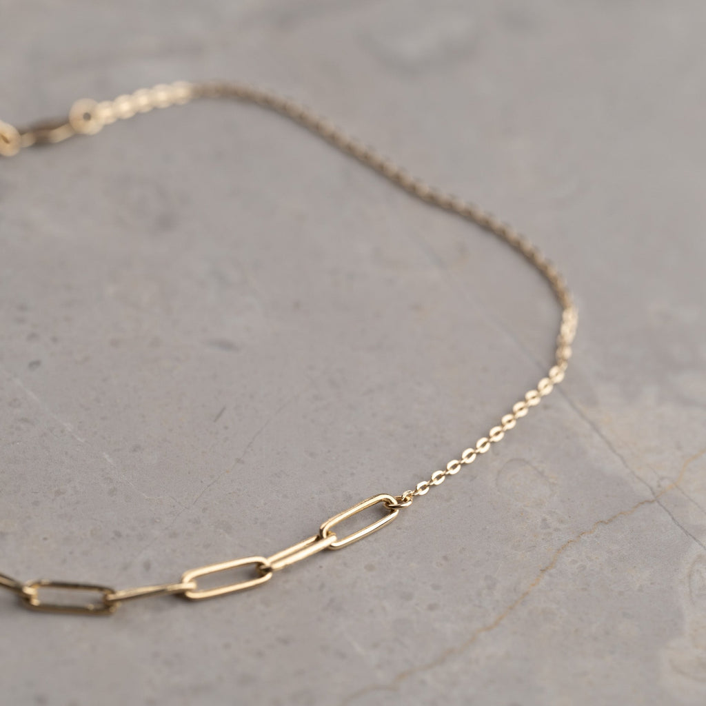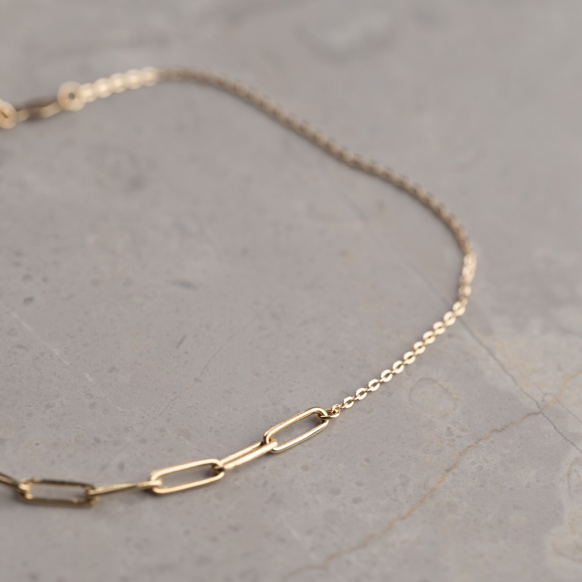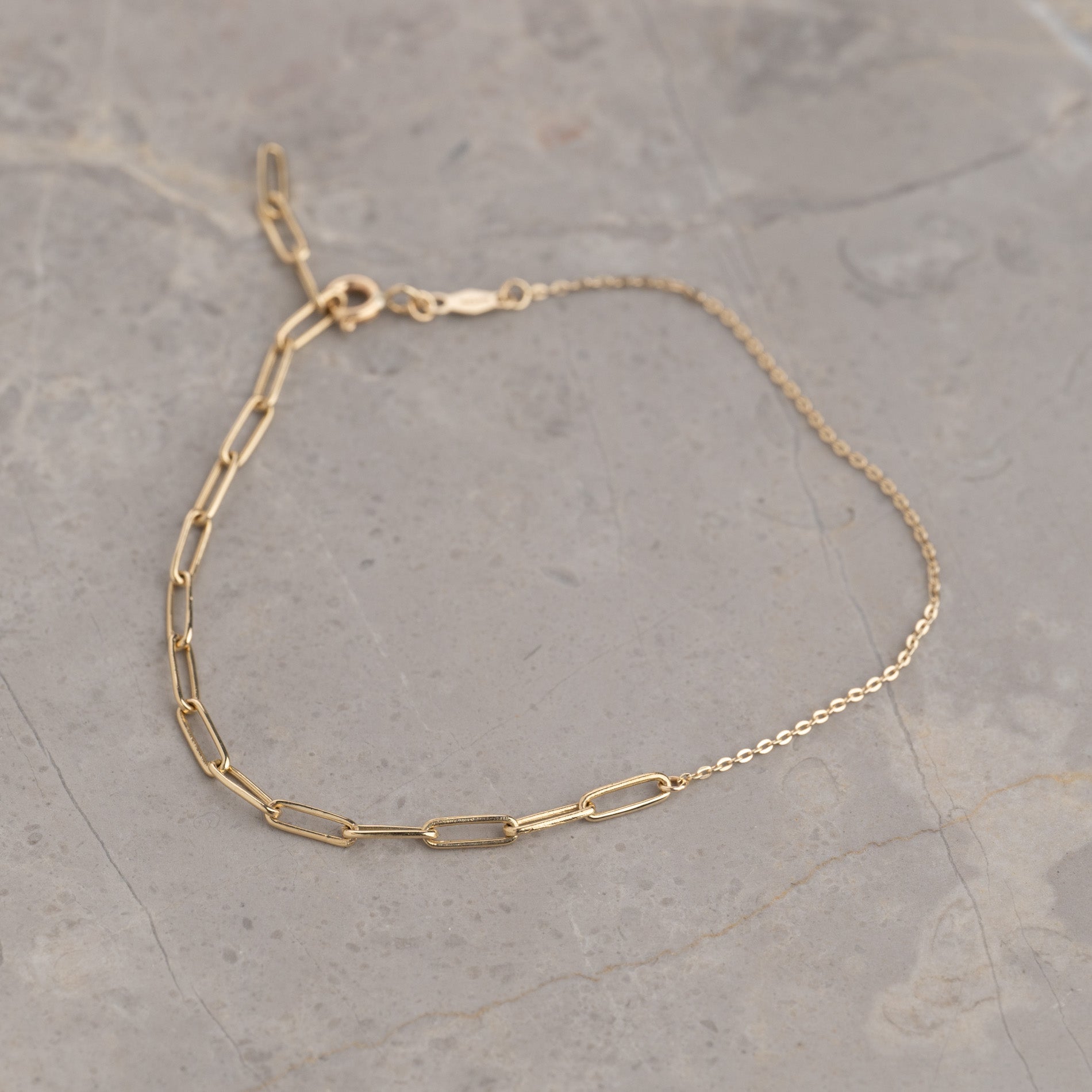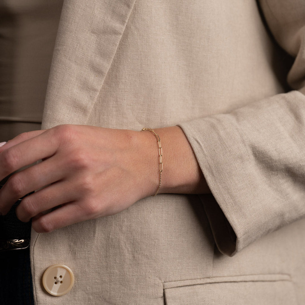 Vårt Charlize Gull-armbånd er laget av 100% resirkulert 9 karat massivt gull. Armbåndet er laget med to forskjellige kjeder; 10 cm 'Paper Clips' ledd og 10 cm av vårt fine ankerkjede. Armbåndets lengde justeres direkte i de store 'Paper Clips'-leddene, og kan på den måten justeres til en passende lengde mellom 10 og 20 cm.