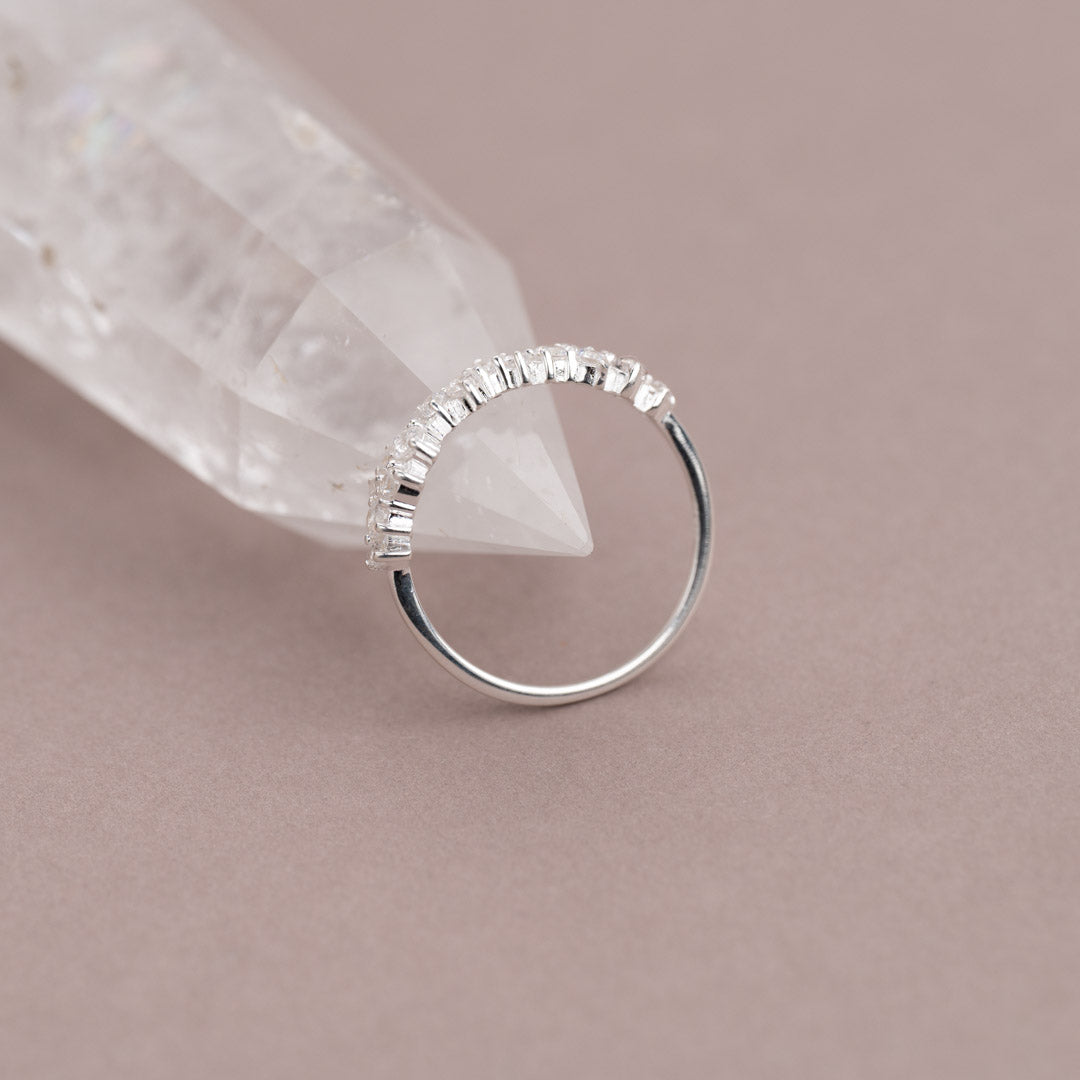 Vår ring Clair har en feminin eleganse med de vakre zirkoniastenene som glitrer i lyset. Designet har også et organisk uttrykk med stenene på forsiden av ringen.