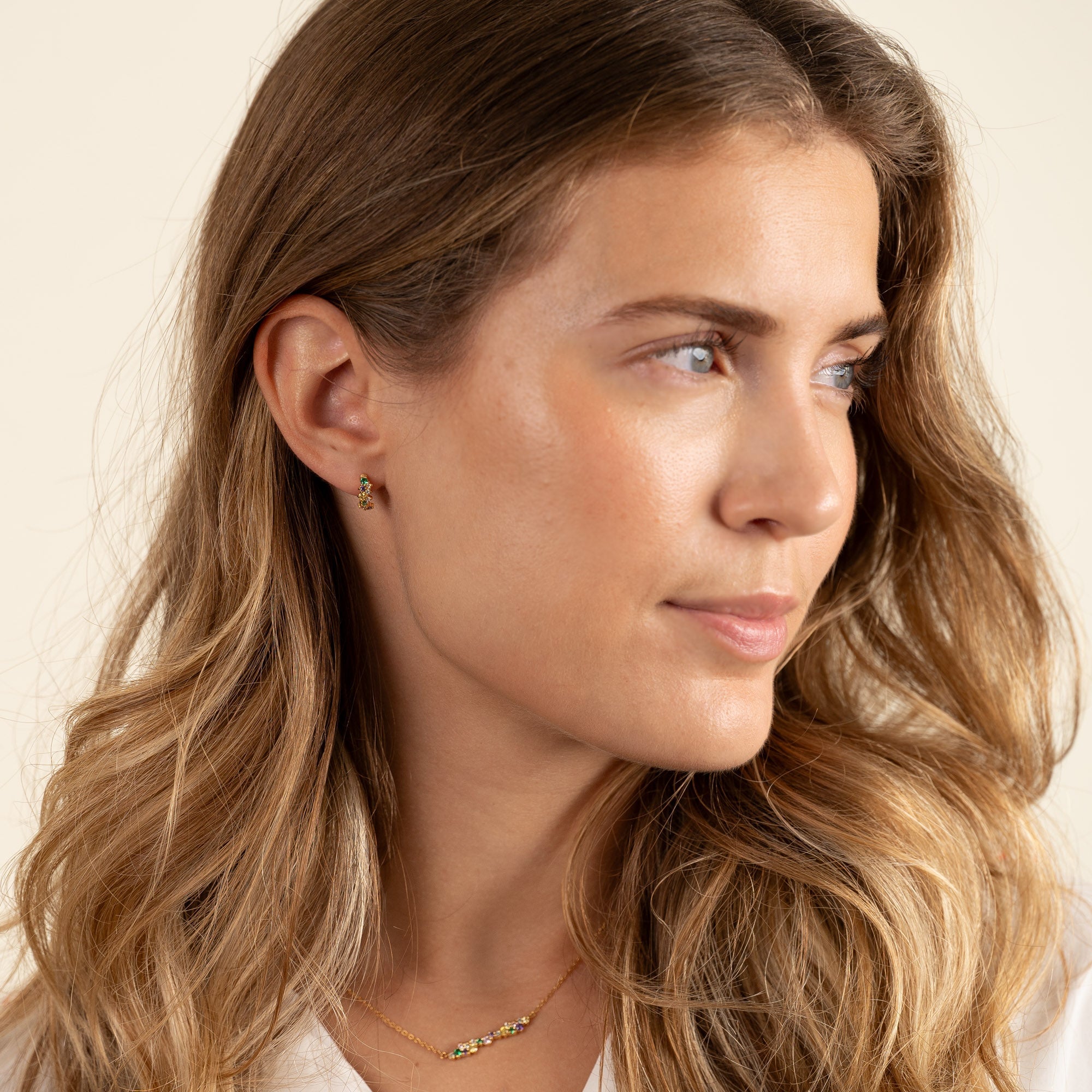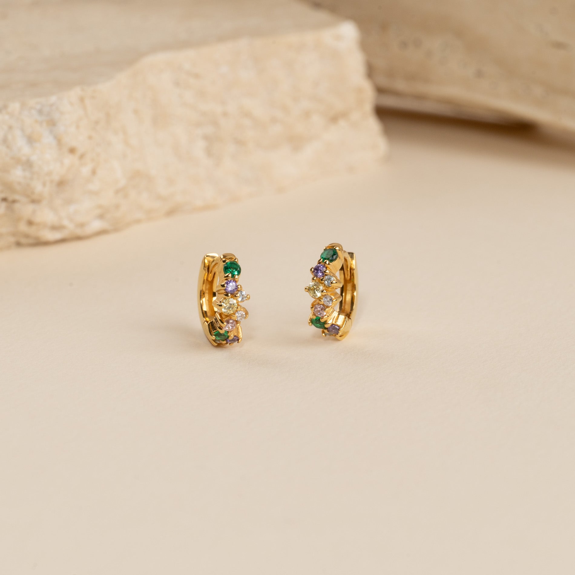 Øreringer i resirkulert 18 karat forgylt sterlingsølv med fargerike, kubiske zirkoniasten i ulike størrelser. De små øreringene har et organisk og feminint uttrykk med de små, hvite zirkoniastenene som tilfører struktur, samtidig som de glitrer elegant i lyset.