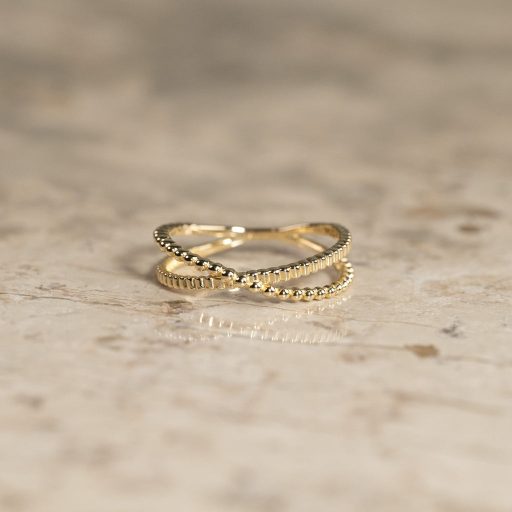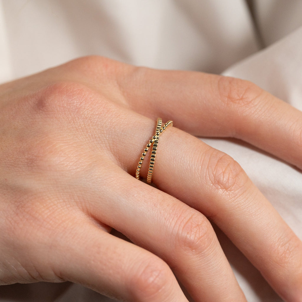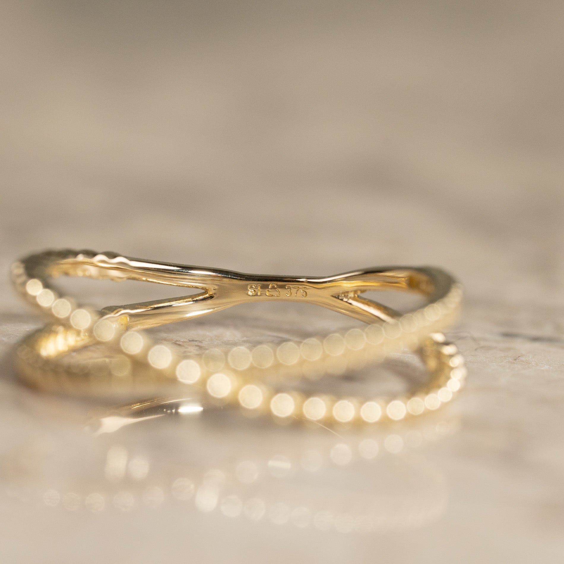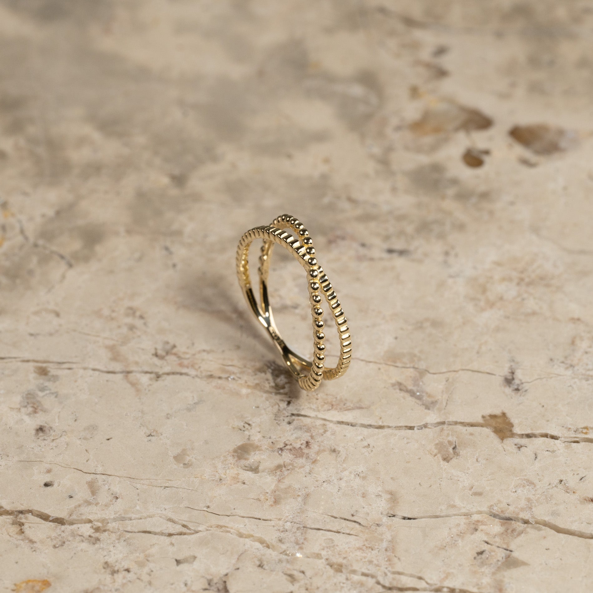Ring skapt i 100% resirkulert massiv 9 karat gull. Den har et elegant kryssmønster med unike detaljer som gjør den både flott og allsidig – perfekt til å bære alene eller sammen med andre av våres ringer.