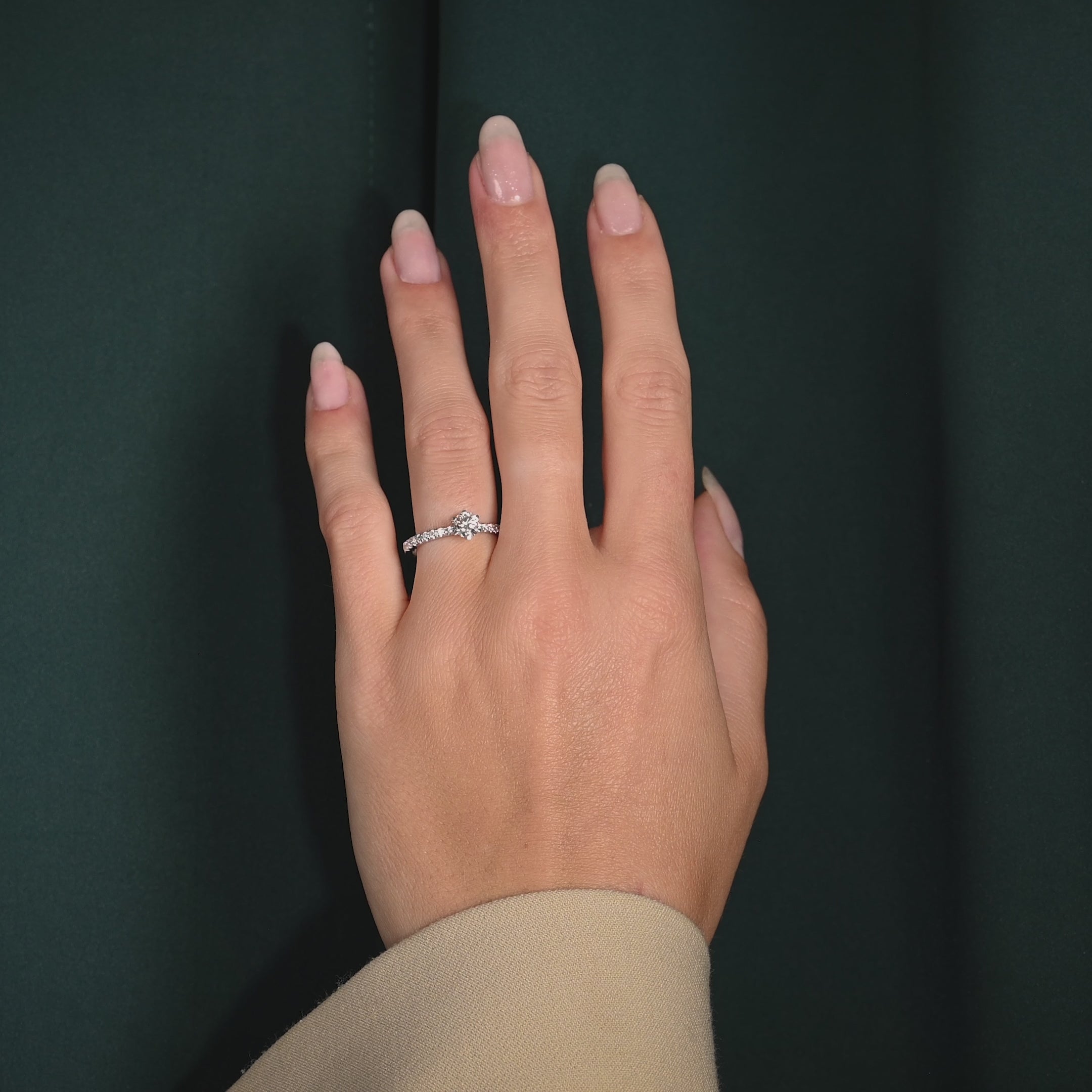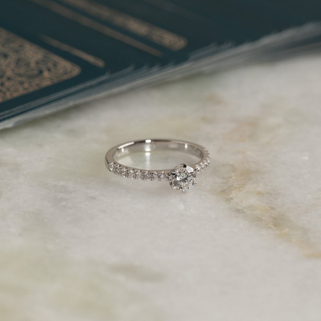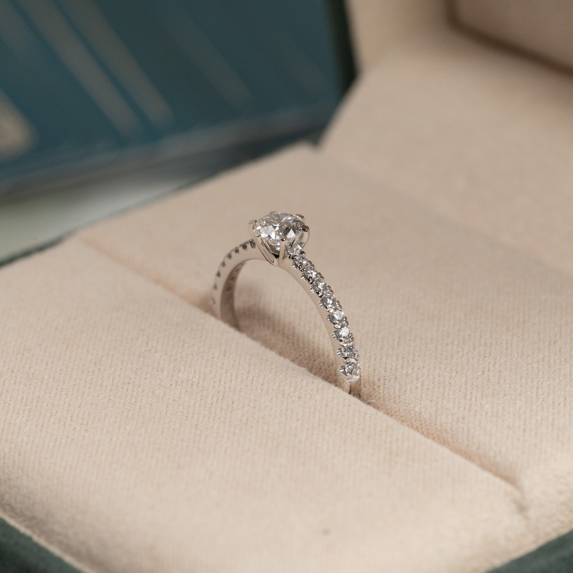 Vakker ring i 14 karat hvitt gull med labgrodde diamanter. Ringen består av en 0,5 ct. sentrum stein satt med 6 spisser. Den er satt med diamanter langs ringskinnen. Ringbåndet er svakt konisk - det vil si at det er bredere nederst og slankere øverst på steinen. En fin detalj som gir ringen balanse og letthet i designet.