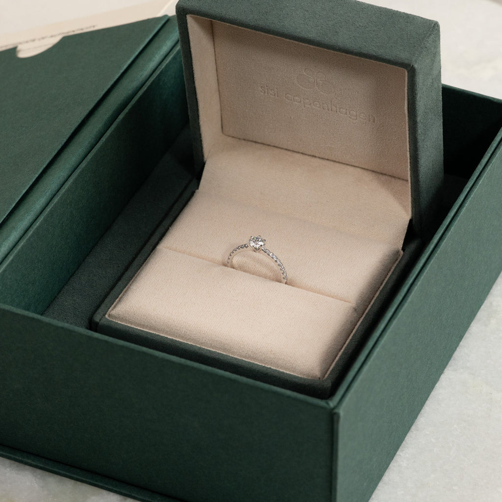 Ringen er laget av 14 karat hvitt gull med laboratoriedyrkede diamanter på til sammen 0,7 ct. Diamantene har fargen E/F (River) og klarheten VVS. Smykkene er laget med omtanke; diamantene er produsert med solenergi, og gullet er 100 % sertifisert resirkulert.