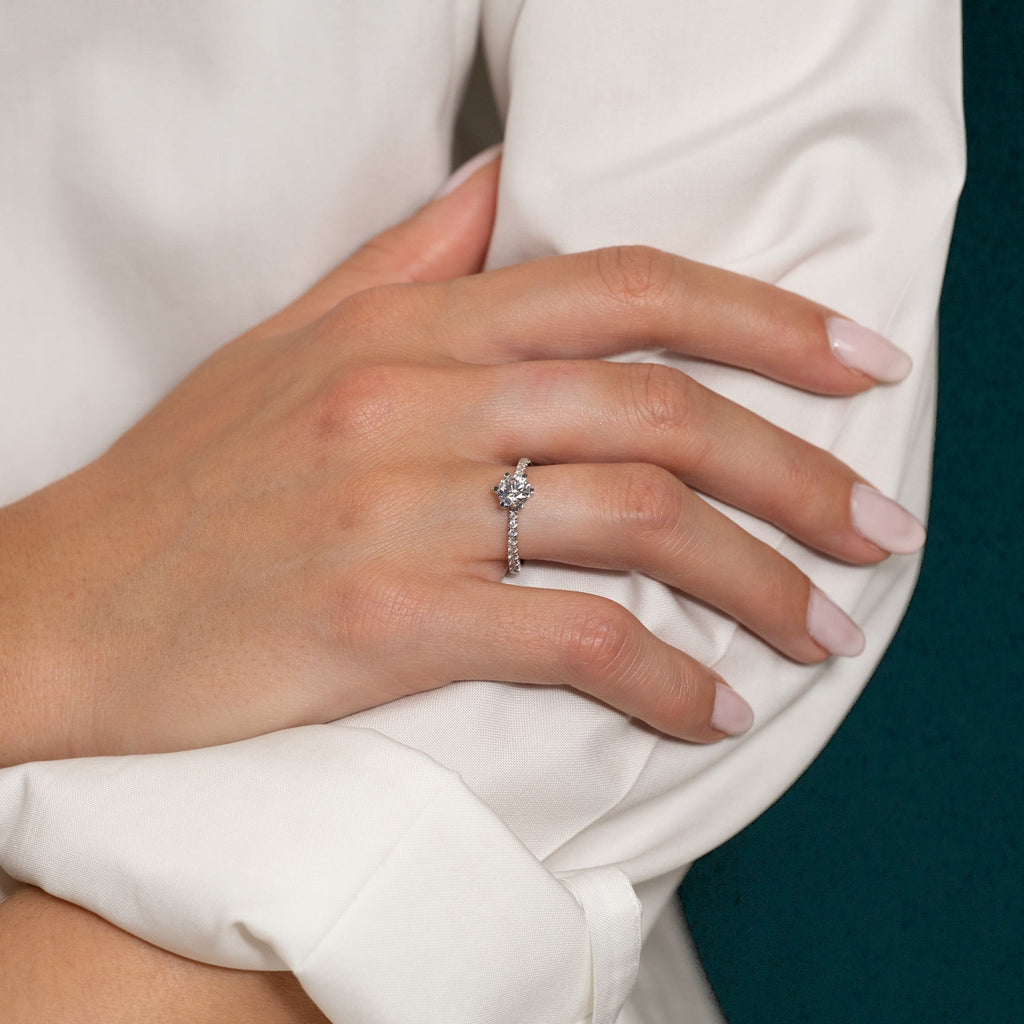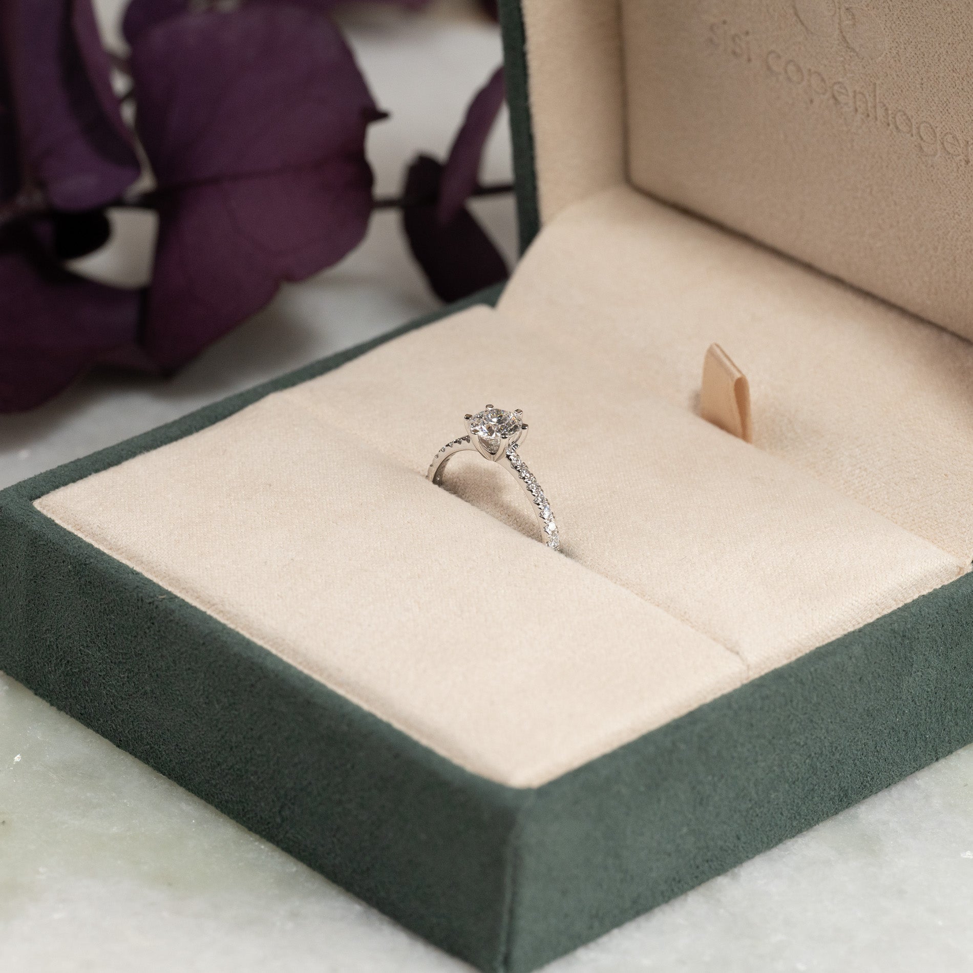 Ringen er i 14 karat massivt hvitt gull med laboratoriedyrkede diamanter på totalt 0,9 ct. Diamantene har fargen E/F (River) og klarheten VVS. Smykket er laget med omhu; diamantene er produsert med blant annet solenergi, og gullet er 100% sertifisert resirkulert.