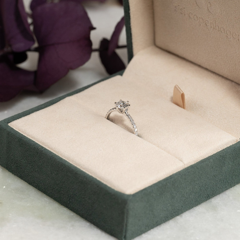 Ringen har et klassisk, elegant og feminint design som også gjør ringen egnet som forlovelsesring.