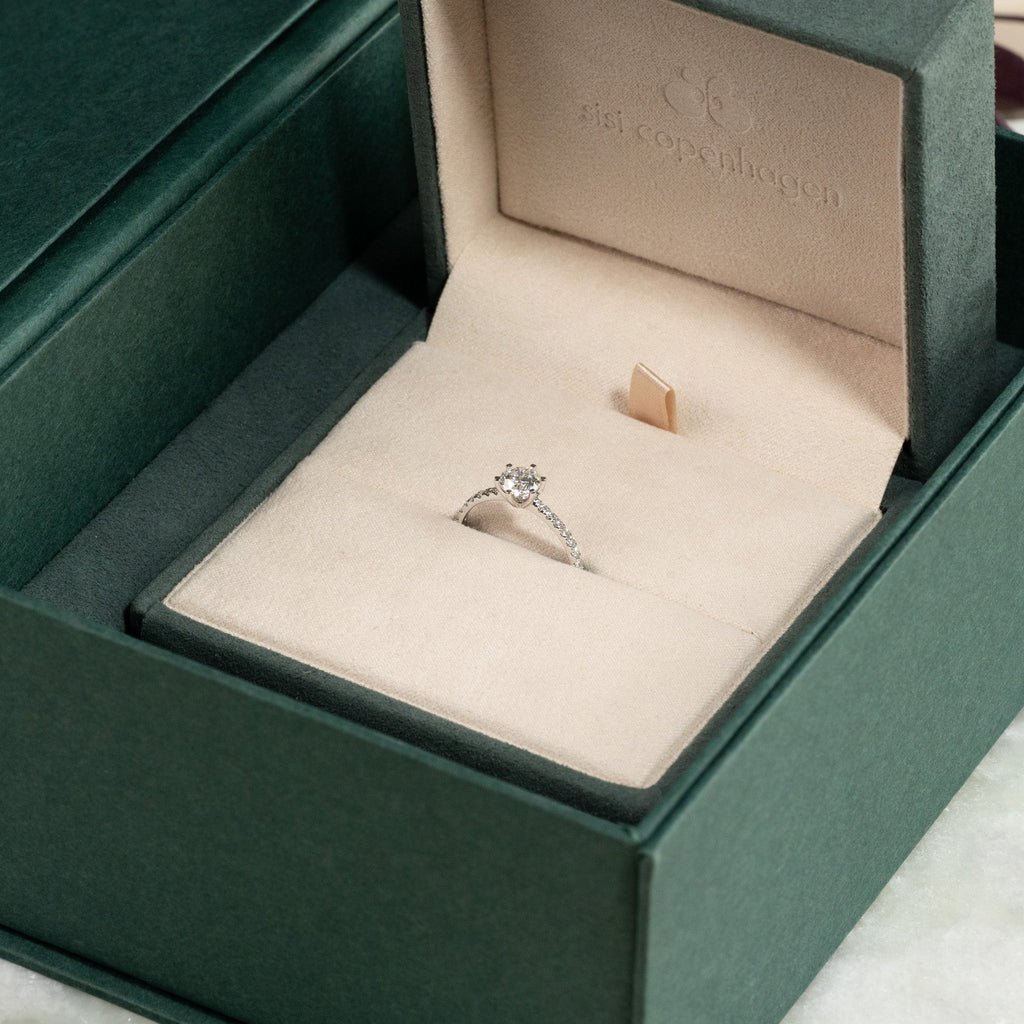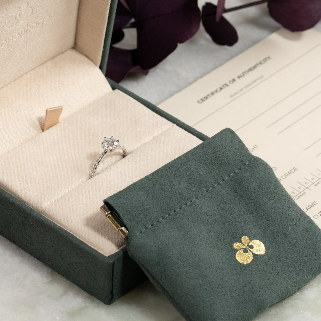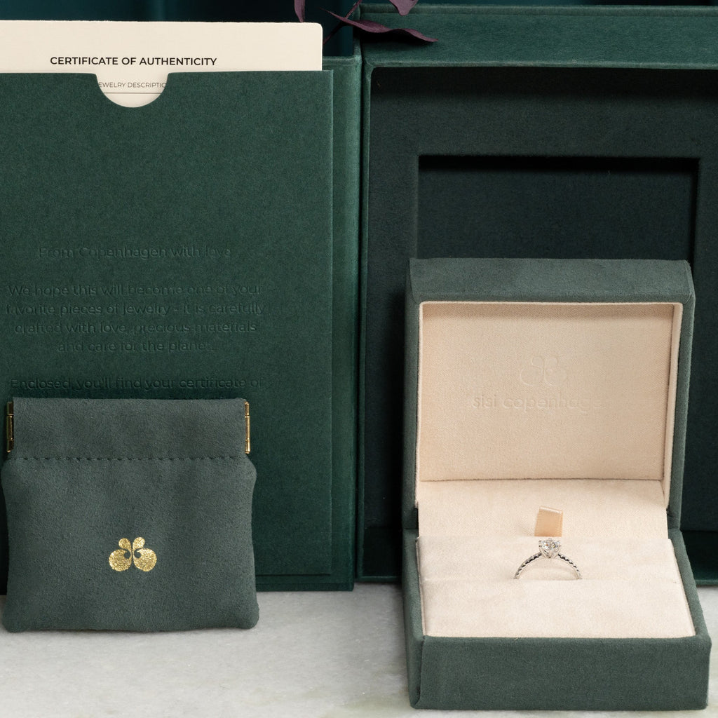 Smykkene kommer i vår eksklusive Diamond Collection-boks. I boksen er det smykkeeske, diamant-sertifikat og pouch.